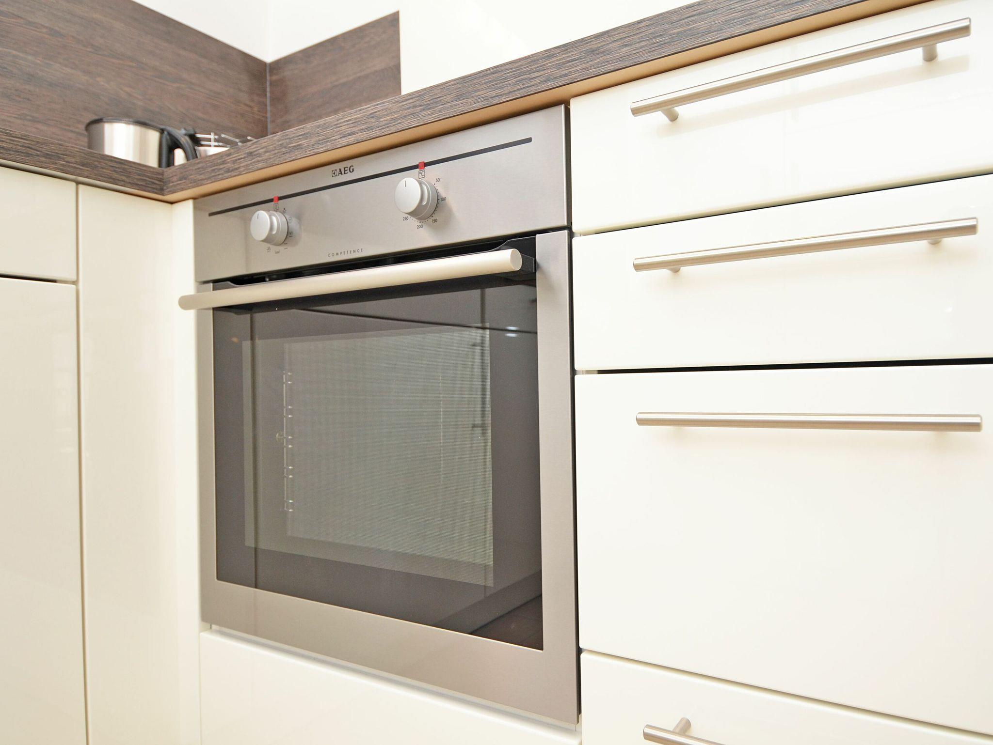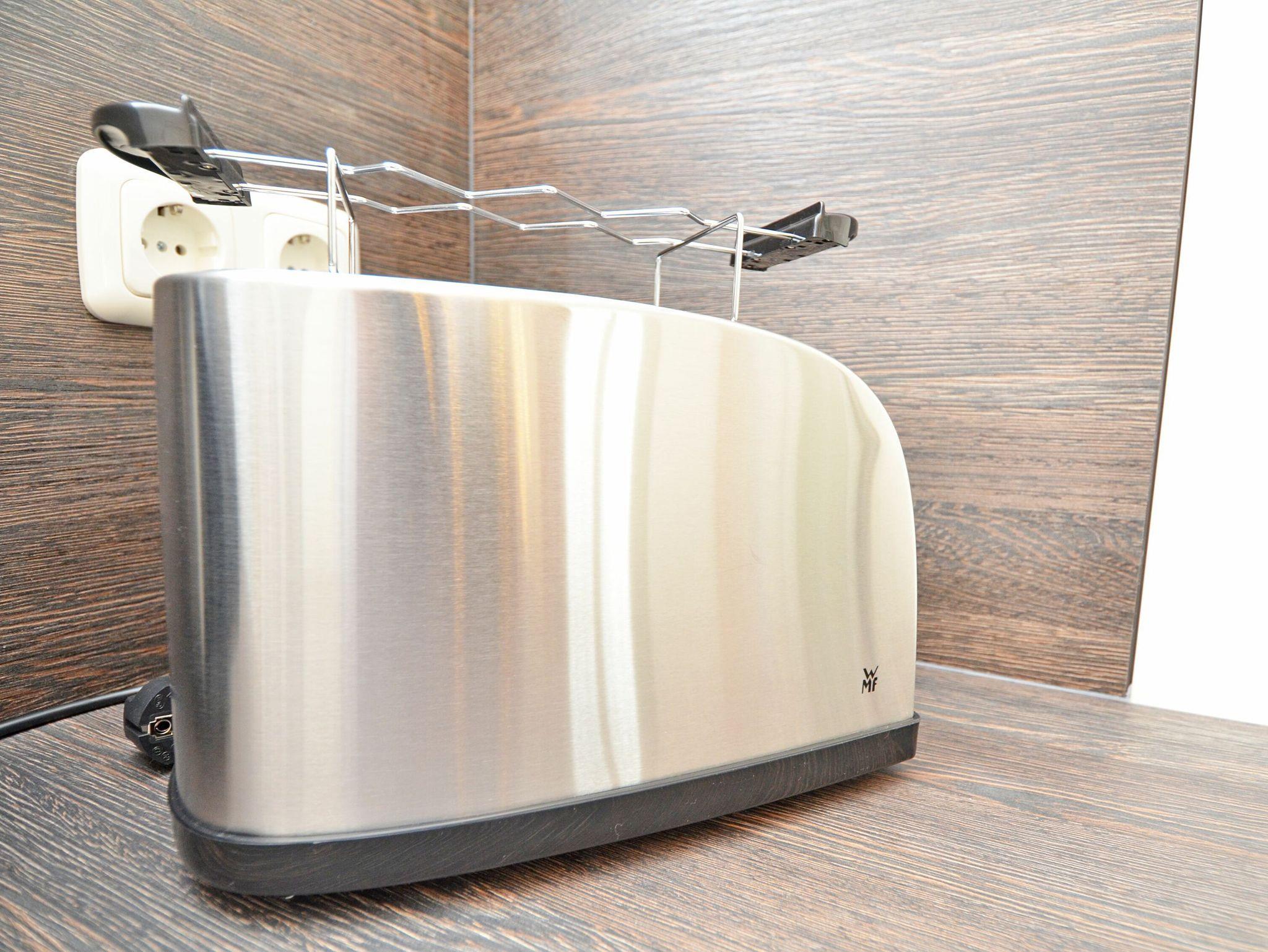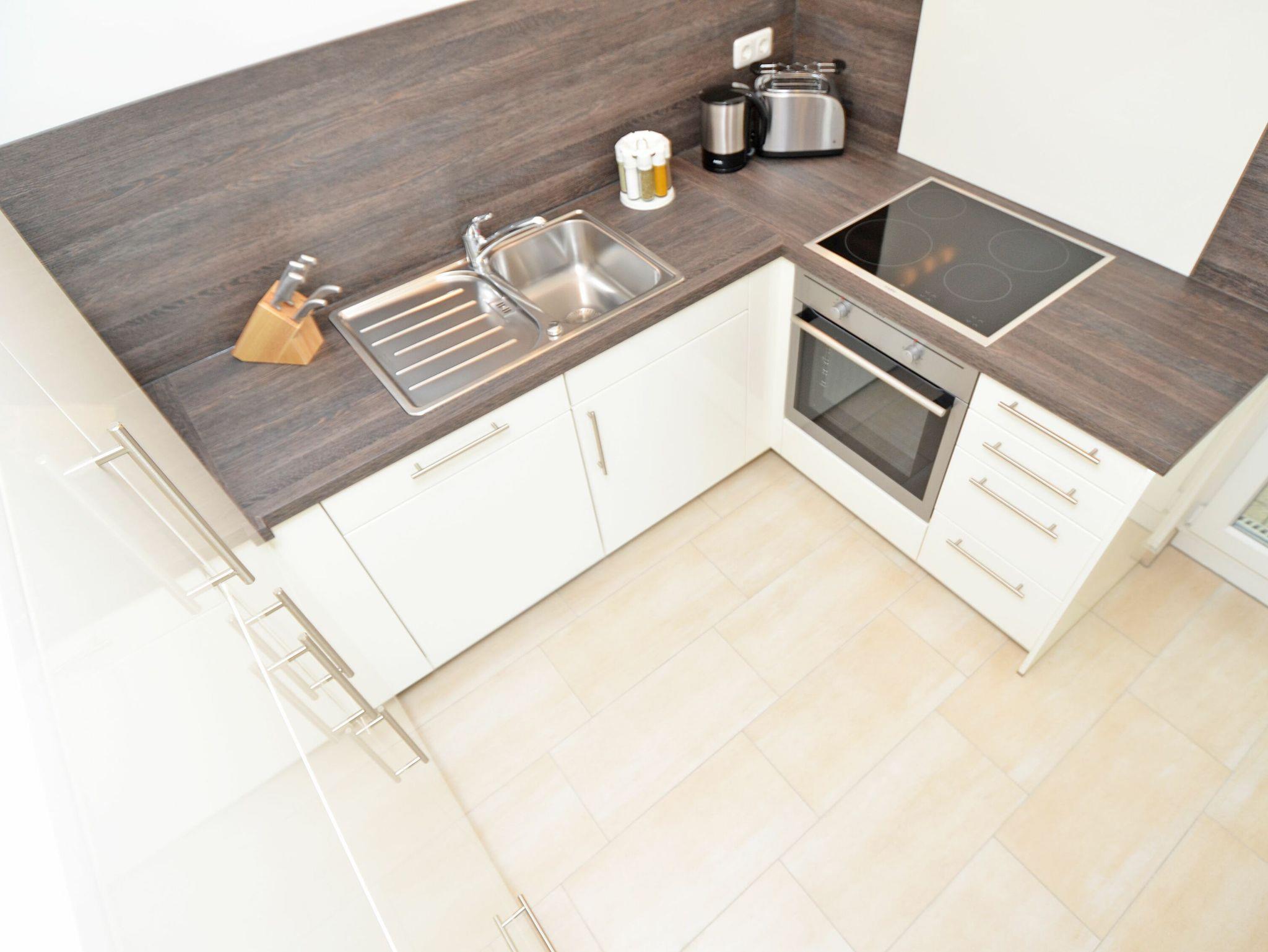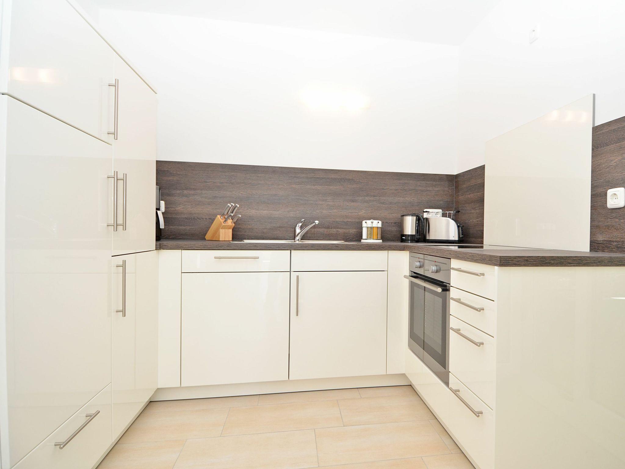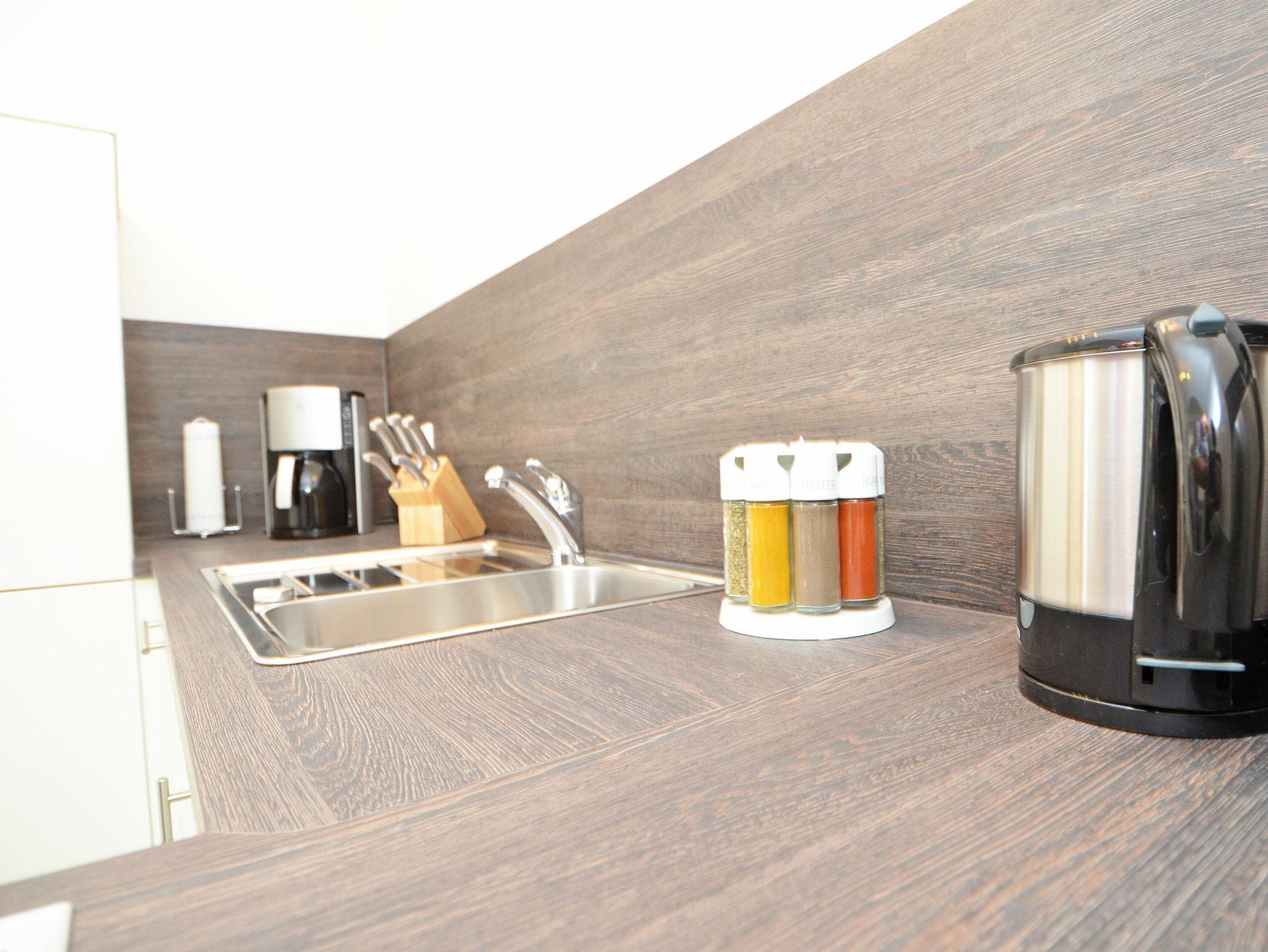 Die optisch vom Wohnbereich getrennte, offene Küche in U-Form lässt mit ihrer hochwertigen Ausstattung mit einem 4-Zonen-Cerankochfeld mit Dunstabzugshaube, einem Backofen, einem Kühlschrank mit Gefrierfach, einer Spülmaschine, Kaffeemaschine, Toaster, Eierkocher, Raclette mit heißem Stein und diversem Kleininventar keine Wünsche offen. Auch von diesem Raum aus gibt es einen direkten Zugang auf eine der beiden Dachterrassen.