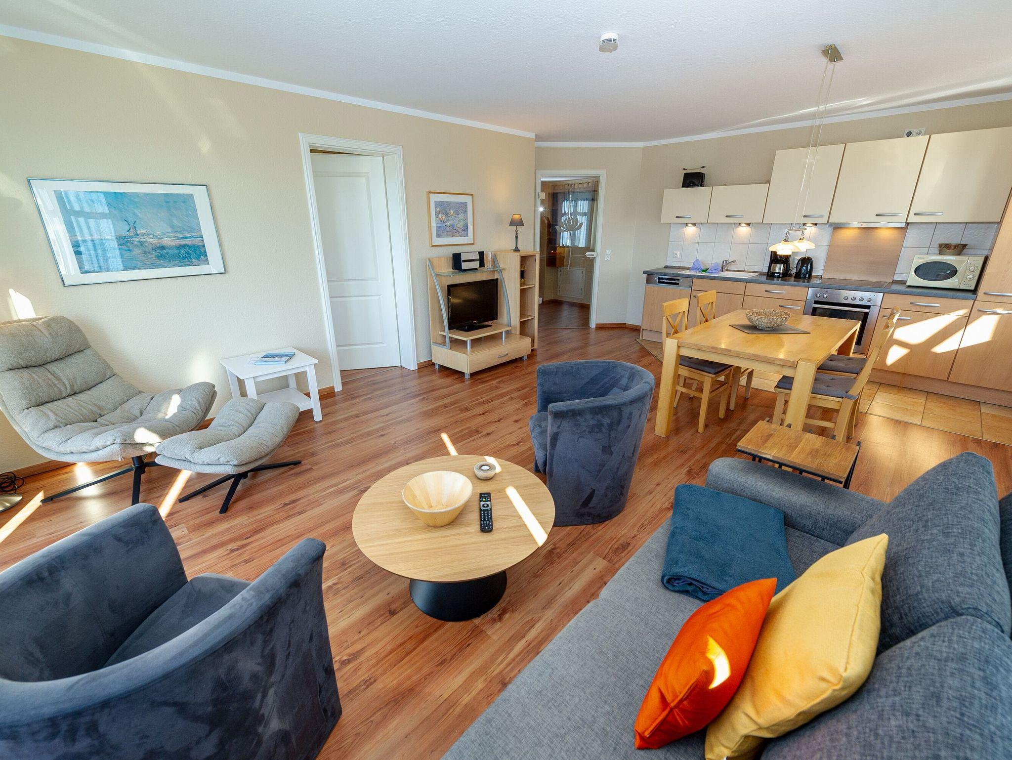 Der helle, freundliche Wohnraum ist mit einer bequemen Lederschlafcouch (die als Aufbettung für 2 Personen genutzt werden kann), 1 Sessel, 2 Korbsesseln, einem Flachbild-TV, einer Mini-Stereoanlage mit CD-Player und einem Esstisch eingerichtet. Die harmonisch in den Wohnbereich integrierte Küchenzeile ist ausgestattet mit einem Kühlschrank mit Gefrierfach, einem 4-Platten-Cerankochfeld, einem Backofen, einer Geschirrspülmaschine, einer Mikrowelle, Wasserkocher, Kaffeemaschine, Toaster und diversem Kleininventar, das die Küchenausstattung komplettiert.