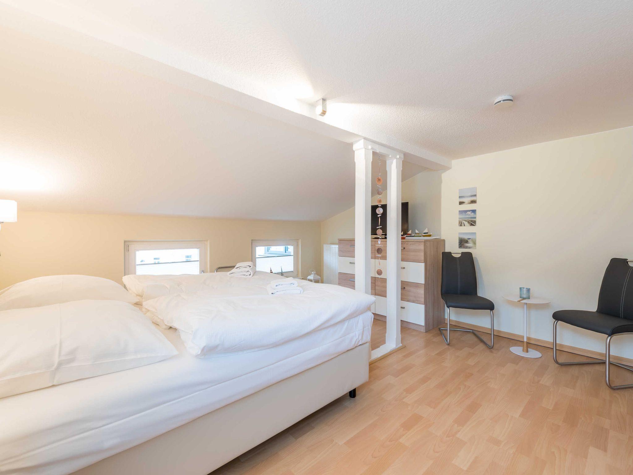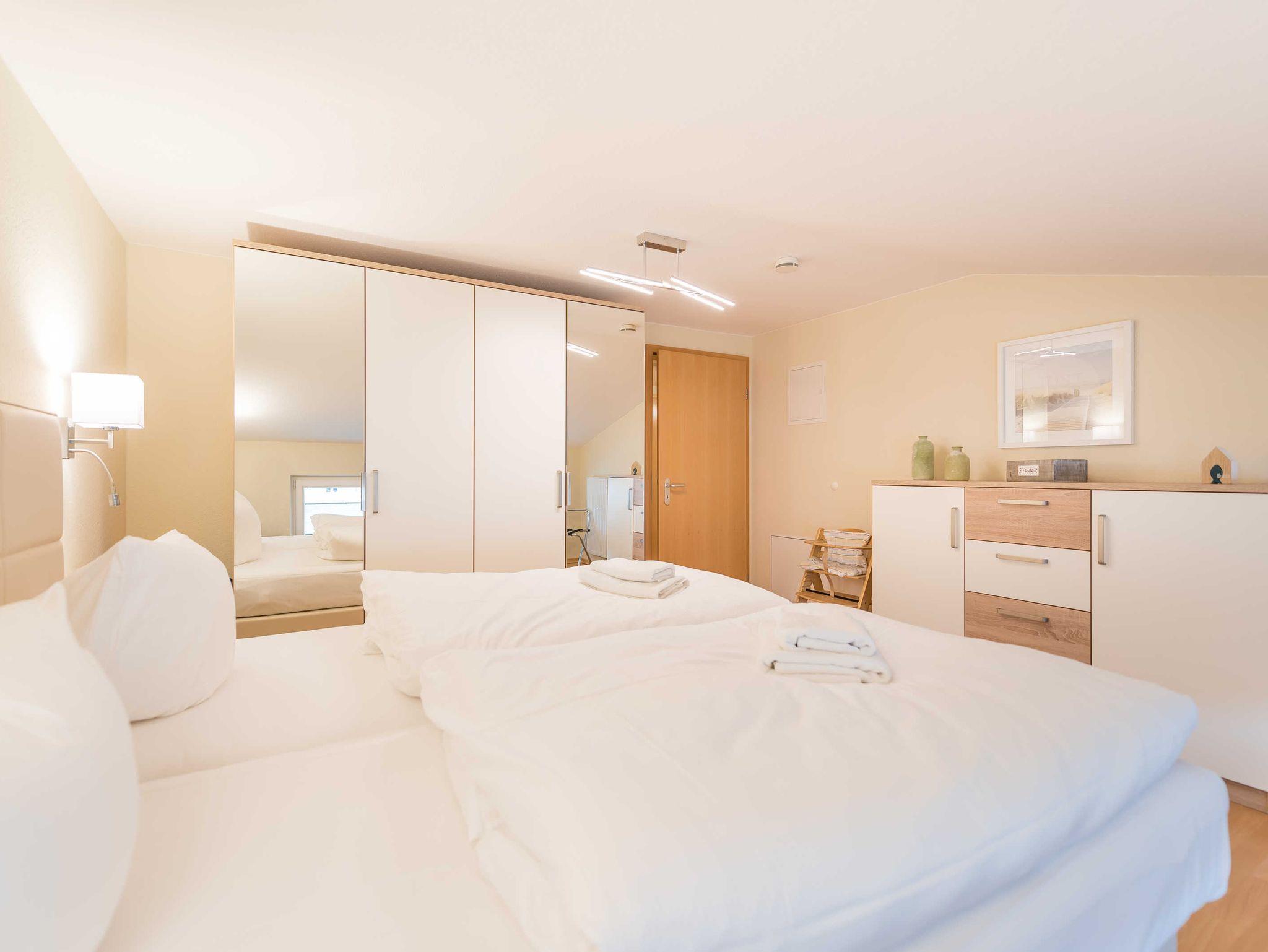 Das Appartement 7 in der 2. Etage, das Penthaus, bietet Ihnen auf ca. 75 qm ein wundervolles Feriendomizil. Es verfügt über 2 Schlafzimmer (jeweils mit einem Doppelbett 1,80 m x 2,00 m). Eines ist sogar mit einem Fernseher ausgestattet.