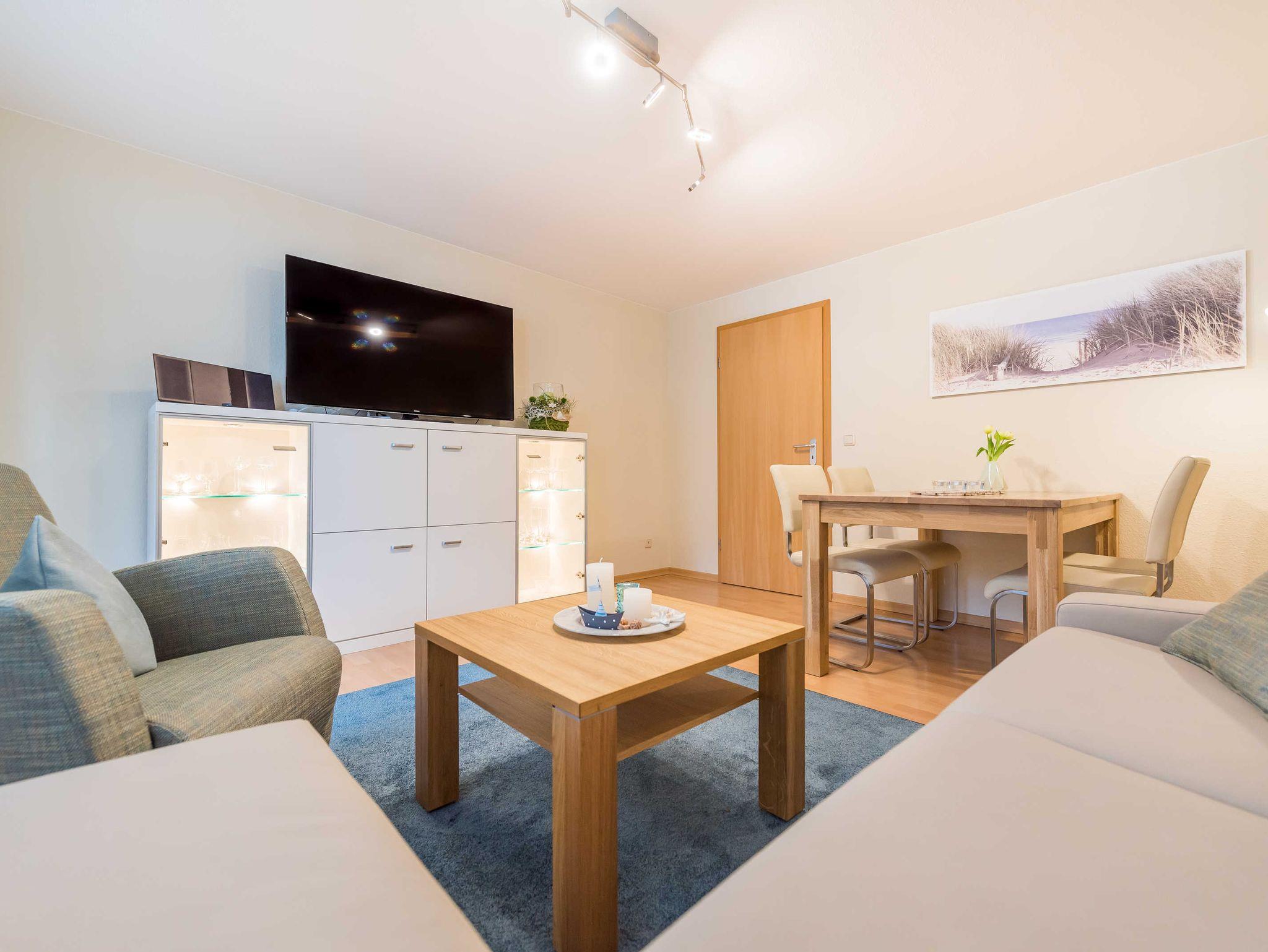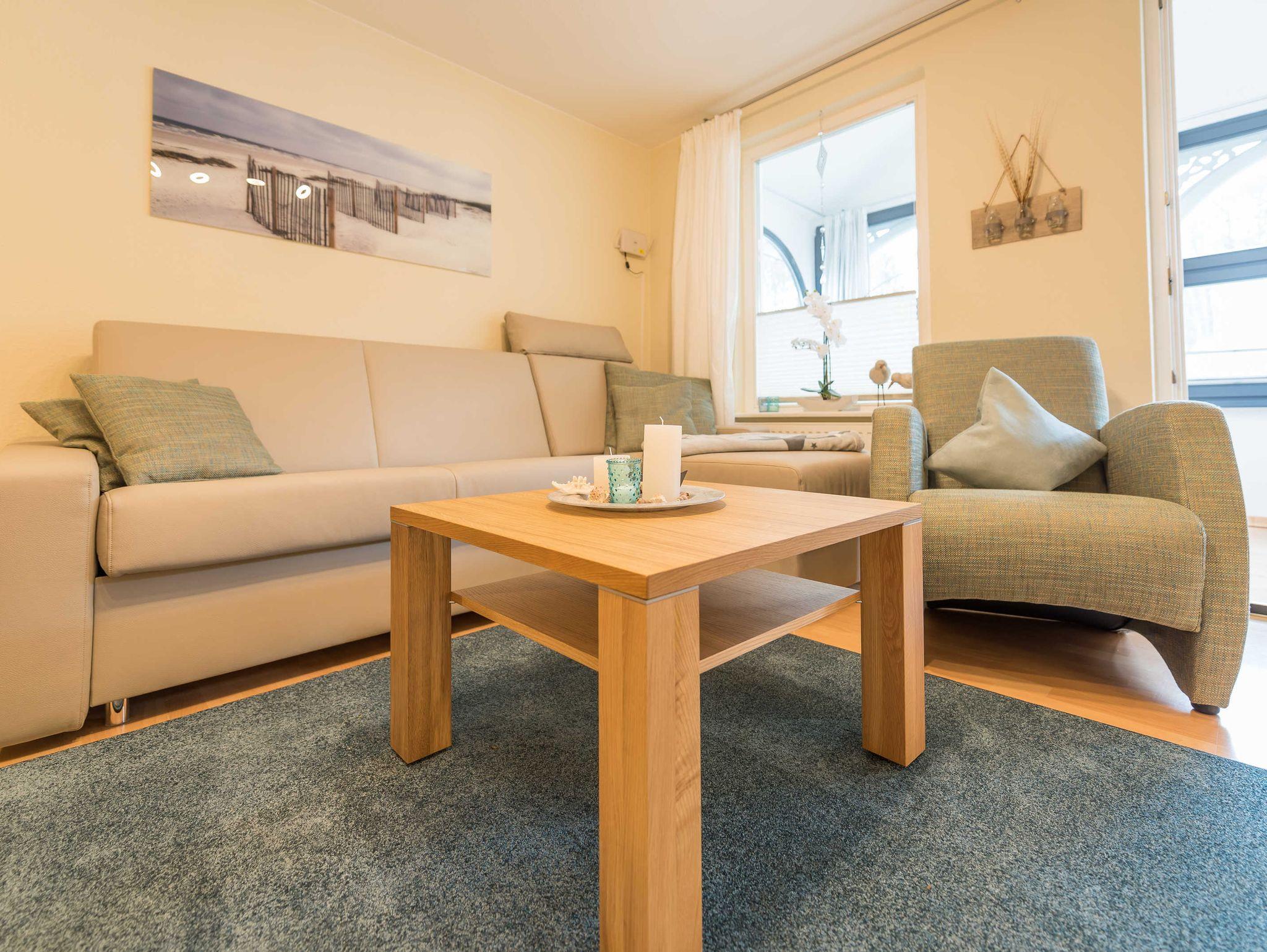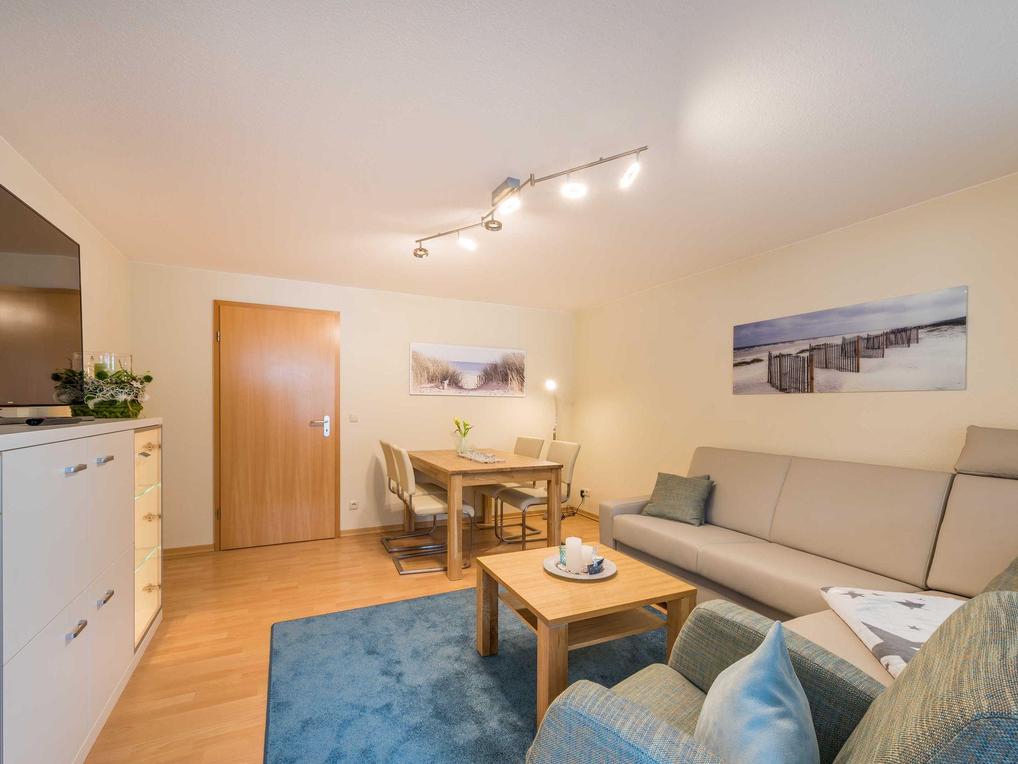 Im gemütlichen Wohnbereich gibt es einen internetfähigen Fernseher sowie einen CD-Player mit Radio. WLAN ist inklusive. Bei Anreise mit einer 5./6. Person, vorzugsweise Kinder, kann die Couch im Wohnbereich zu einem bequemen Bett umgewandelt werden (Liegefläche 1,40 m x 2,00 m). Ein heller Essplatz befindet sich ebenfalls hier und lädt zum gemeinsamen Speisen oder zum geselligen Zusammensein ein.
