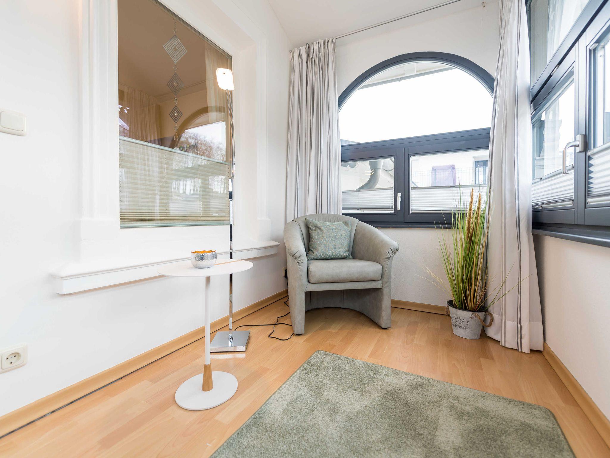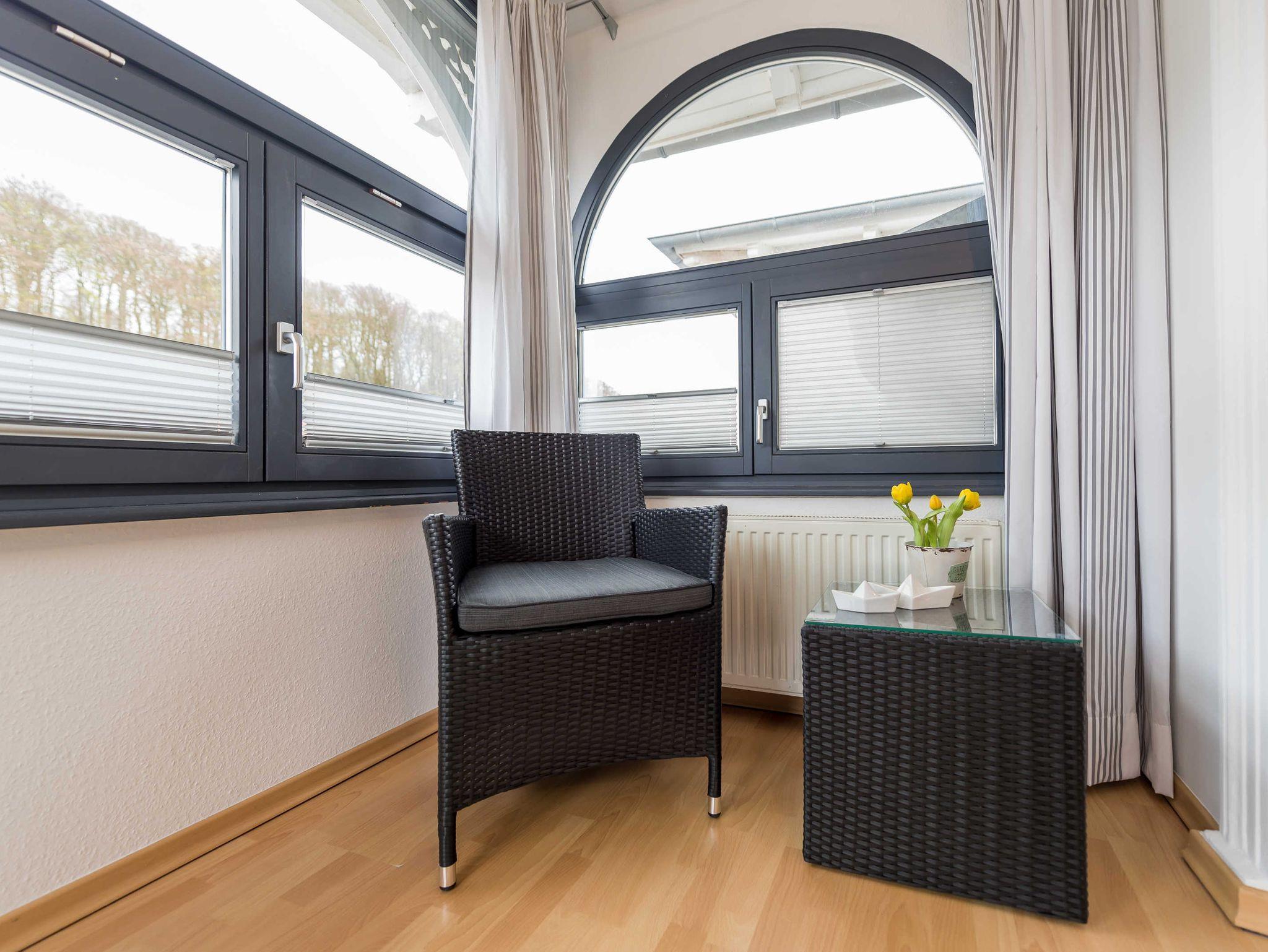Vom schicken Wohnbereich aus gelangt der Gast in den vorgelagerten und verglasten Wintergarten, der einen traumhaften Blick auf die pittoreske Promenade der Wilhelmstrasse bietet. Es sind Vorhänge als Sonnenschutz vorhanden. Genießen Sie Ihre Urlaubszeit in der wundervollen Atmosphäre des Wintergartens mit seinen gemütlichen Sitzmöbeln. Die Fenster lassen sich alle öffnen und zu jeder Jahreszeit spürt man hier besonders den Charme des Wohnens in einer Urlaubsvilla aus den Anfängen des letzten Jahrhunderts.