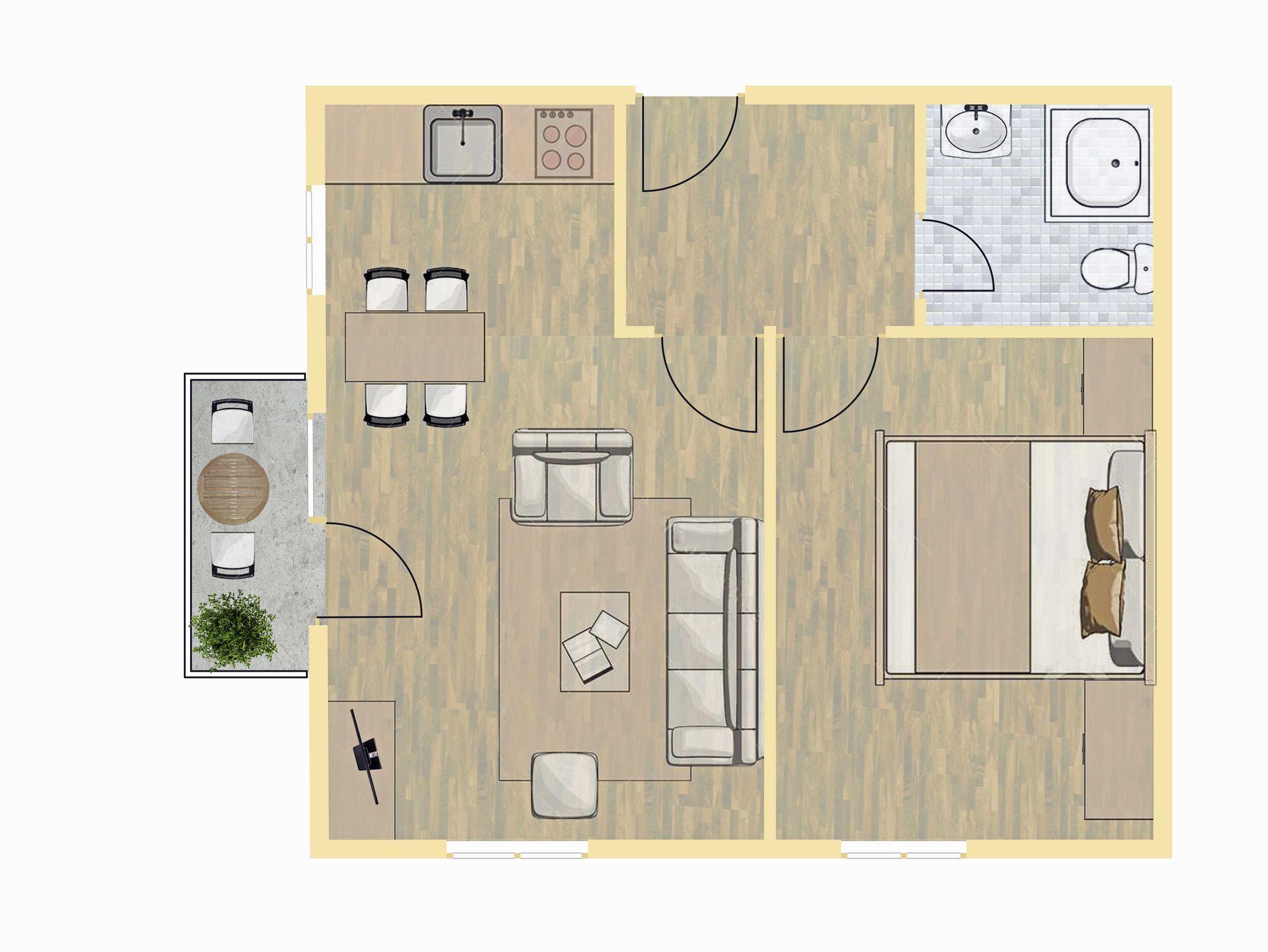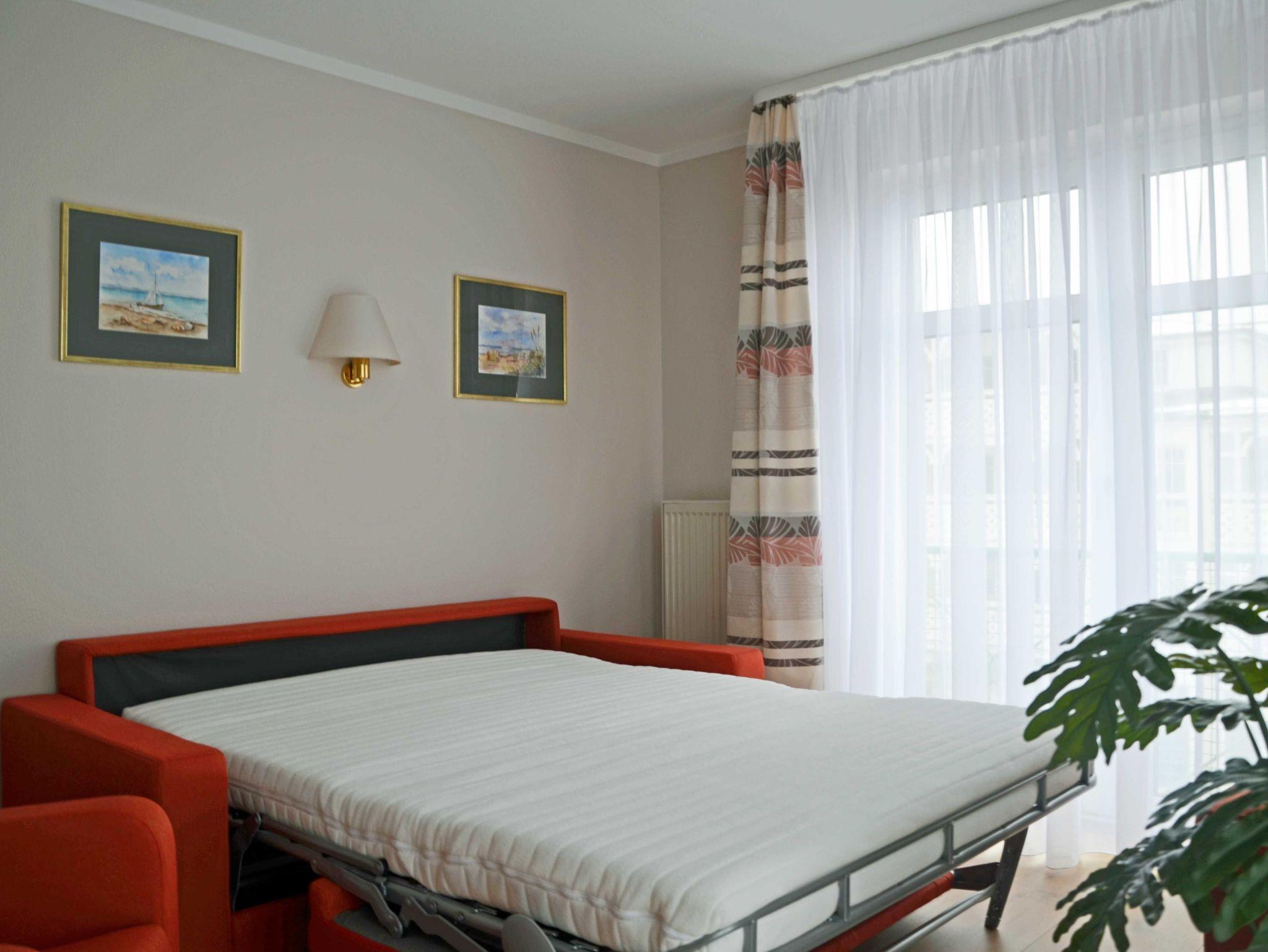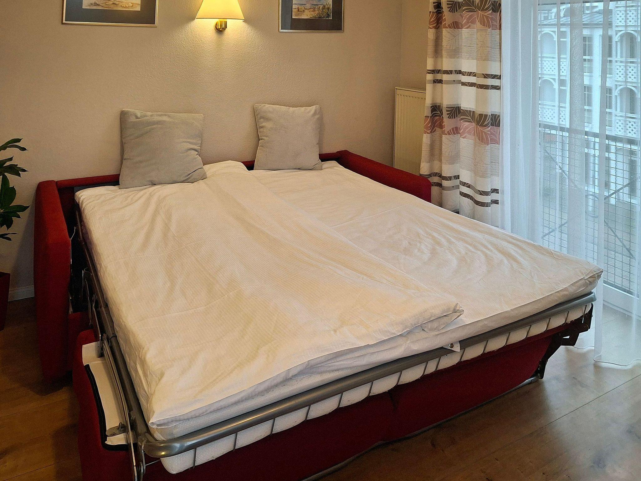 Im Wohn-/Schlafraum können 2 weitere Personen auf unserer neuen, bequemen Doppelbettcouch schlafen.