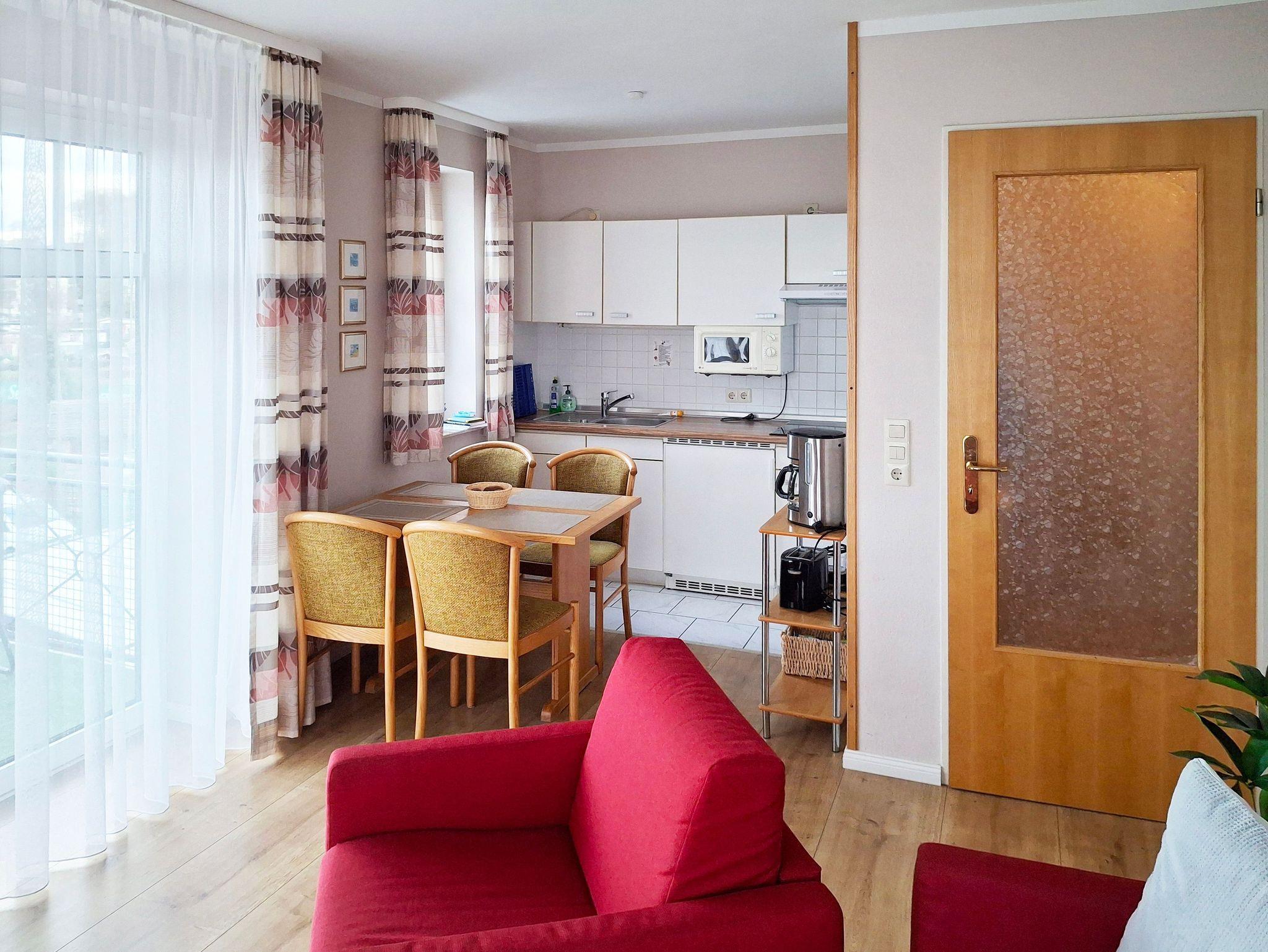 Angrenzend befindet sich der Küchen- und Essbereich mit Esstisch, 4 Stühlen und einer Küchenzeile.