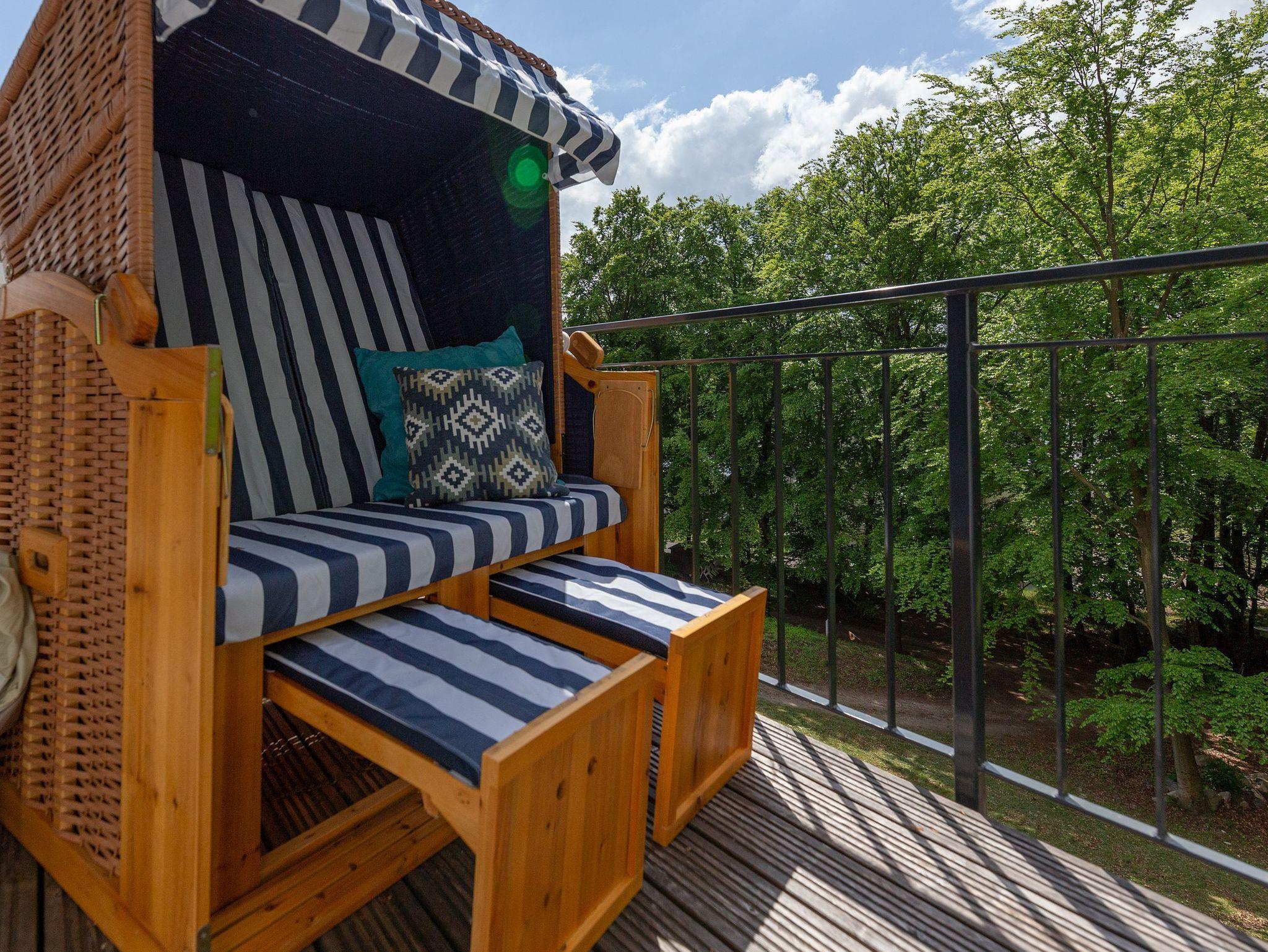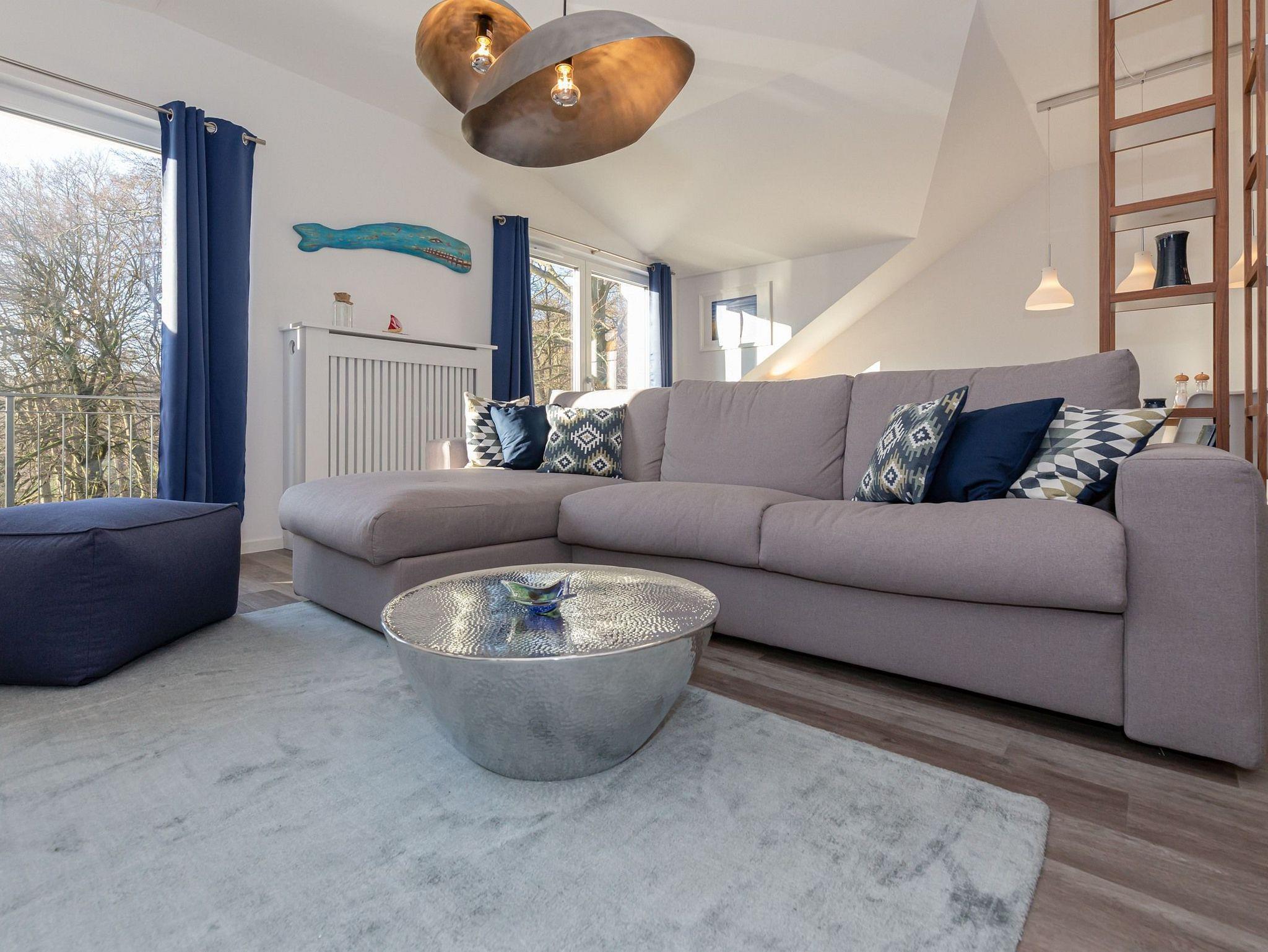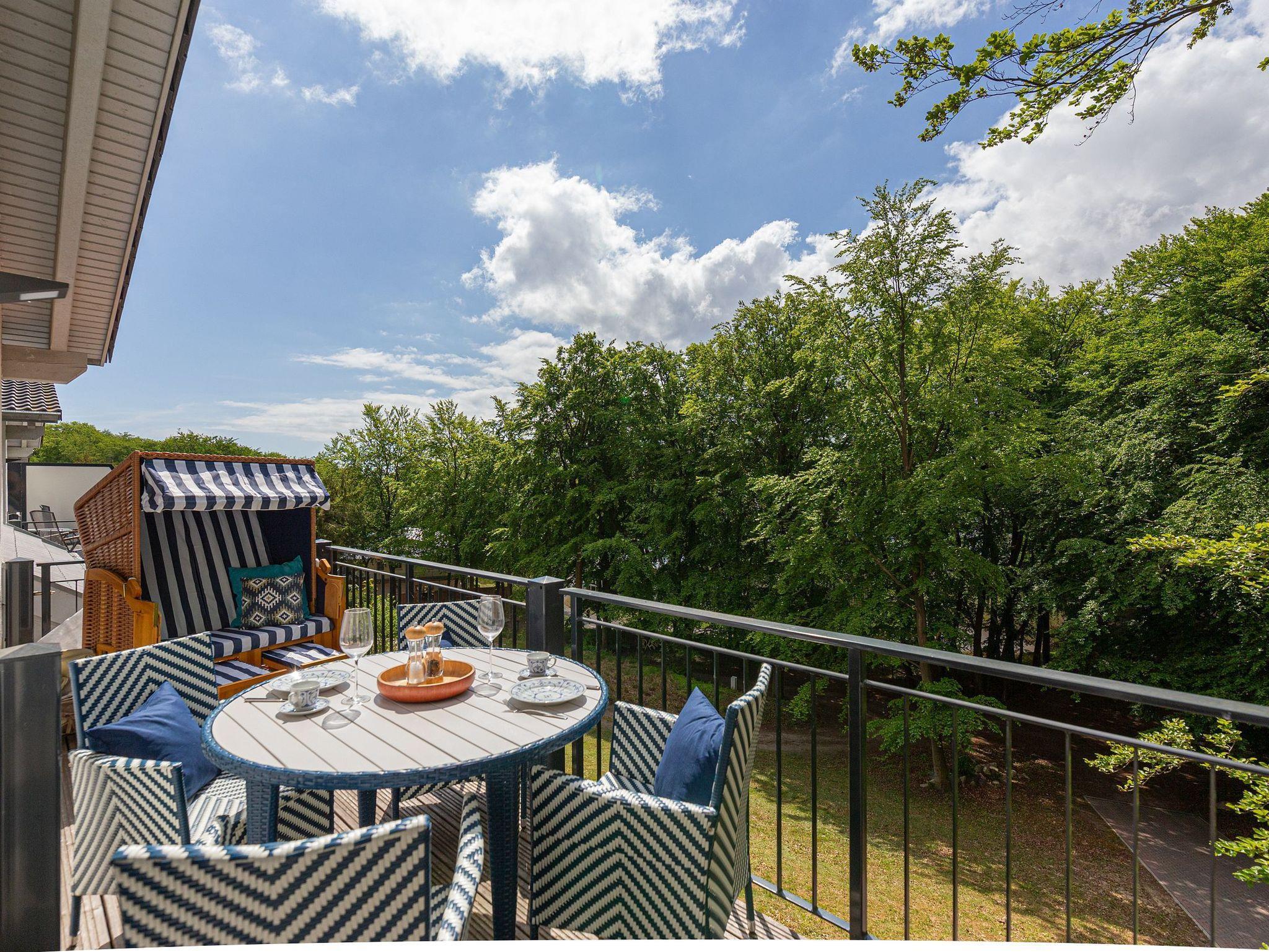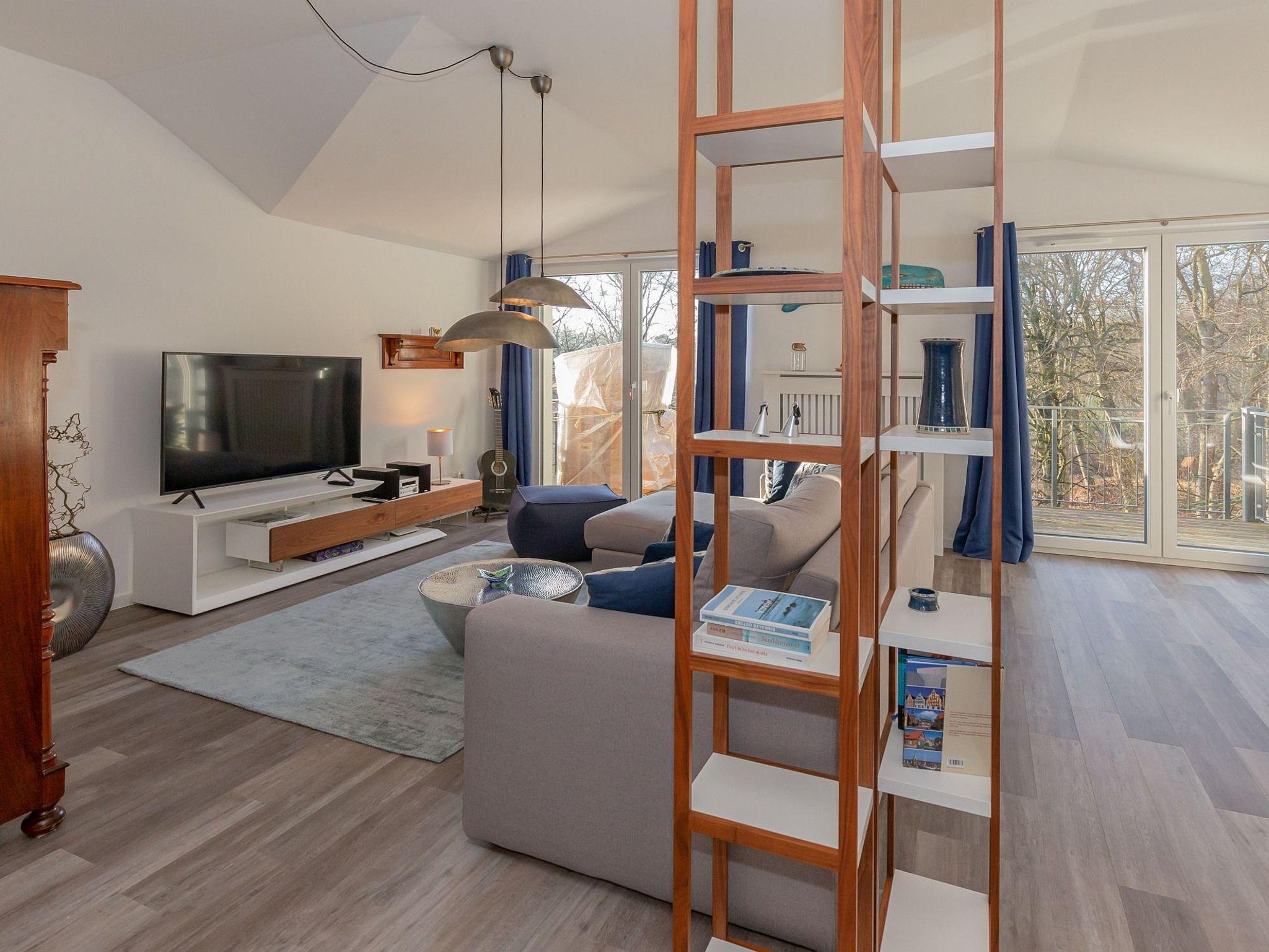 Die Ferienwohnung Waldloft in Sellin bietet Komfort, Designermöbel, Balkonblick und Sauna für erholsame Urlaubstage.