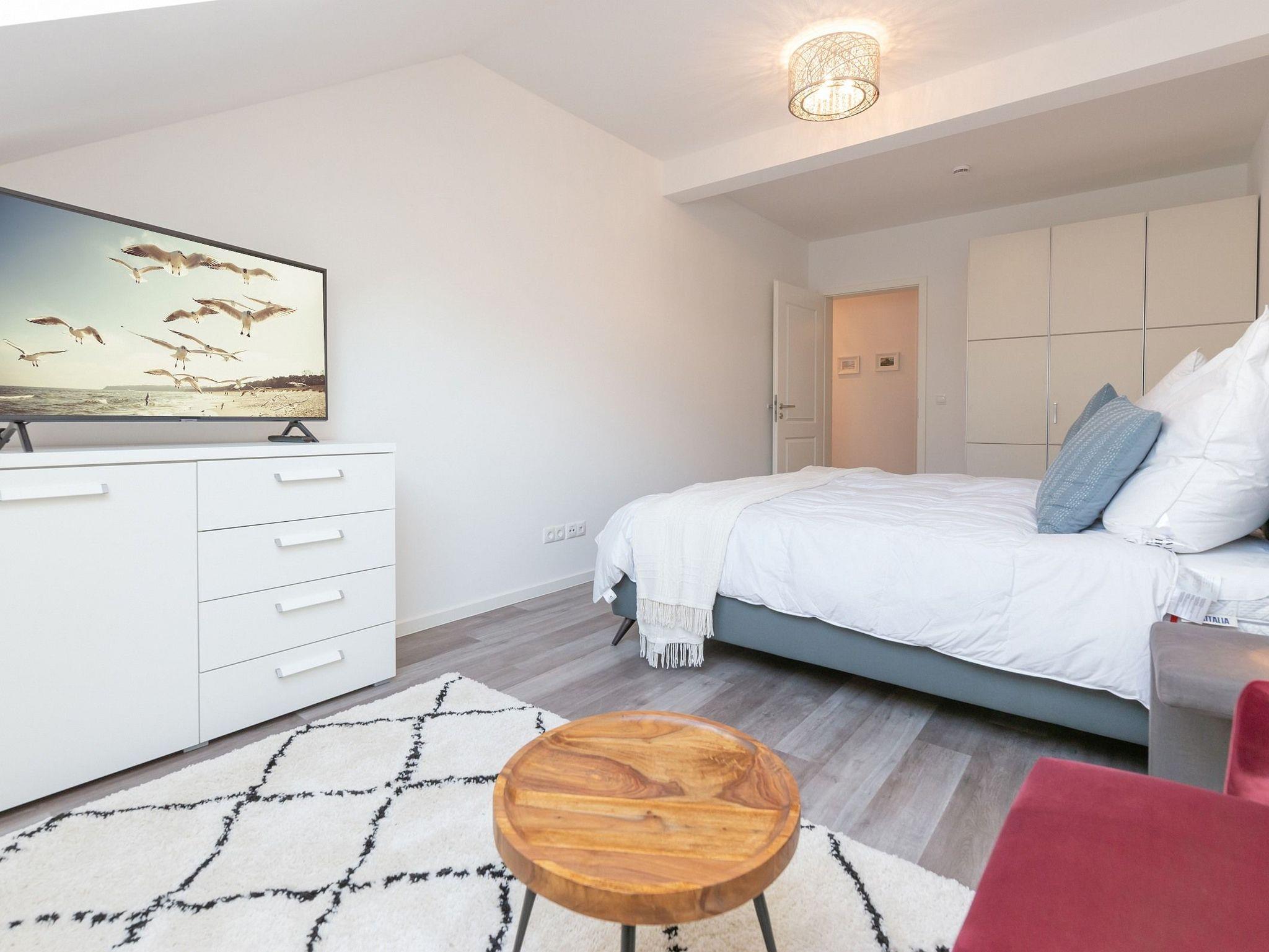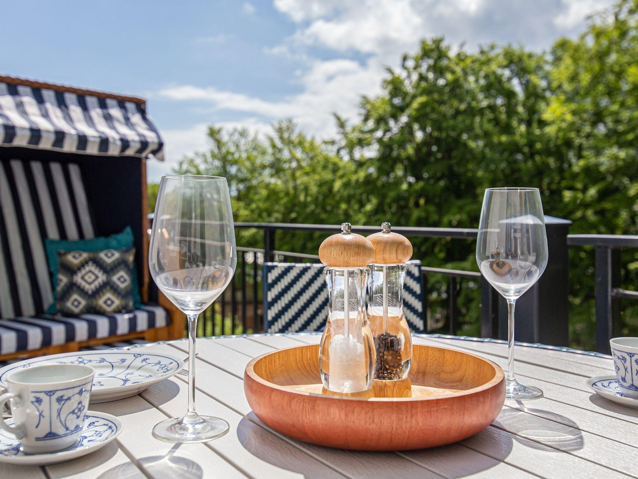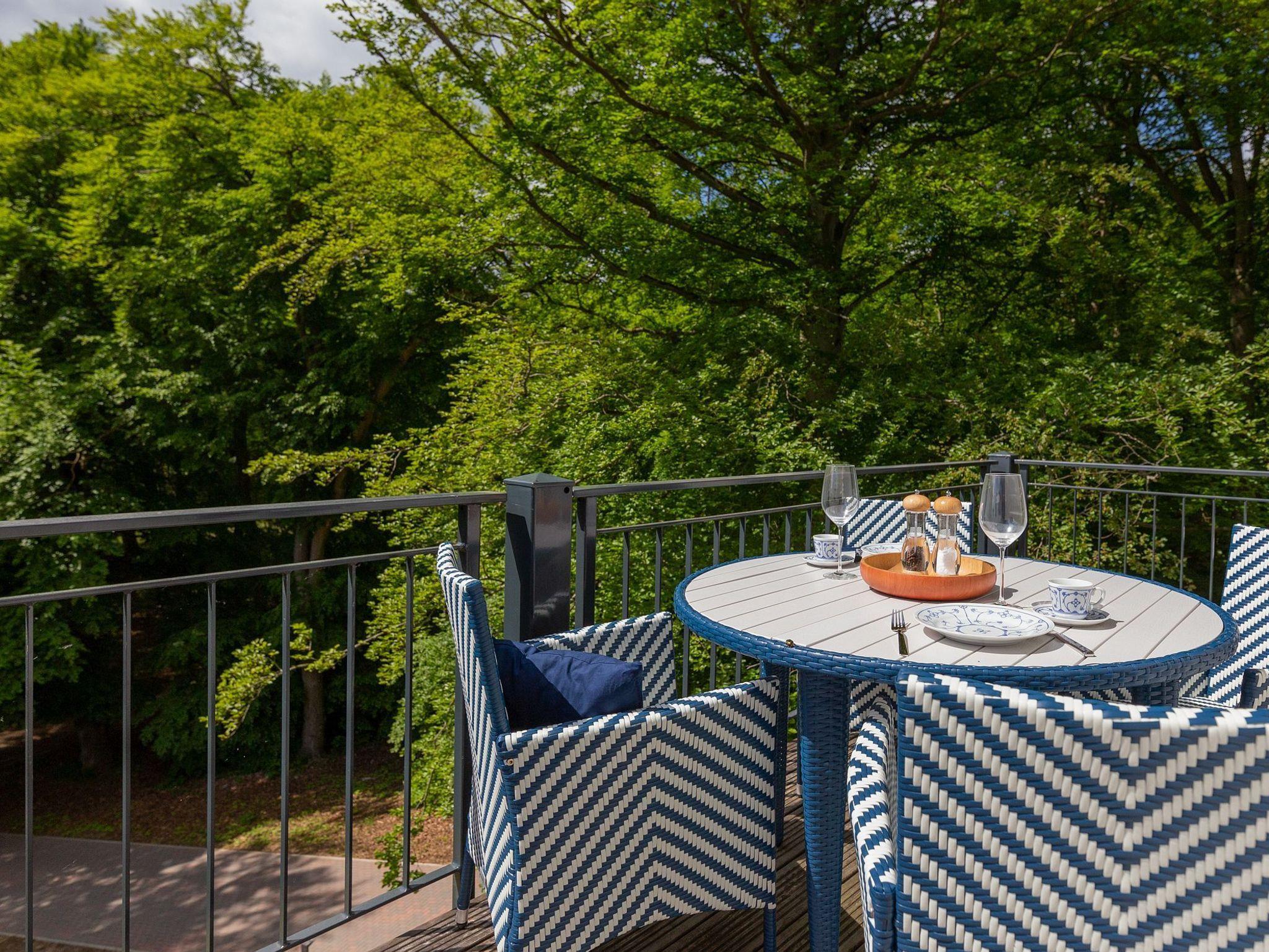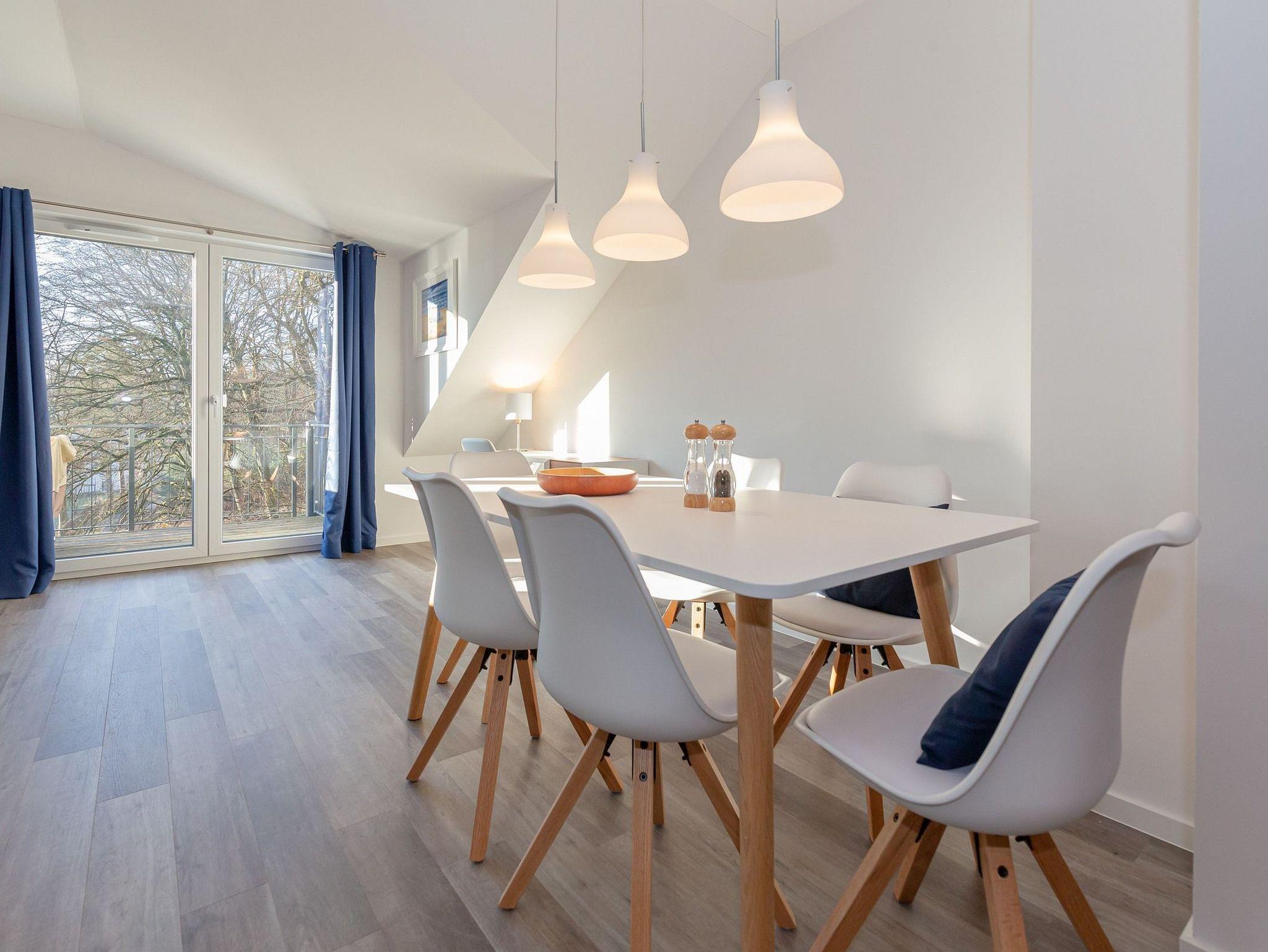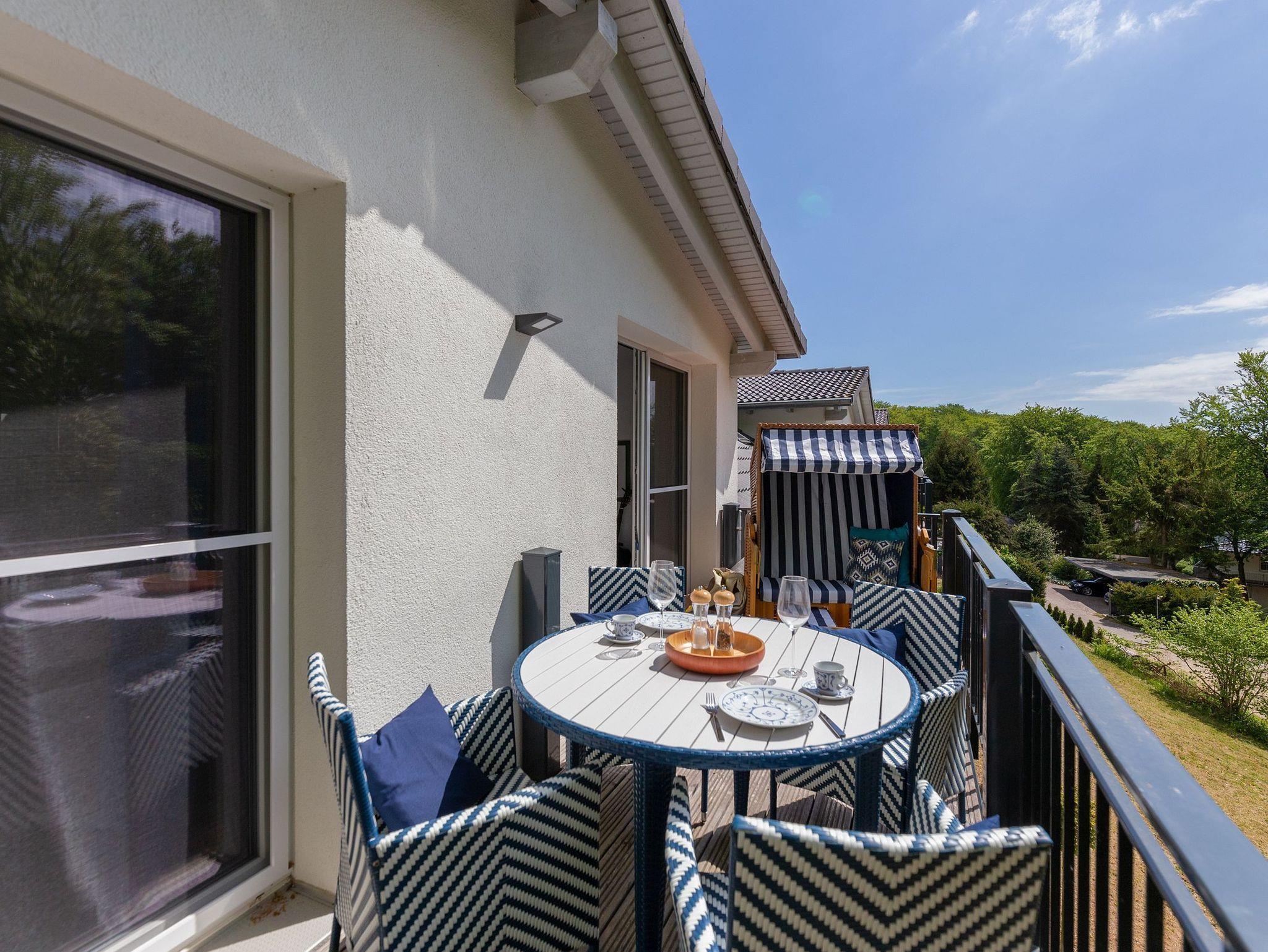 Die Ferienwohnung Waldloft in Sellin bietet Komfort, Designermöbel, Balkonblick und Sauna für erholsame Urlaubstage.