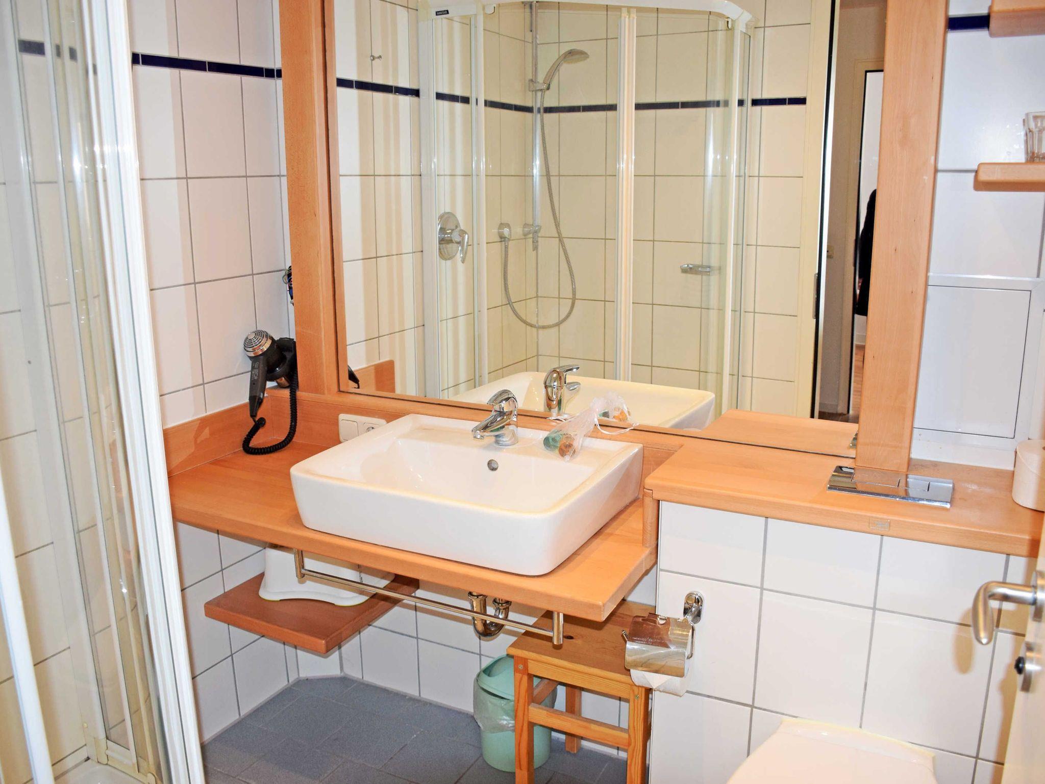 Das moderne Bad ist mit Dusche, WC und Waschtisch sowie Fön ausgestattet.