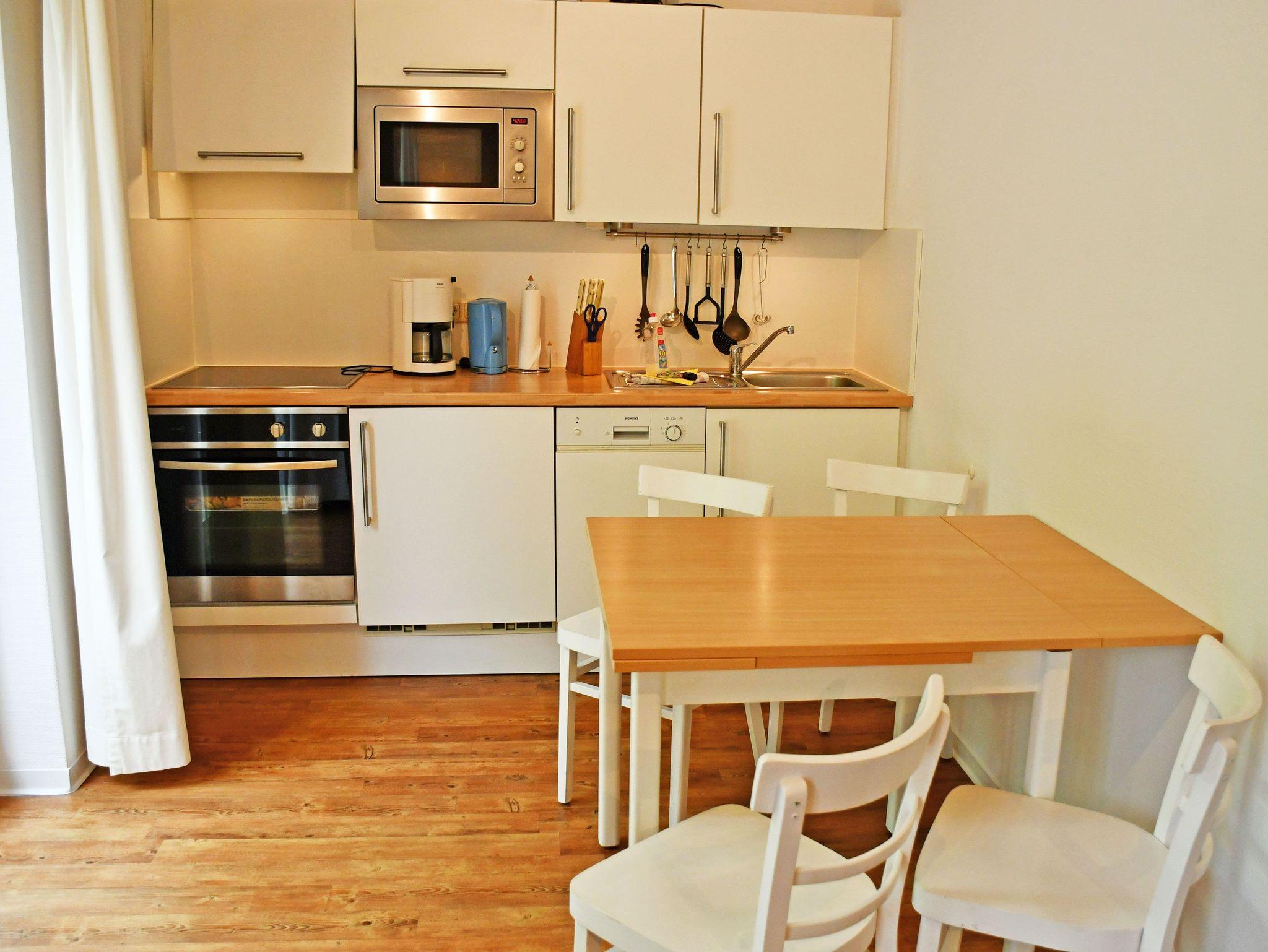 Die moderne Küchenzeile ist exklusiv ausgestattet mit Cerankochfeld, Abzugshaube, Backofen, Mikrowelle, Geschirrspülmaschine, Wasserkocher, Kaffeemaschine, Toaster und umfangreichen weiteren Küchenutensilien.