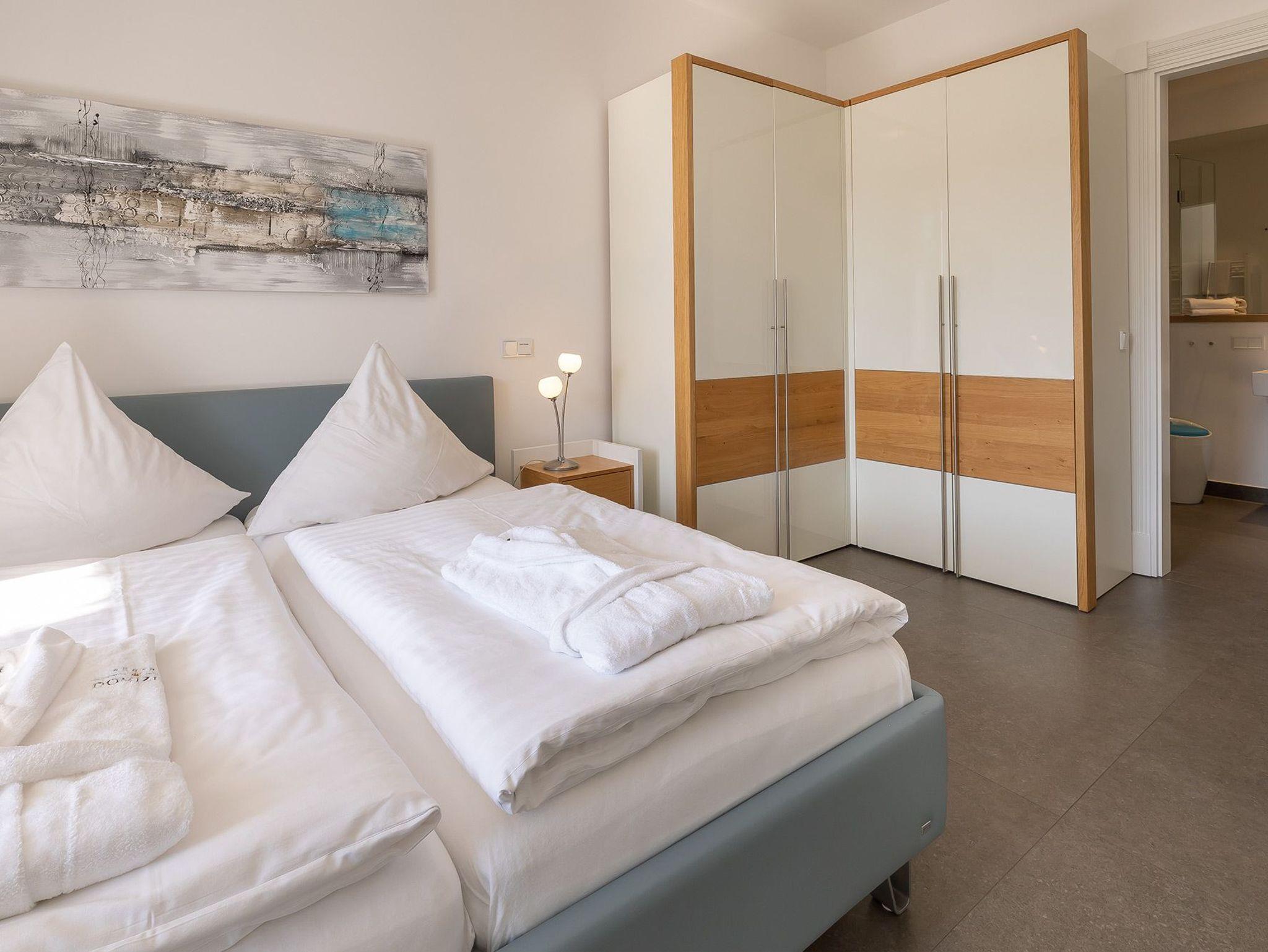 Die Ferienwohnung „Meereskristall“ befindet sich in der dritten Etage und wird bequem über den Lift aus der Tiefgarage erreicht. Auf 74m2 Wohnfläche bietet sie ausreichend Platz für 4 Personen. Die hochwertige Ausstattung lässt keine Wünsche offen. So finden Sie, unter anderem, eine hochwertige Einbauküche mit angrenzendem Wohnbereich vor, welcher durch die großen Fensterfronten mit Licht nahezu durchflutet wird. Hochwertige und ausgesuchte Materialien unterstützen den hochwertigen Wohneindruck zusätzlich. Auf dem Dach des „FIRST SELLIN“ stehen Ihnen sowohl ein großzügiger Sky-Pool, als auch eine Saunalandschaft zur Verfügung. Der Blick von dort auf die Ostsee lässt Ihren Urlaub zu einem wahrlichen Traumurlaub werden.In der Sommersaison können Sie darüber hinaus im hauseigenen Außenpool (solar beheizt) relaxen oder sich natürlich in die Fluten der Ostsee am Strand stürzen.
