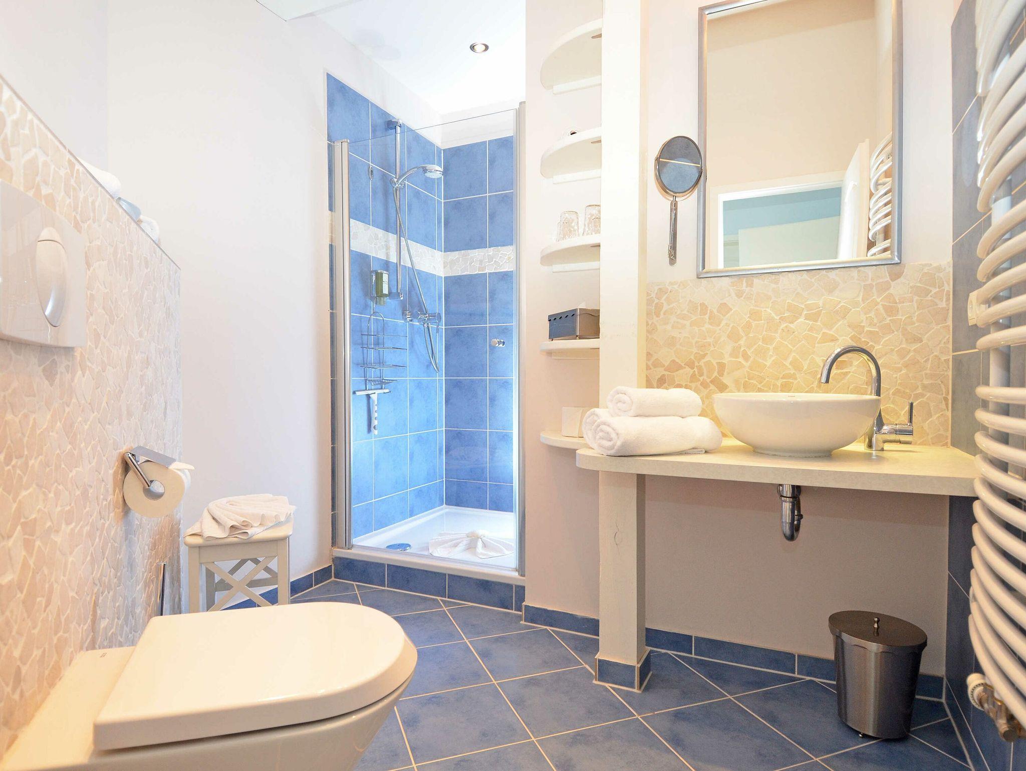 Natürlich steht Ihnen in dieser traumhaften Fewo auch ein modernes Duschbad mit WC, Waschbecken, Handtuchheizung, und Fußbodenheizung zur Verfügung.