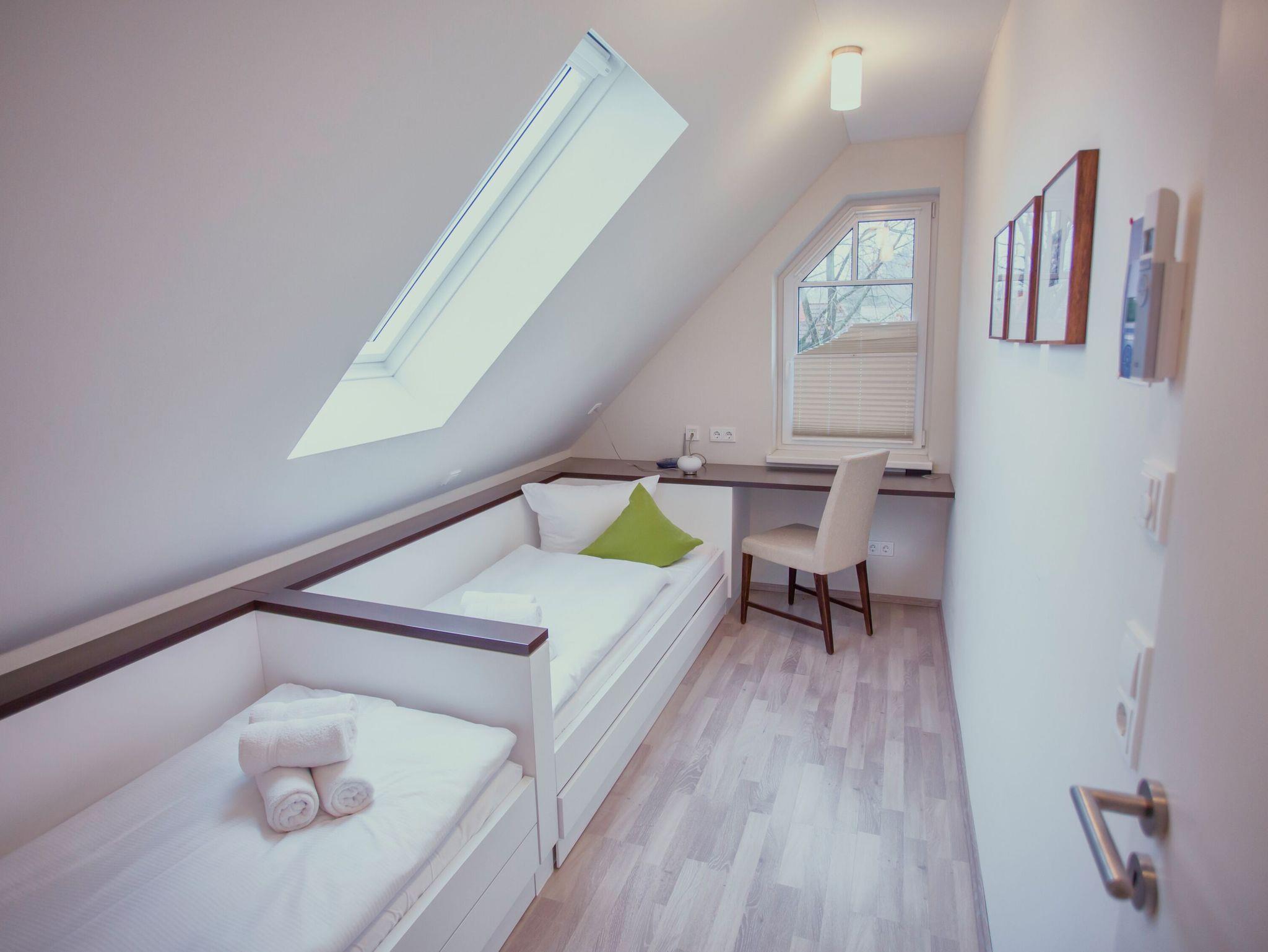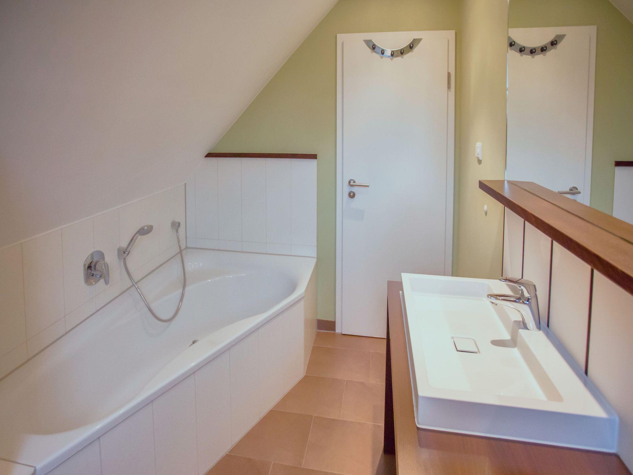 Im Obergeschoss befinden sich ein Schlafzimmer mit einem Doppelbett, ein weiteres Schlafzimmer mit 2 Einzelbetten sowie das zweite Badezimmer, ausgestattet mit Dusche/WC, Badewanne, Waschtisch und beheizbarem Handtuchtrockner. Leichte Dachschrägen vermitteln Gemütlichkeit.