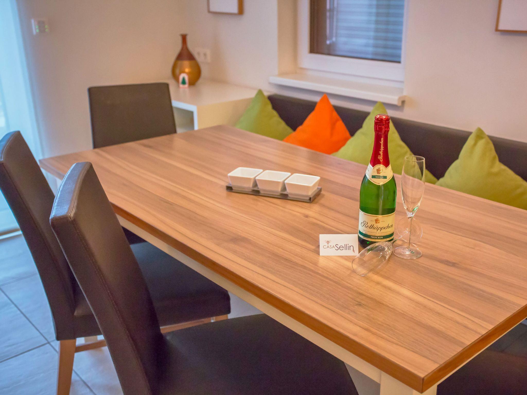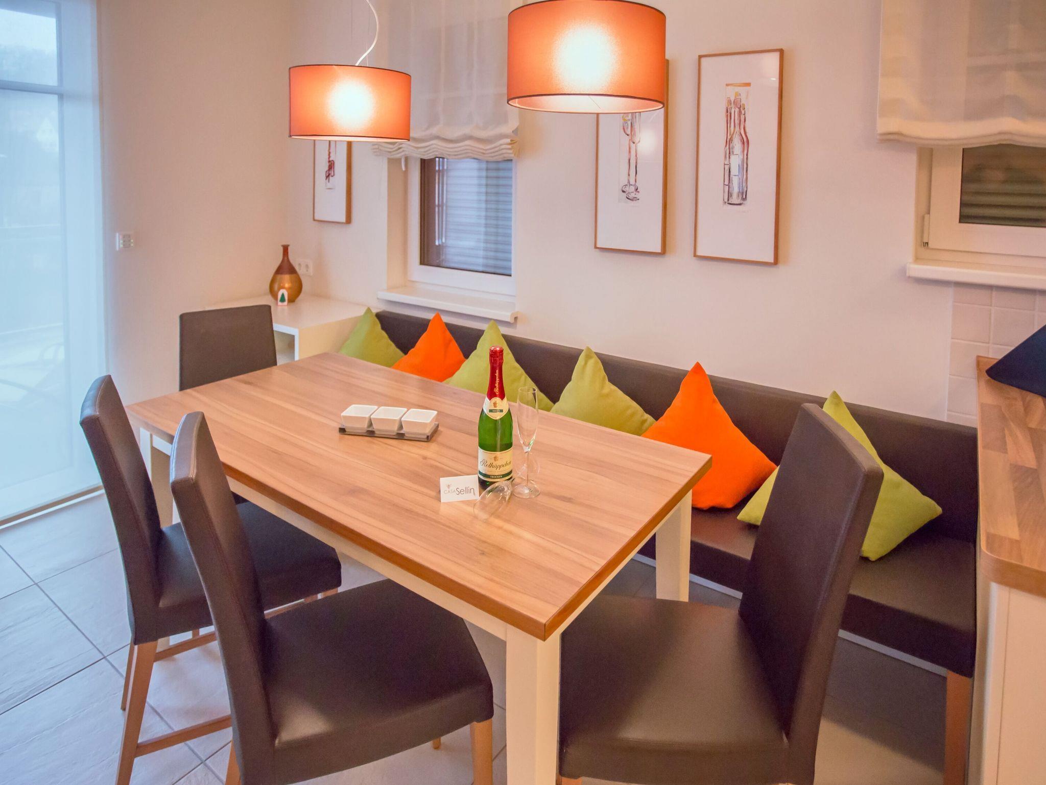 Diese ca. 70 m² große Haushälfte über zwei Ebenen mit geräumiger Hochterrasse (ca. 17 m²) zur Südseite verfügt im Erdgeschoss über einen Wohn- und Essbereich mit bequemer Sitzgruppe und einer Schlafcouch, welche als Aufbettung für zwei Personen genutzt werden kann. Somit ist eine Buchung auch mit 6 Personen für dieses Appartement möglich bzw. mit 12 Personen für das gesamte Haus.