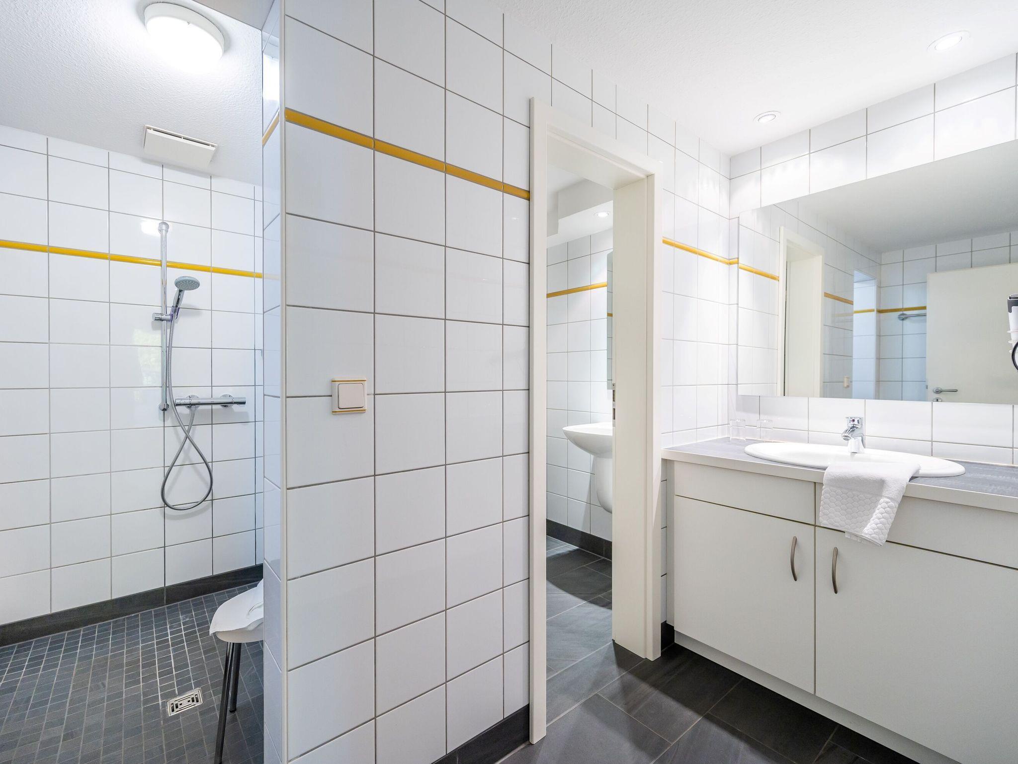 Im Schlafbereich steht ein komfortables Doppelbett und ein geräumiger Kleiderschrank bereit. Im hell erleuchteten Badezimmer befindet sich eine bodengleiche Dusche und ein separates WC.