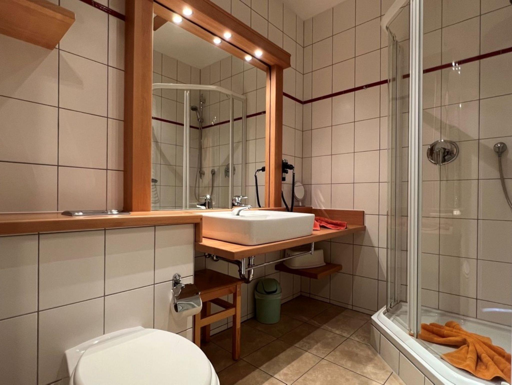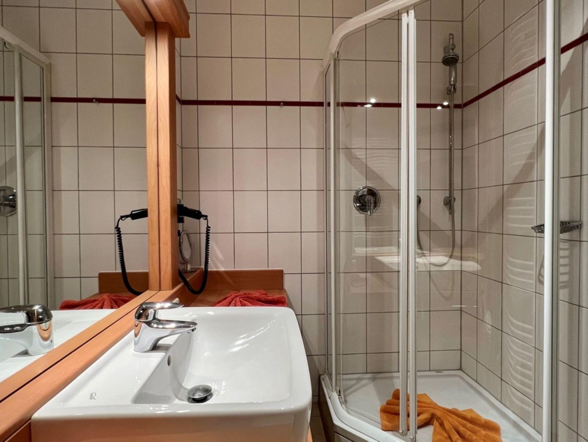 Die beiden Bäder bieten Ihnen jeweils eine Dusche, ein WC und einen Waschtisch mit Waschbecken und Spiegel.