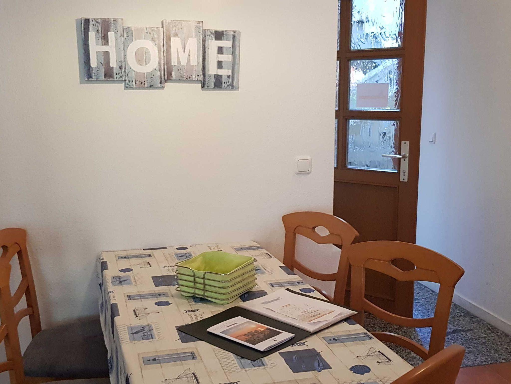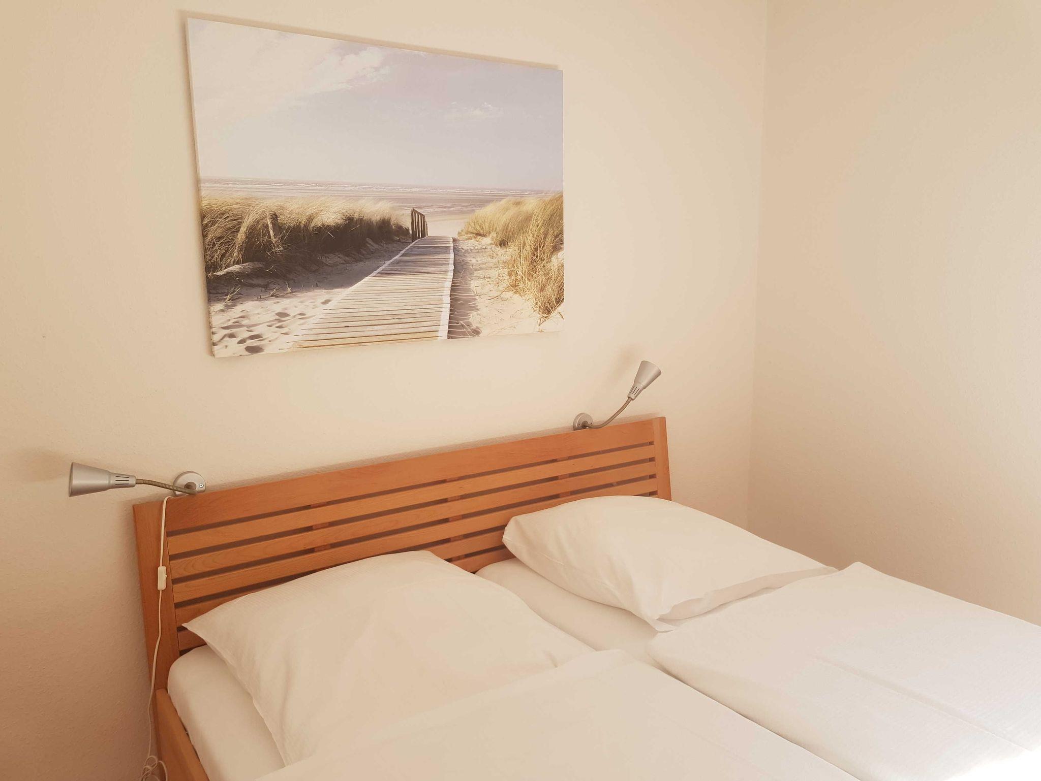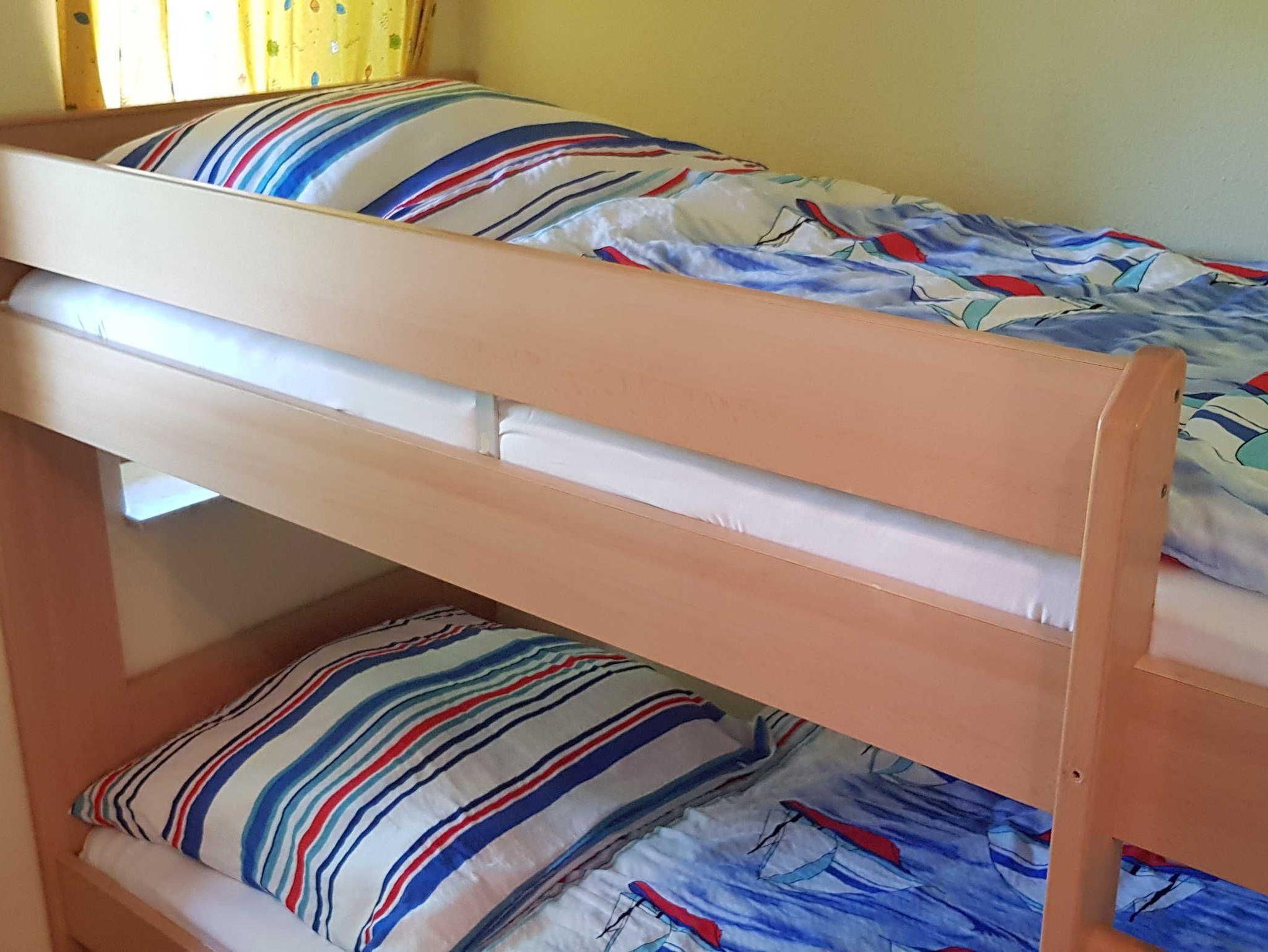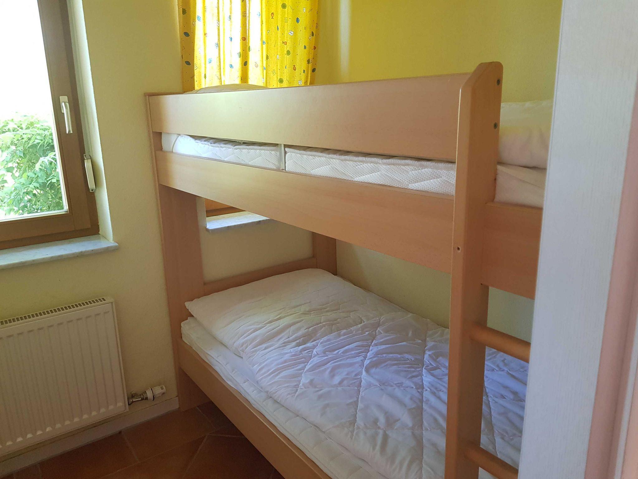 An die Terrasse schließt sich der Wohnraum mit Sofaecke, Essbereich und Küchenzeile an. Ein Tageslicht-Bad mit Dusche und drei Schlafzimmer (ein SZ mit Doppelbett, ein SZ mit französischem Bett und ein sehr kleines SZ mit Etagenbett) komplettieren die Ferienwohnung.