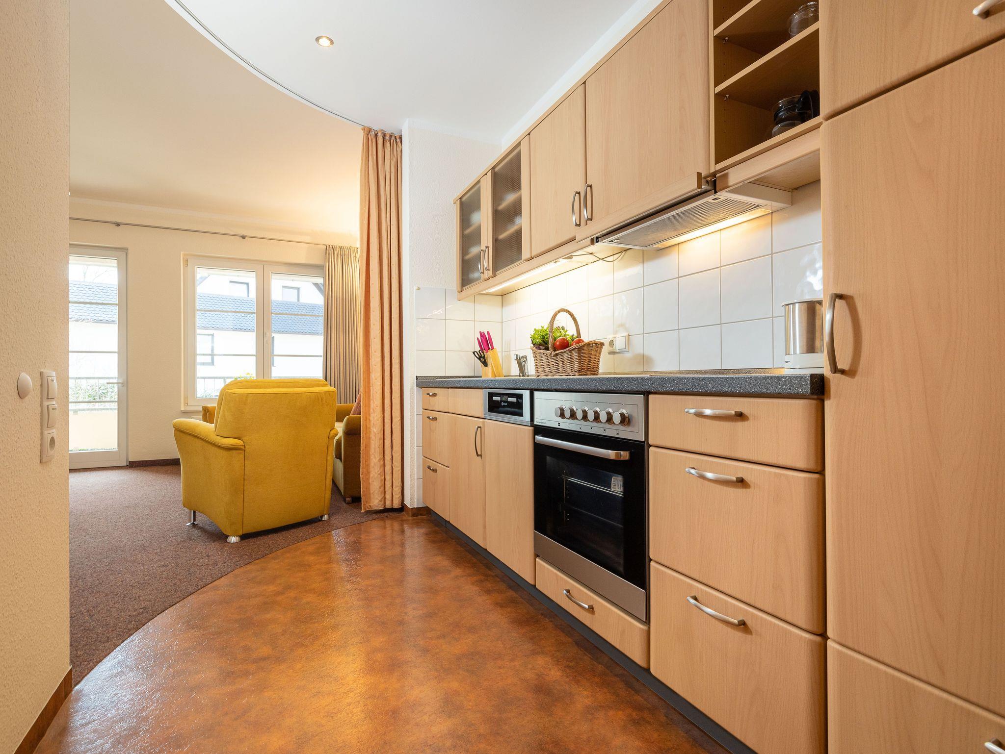 Die Küchenzeile ist mit einem Kühlschrank, einem Ceranfeld mit Backofen, einer Spülmaschine und einer Mikrowelle ausgestattet. Ebenso finden sich hier alle nötigen Küchenkleingeräte (Wasserkocher, Kaffeemaschine, Toaster..).
