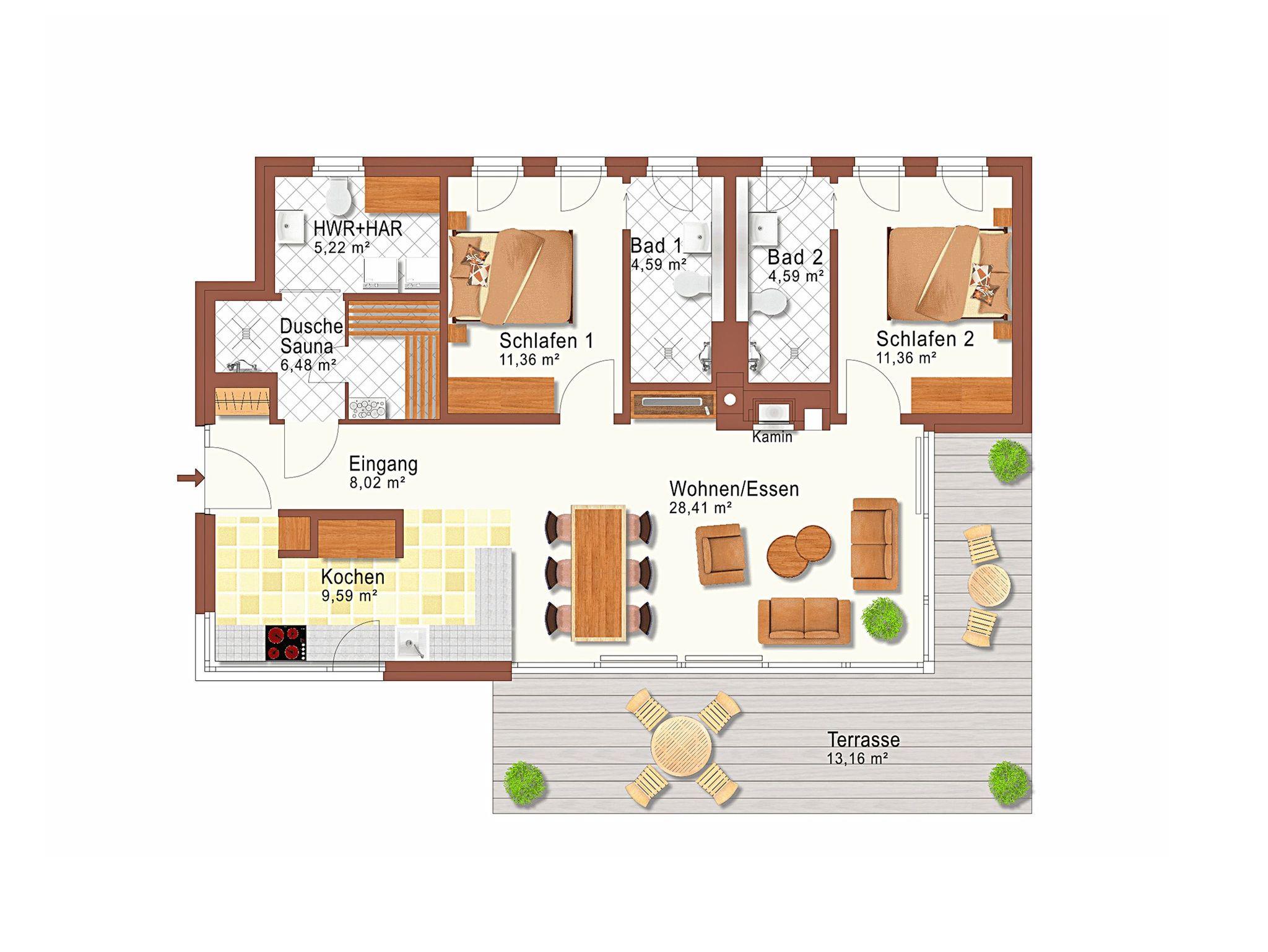 Zwei Schlafzimmer mit komfortablen Doppelbetten sowie zwei jeweils von den Schlafzimmern aus zu begehende Duschbäder sind vorhanden. Darüber hinaus steht Ihnen ein privater Saunabereich mit Dusche und WC zur Verfügung. Für die kleine Urlaubswäsche zwischen durch gibt es im Hauswirtschaftsraum eine Waschmaschine.