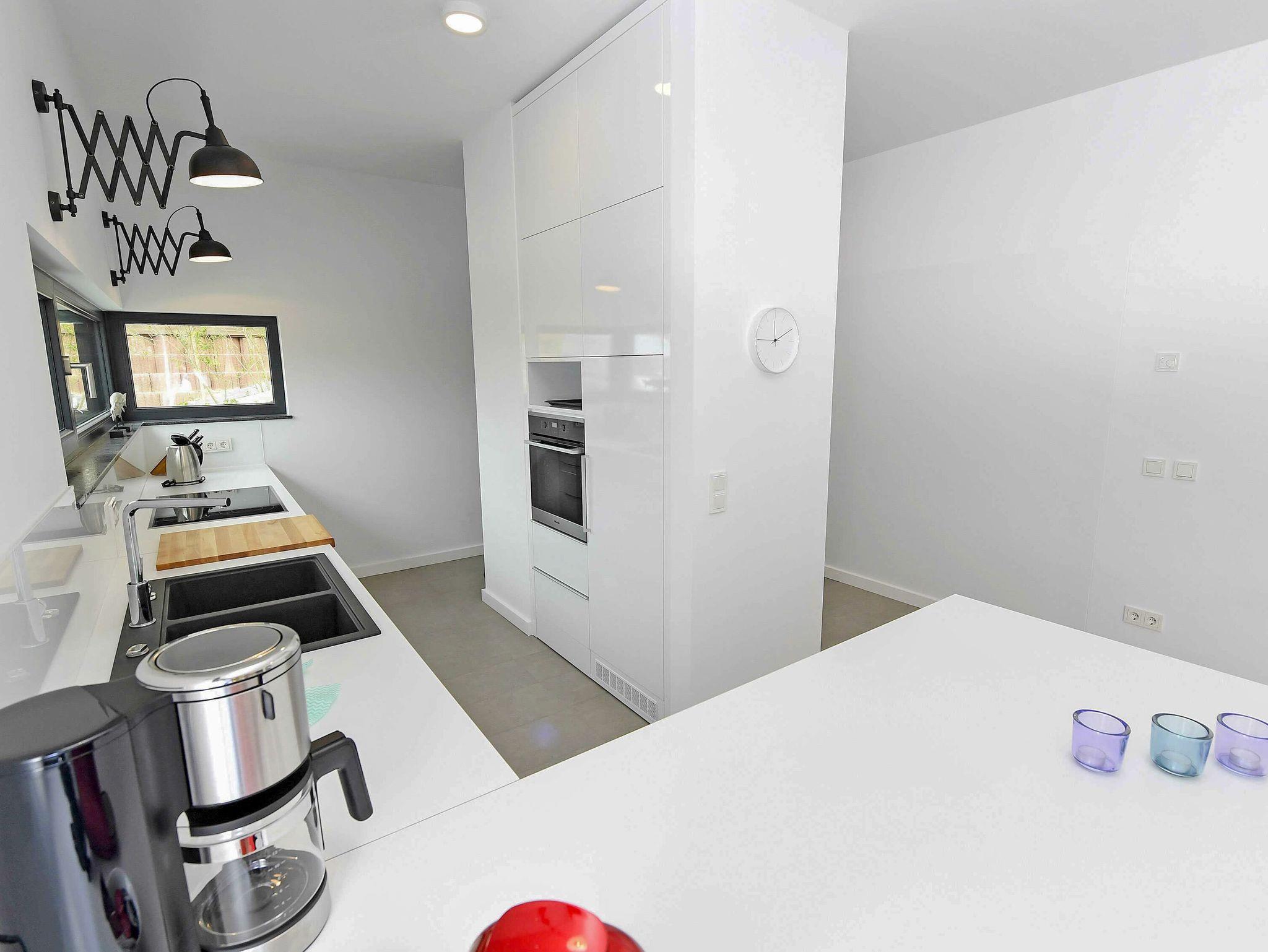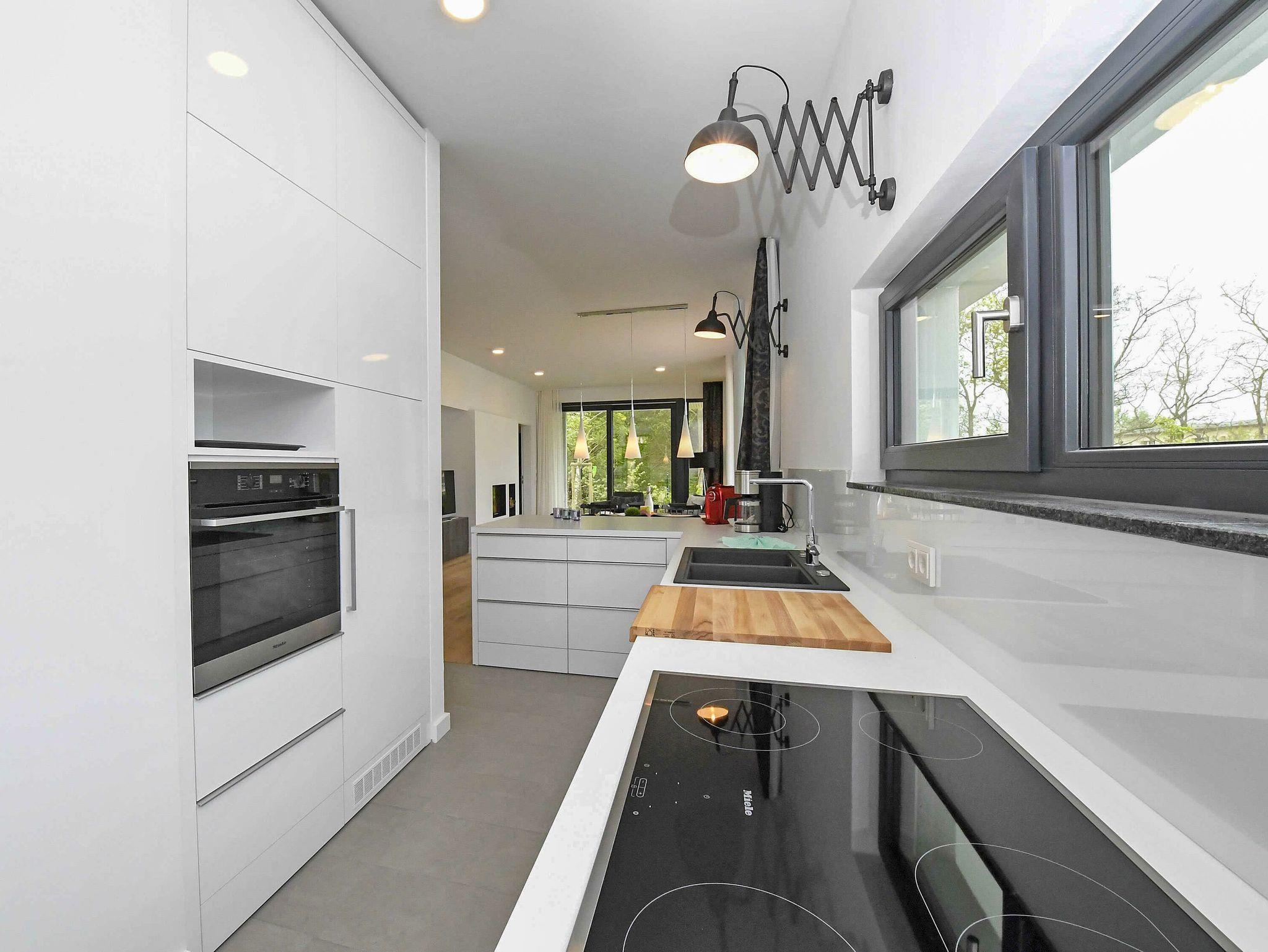 Die in den Wohnbereich integrierte voll ausgestattete und aufwändig gefertigte Einbauküche verfügt über einen Kühlschrank, eine Geschirrspülmaschine, ein 4-Zonen-Cerankochfeld mit Backofen, einen Nespresso-Automaten und eine Filterkaffeemaschine, einen Wasserkocher, einen Toaster und diverses Kleininventar, das die sehr gute Ausstattung komplettiert.