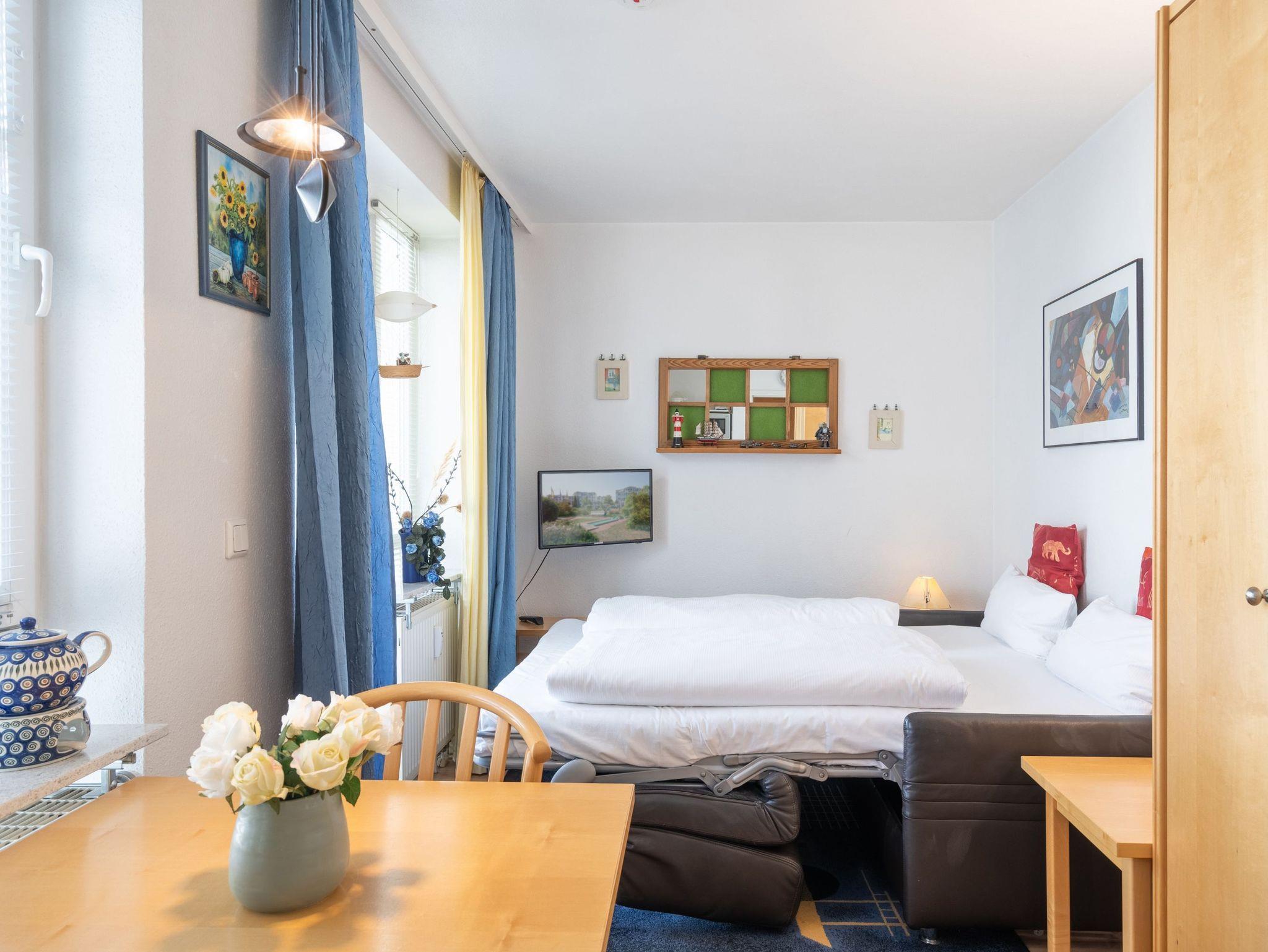 Die Ferienwohnung verfügt über kostenfreies WLAN und die Erstausstattung an Bettwäsche ist inklusive. Der kombinierte Wohn-/Schlafbereich mit Verdunklung verfügt über ein Schlafsofa. Darüber hinaus verfügt die Ferienwohnung über ein Bad mit Dusche/WC und Föhn. Die voll ausgestattete Pantry mit Mikrowelle, Kaffeemaschine und Toaster lässt keine Wünsche offen. Ein Fernseher inkl. 3 Sky-Sender rundet die gute Einrichtung ab.