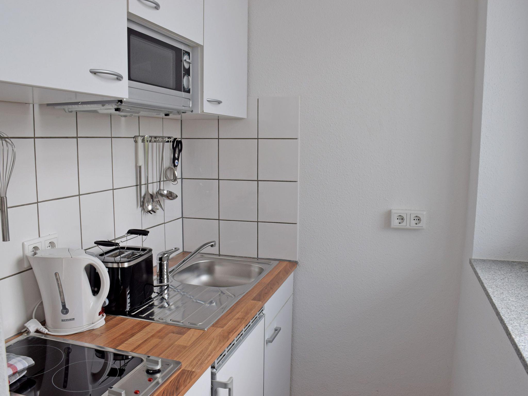 Die Küchennische verfügt über ein 2-Platten-Ceranfeld, Kühlschrank mit Gefrierfach, Mikrowelle, Kaffeemaschine, Toaster, Wasserkocher sowie ausreichend Geschirr und Kochutensilien.