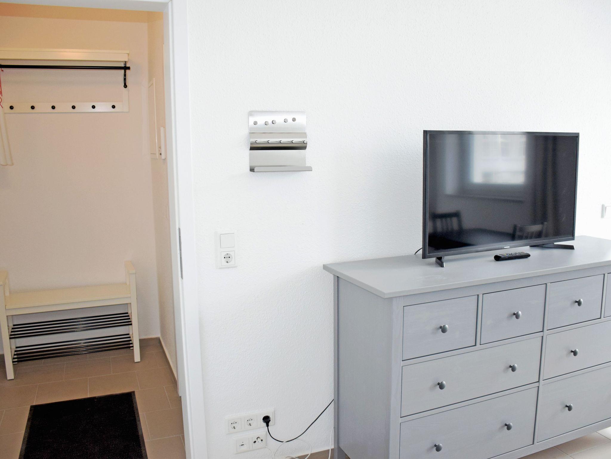 In dem kombinierten Schlaf-/ Wohnraum stehen ein Hochbett (1,40 x 2,00m), ein Schlafsofa , ein Kleiderschrank, ein Esstisch mit zwei Stühlen und eine Kommode mit Flachbild-TV. Es können also hier max. 2 Erwachsen und ein Kind bis 16 Jahre wohnen und schlafen. Achtung das Hochbett ist nur 1,40 breit!