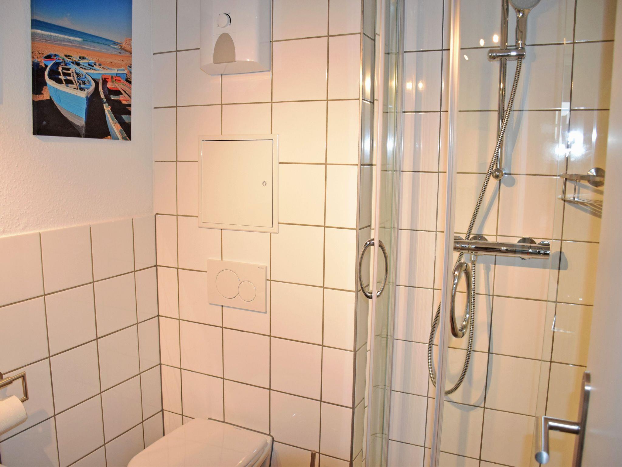 Das moderne Bad ist mit Dusche, WC, Waschbecken, Spiegel und Föhn ausgestattet.