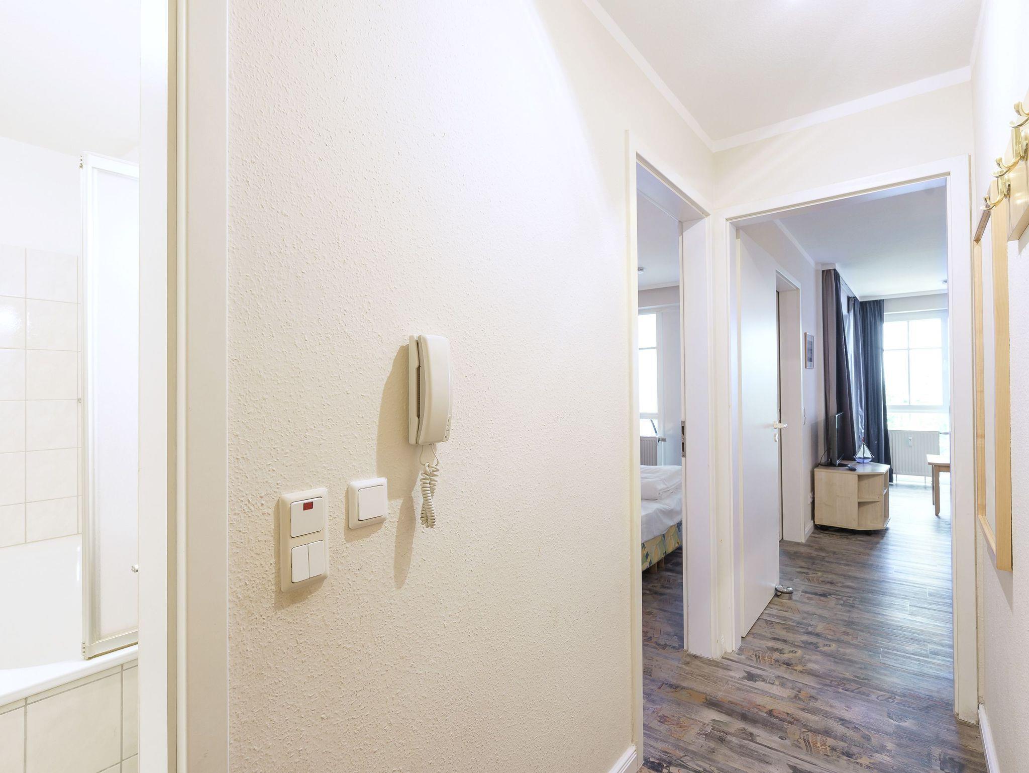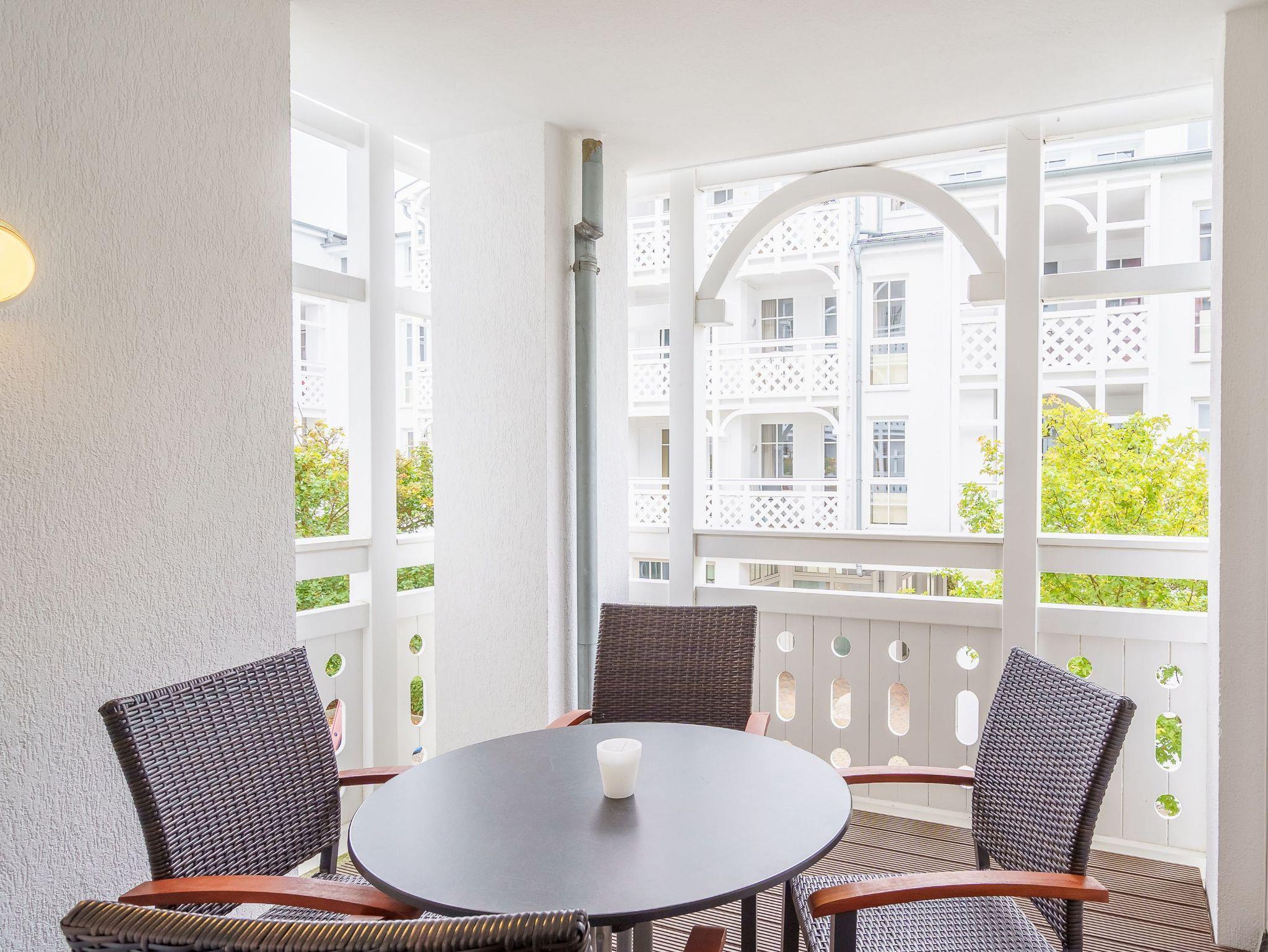Auf dem Balkon in Nordwestlage können Sie nach einem ereignisreichen Tag entspannen und die schöne Aussicht sowie die Sitzgruppe genießen. Auch ein mitreisendes Haustier ist in dem Nichtraucher-Apartment erlaubt.