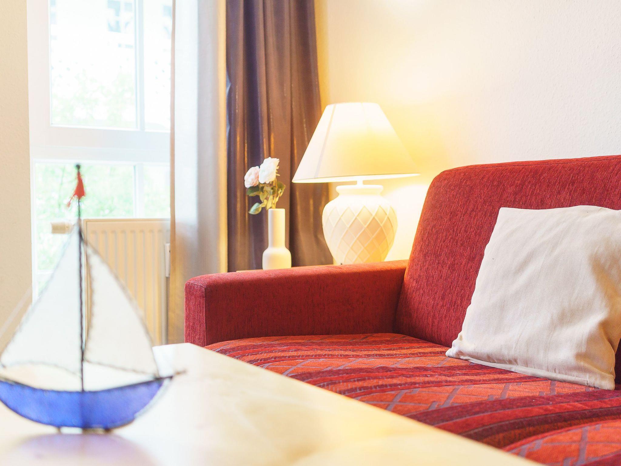 Die Ausstattung der Ferienwohnung umfasst kostenfreies WLAN und eine Erstausstattung an Bettwäsche. Das Schlafzimmer verfügt über ein Doppelbett und im Wohnzimmer können 2 weitere Personen auf der Doppelschlafcouch schlafen. In beiden Räumen lassen sich die Fenster mit Vorhängen verdunkeln. Das Badezimmer verfügt über eine Badewanne und WC. Die offene Küche ist komplett ausgestattet mit Mikrowelle, Kaffeemaschine und Toaster. Ein Fernseher mit 3 Sky-Sendern rundet die Ausstattung ab.