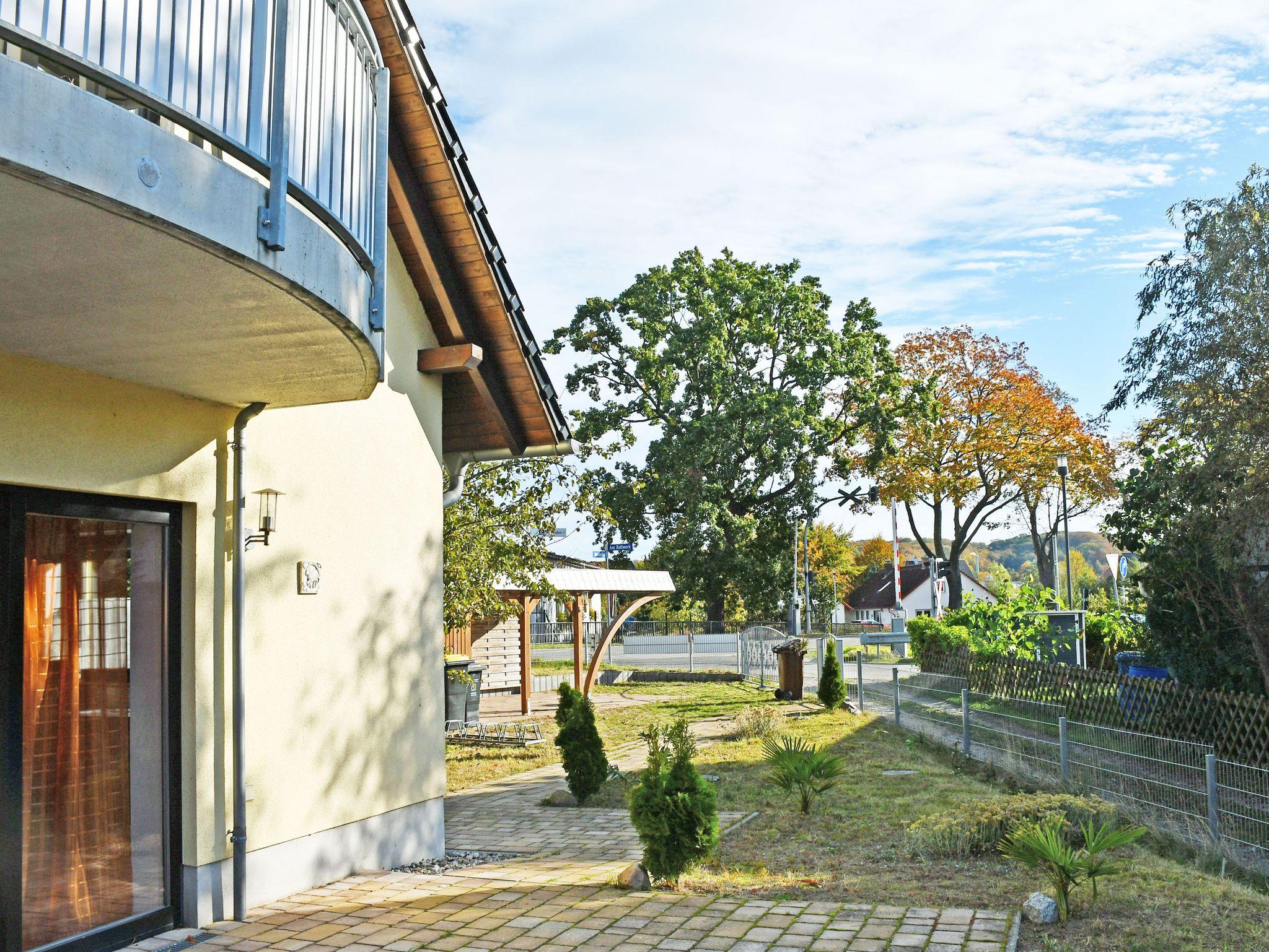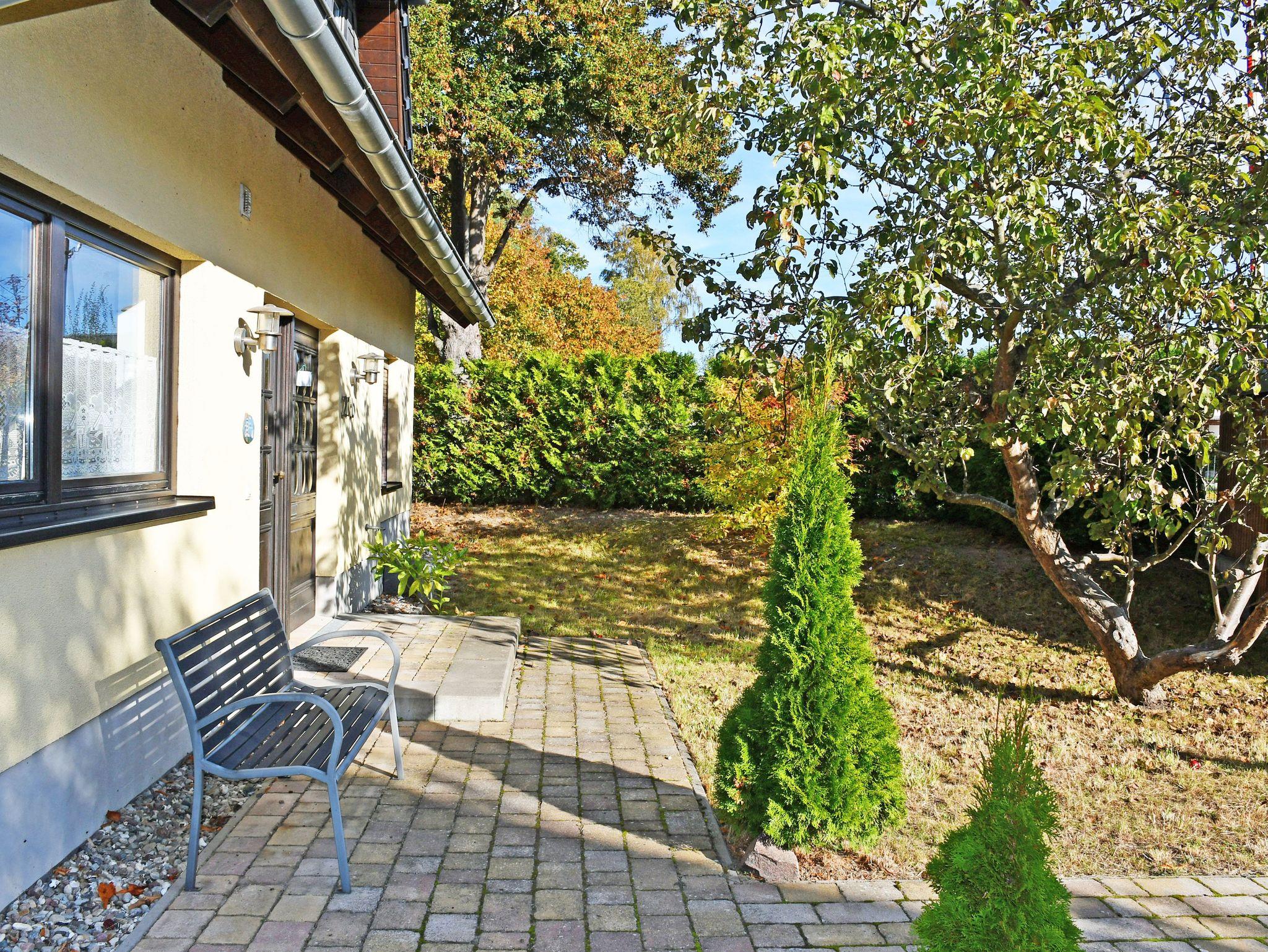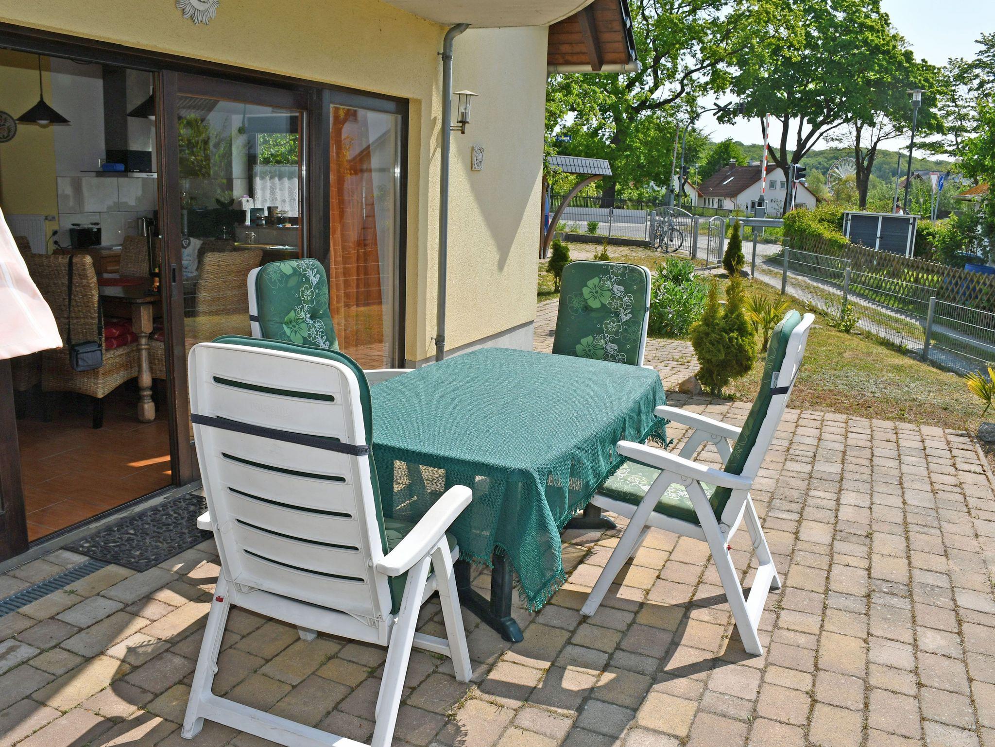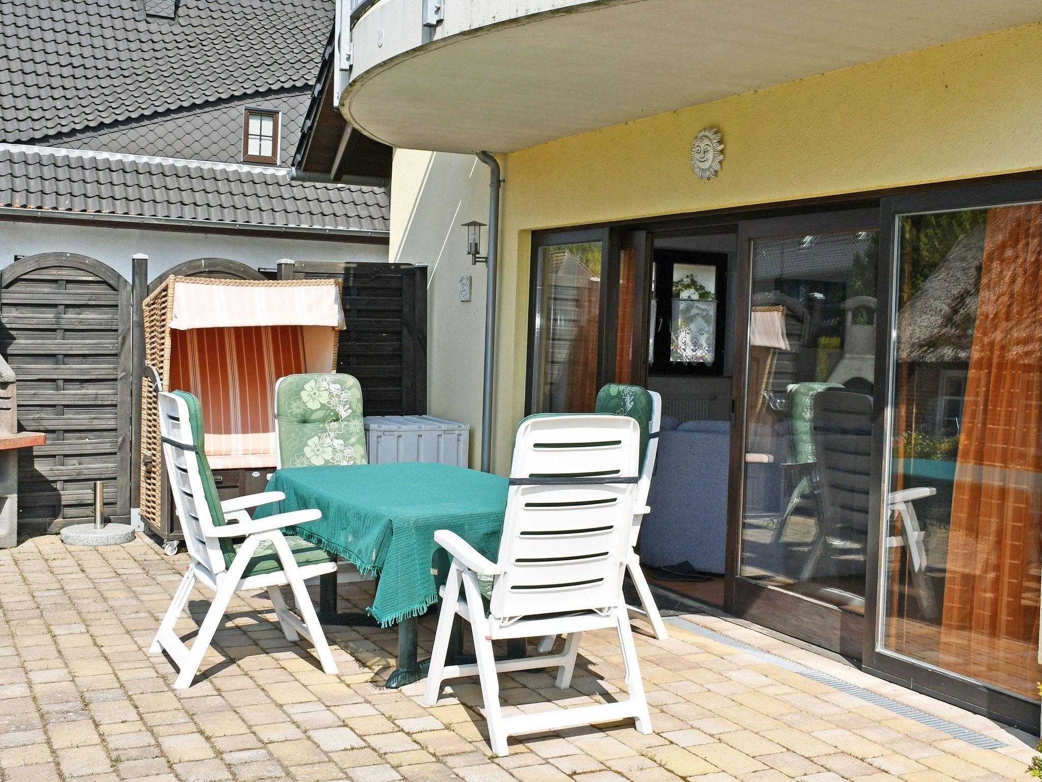Vom Wohnzimmer aus gelangen Sie auf die große Sonnenterrasse mit Gartenmöbeln, Strandkorb und Grill.