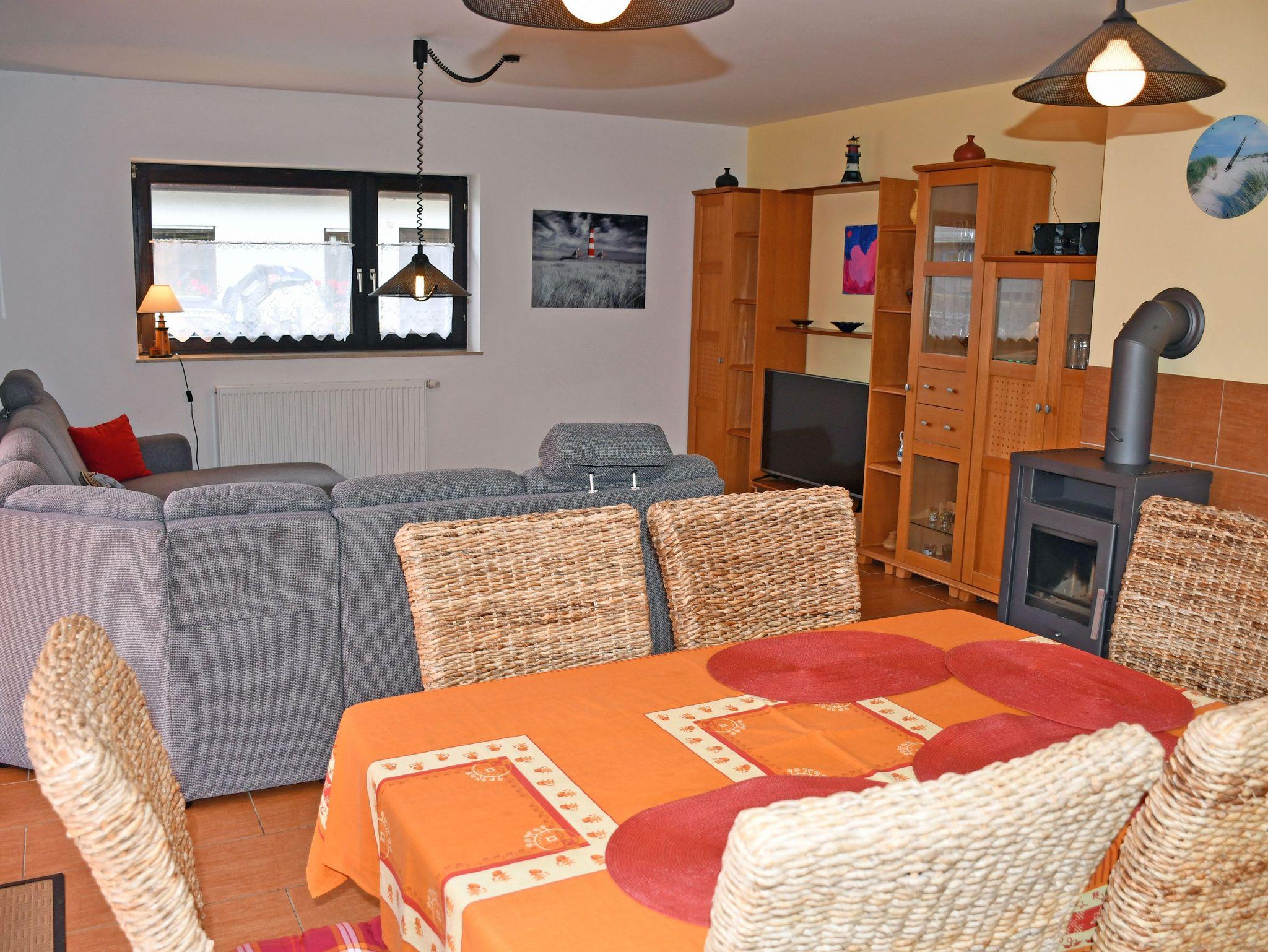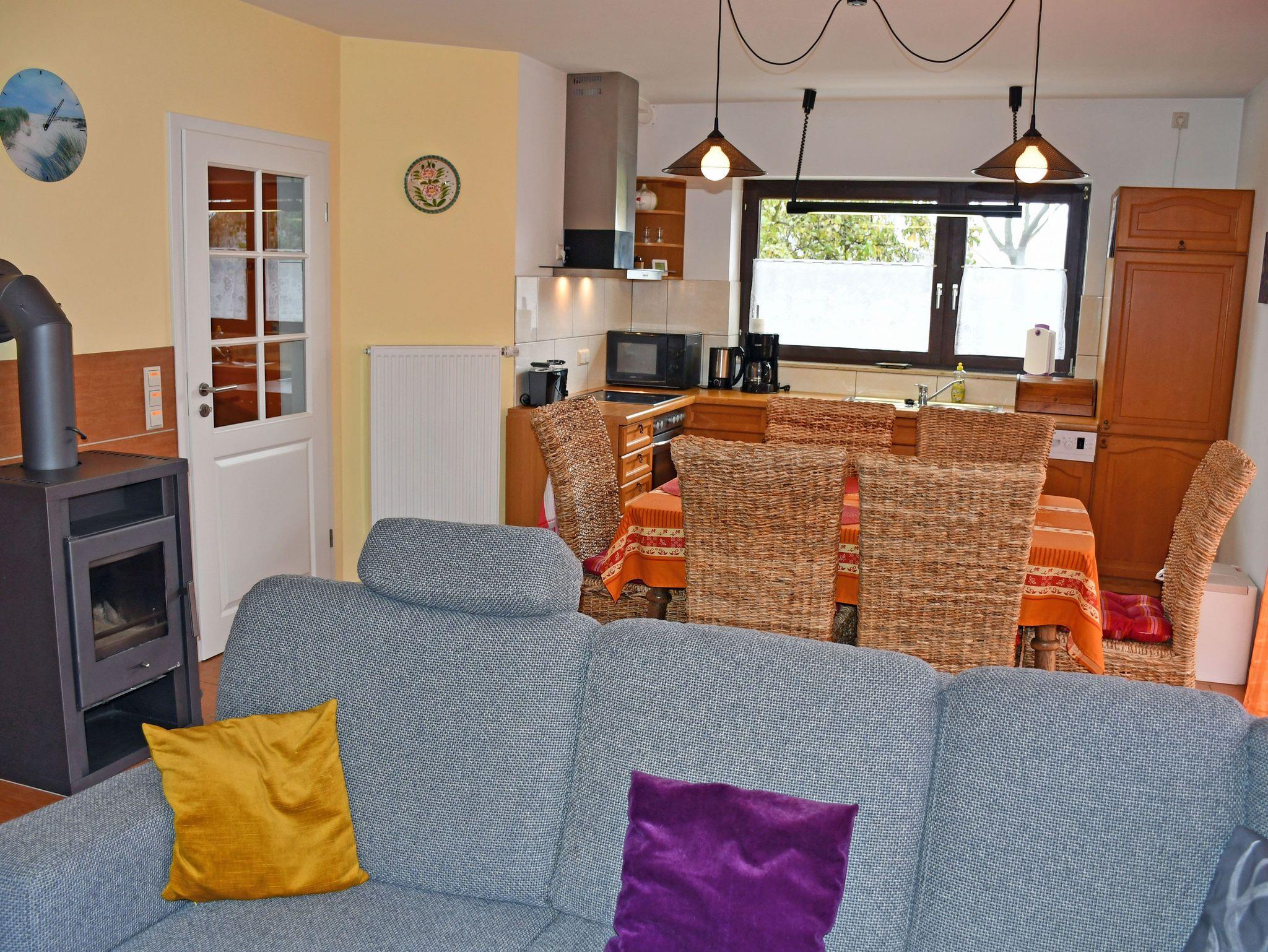 Das freistehende Ferienhaus erstreckt sich mit ca. 130 qm Wohnfläche über 2 Etagen. Im Erdgeschoss gelangen Sie zunächst in den hellen Flurbereich. Im großen Wohnzimmer befinden sich eine Couchgarnitur die auch für eine Gästeaufbettung genutzt werden kann, ein 49 Zoll Flachbild-TV, die Küchenzeile und der Essbereich. Im Wohnzimmer sorgt gerade in der kühleren Jahreszeit ein Kamin für eine behagliche Atmosphäre.