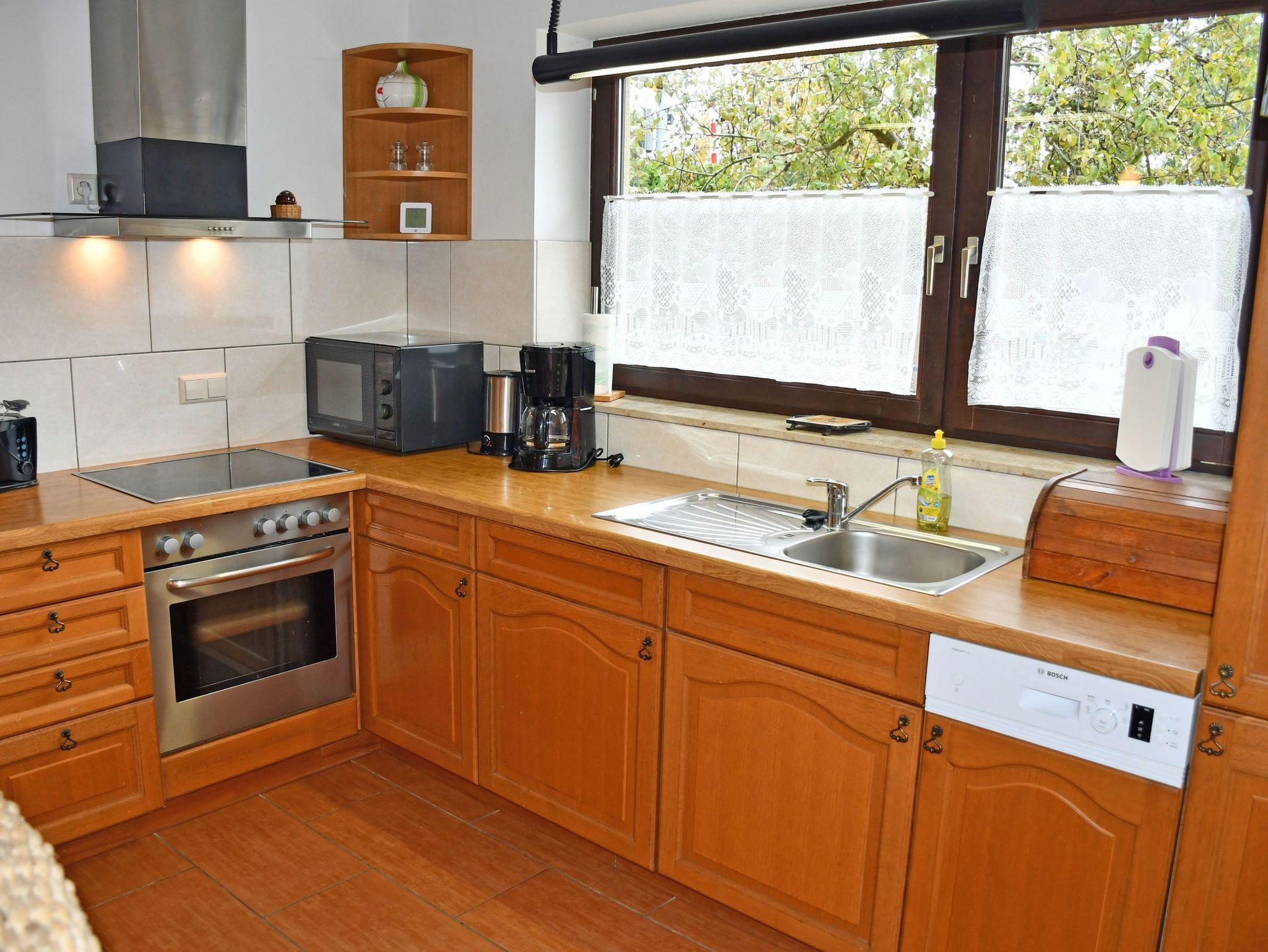 Die Küchenausstattung ist modern und komplett: ein Kühlschrank mit Gefrierfach, eine Mikrowelle, ein Backofen und ein Herd sowie Abzugshaube.