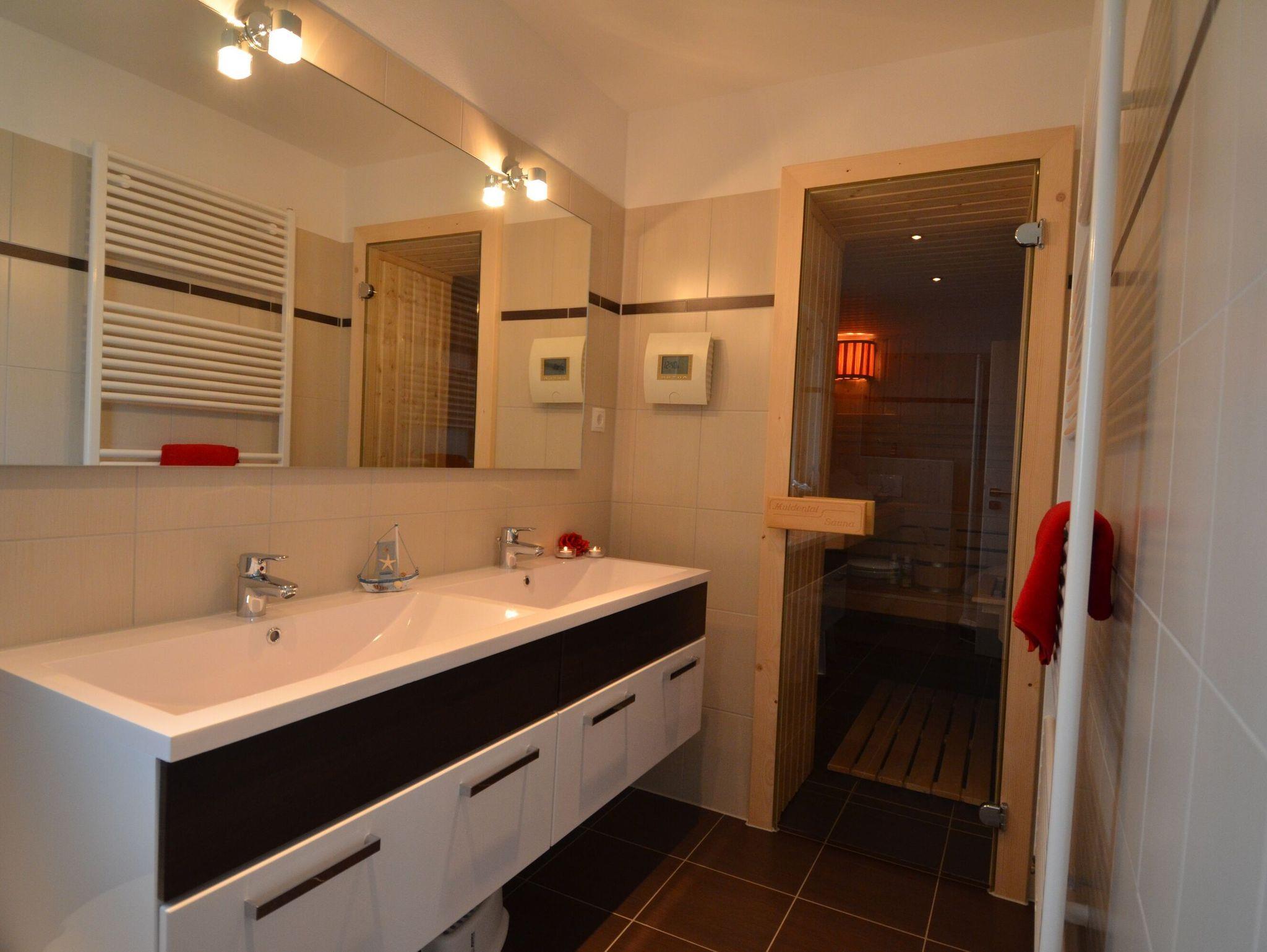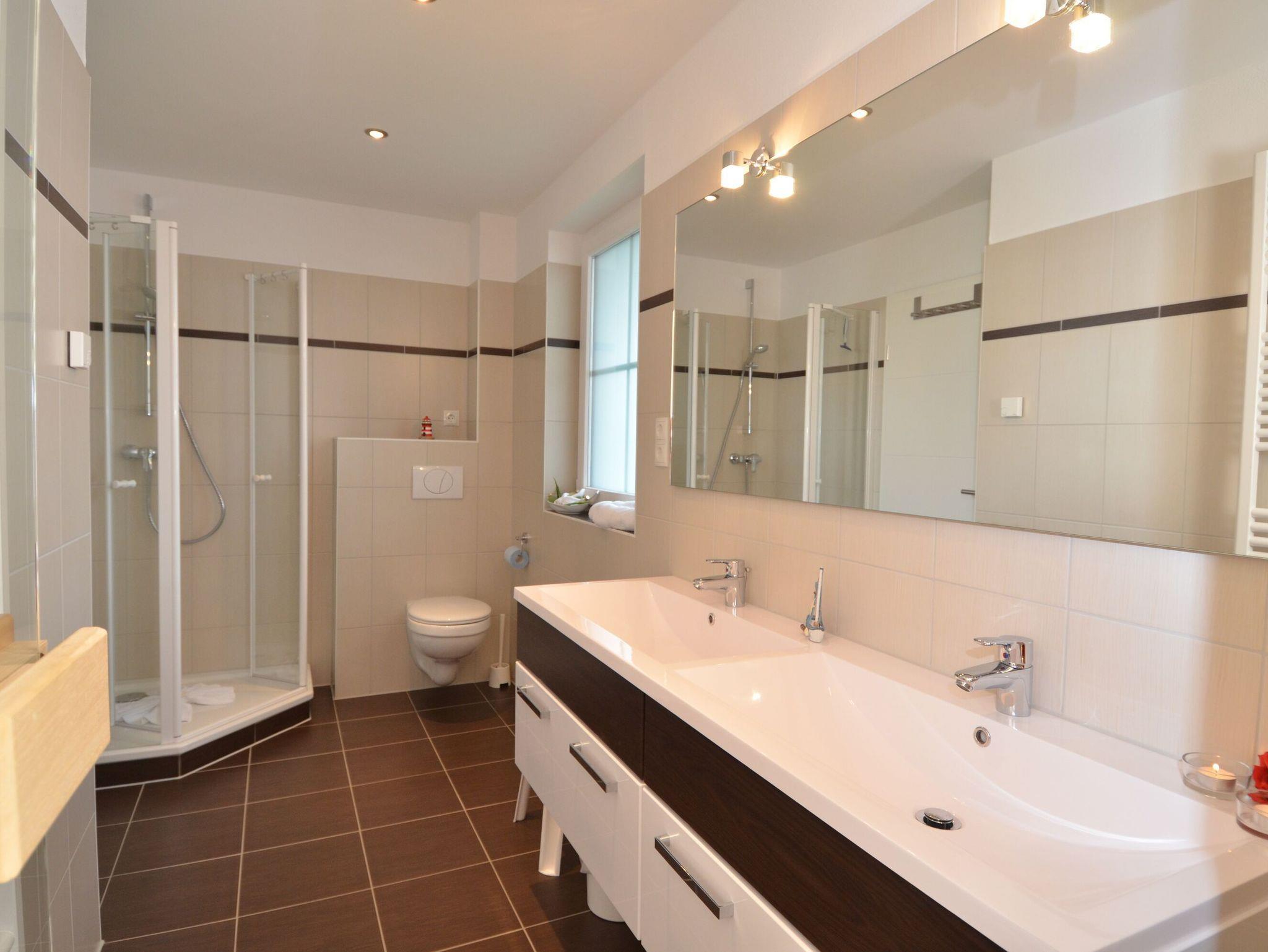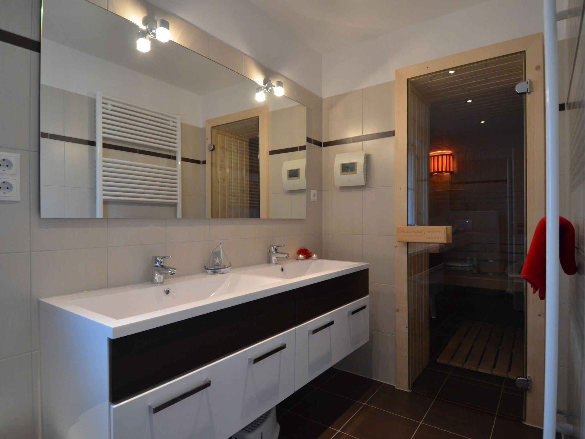 Das moderne Duschbad mit Doppelwaschtisch, WC und eigener Bio-Sauna rundet den hochwertigen Eindruck der Ausstattung ab.