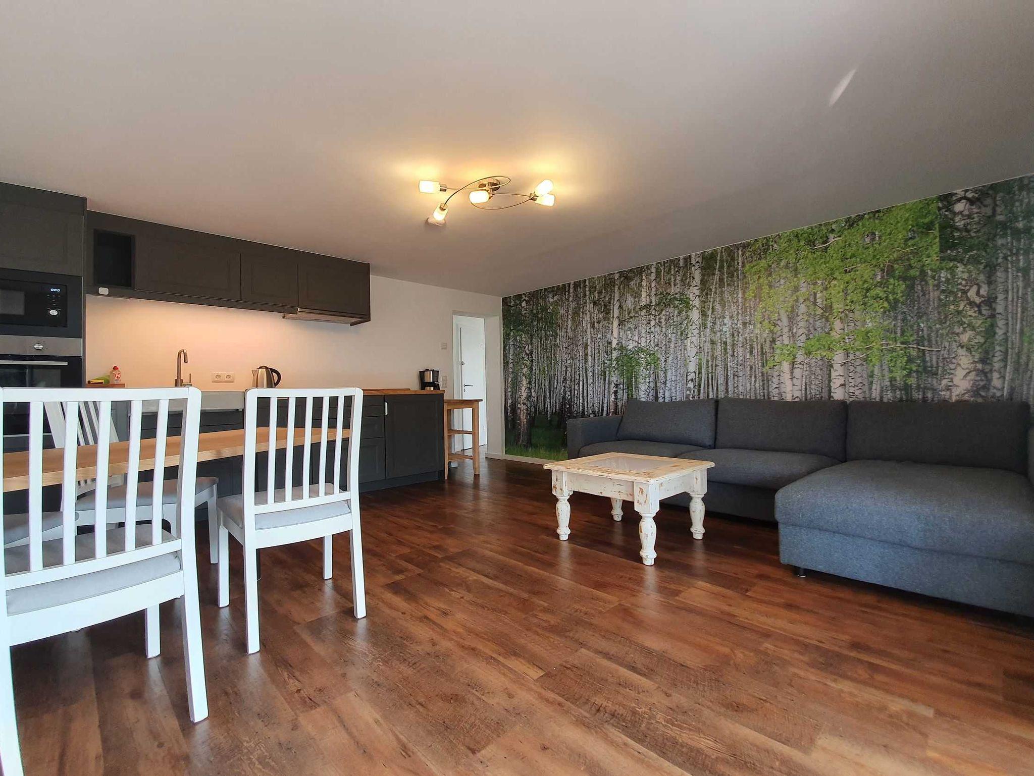 Der Wohnbereich ist mit einer gemütlichen Schlafcouch und einem Flachbild TV ausgestattet. Die offene Wohnküche mit Essbereich ist ausgestattet mit einem 4 Felder Induktionsherd mit Backofen, Spülmaschine, Mikrowelle, Kühlschrank mit Gefrierfach, Kaffeemaschone, Toaster und reichlich Küchenutensilien lässt Sie keinen Wunsch offen.