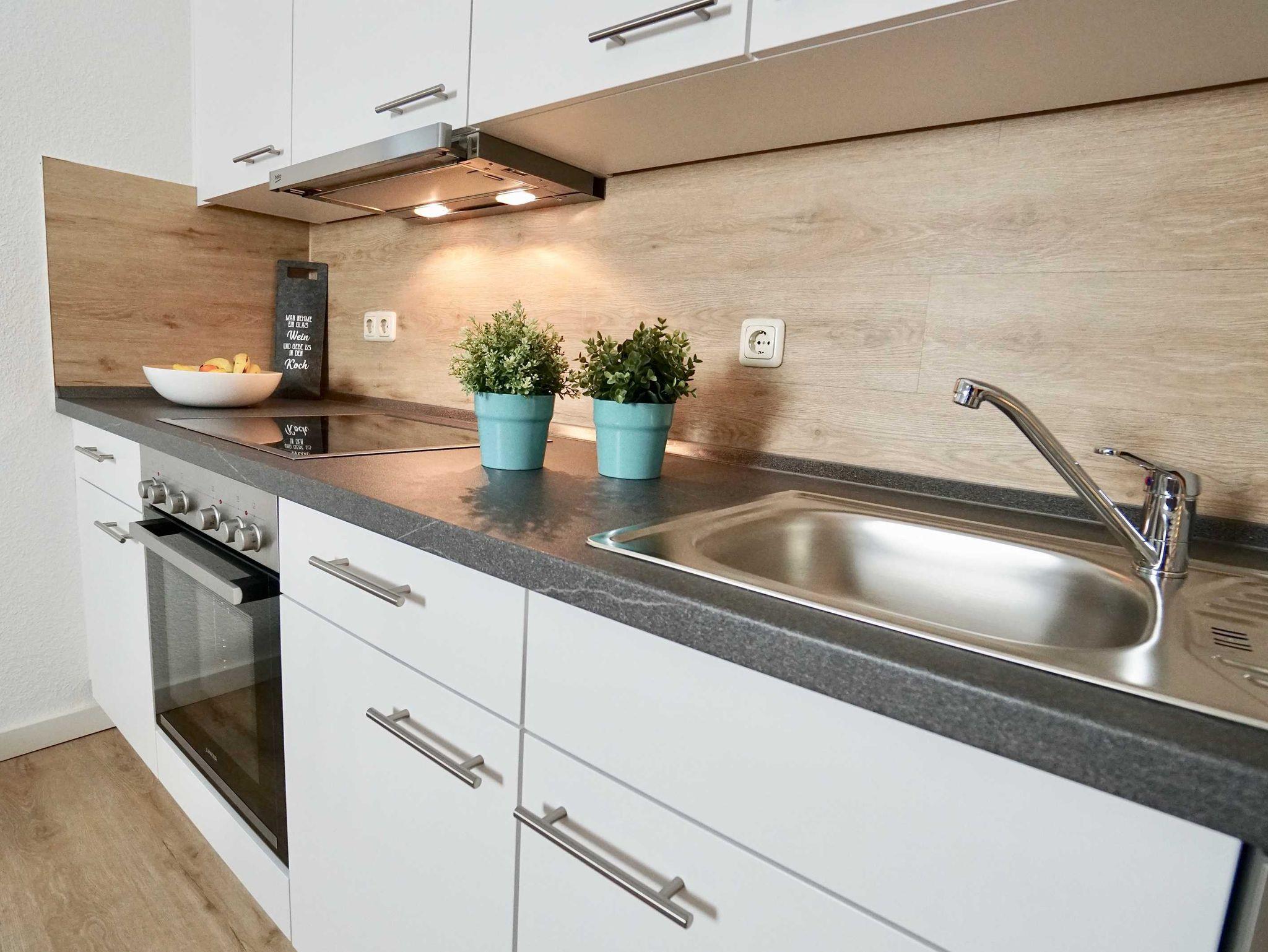 reichhaltige Küchenausstattung mit Herd mit Cerankochfeld, Dunstabzugshaube, Geschirrspüler, Kühlschrank, getrennte Müllentsorgung, Kaffeemaschine, Isolierkanne, Toaster, Töpfe und Pfannen, Geschirr und Gläser sind ausreichend vorhanden, Laminat- oder Fliesenboden für leichte Sauberhaltung. Auf jeder Etage befindet sich auch ein Staubsauger und weitere Reinigungsmittel, sowie großer Wäsche- und Kleiderschrank, Schuhschrank, Flurgarderobe, geräumiges Duschbad, Kabel-TV, Stereoanlage, kostenloses W-LAN, SodaStream, Fahrradabstellplatz vorhanden. Eine Mikrowelle können Sie bei Bedarf an der Rezeption ausleihen.