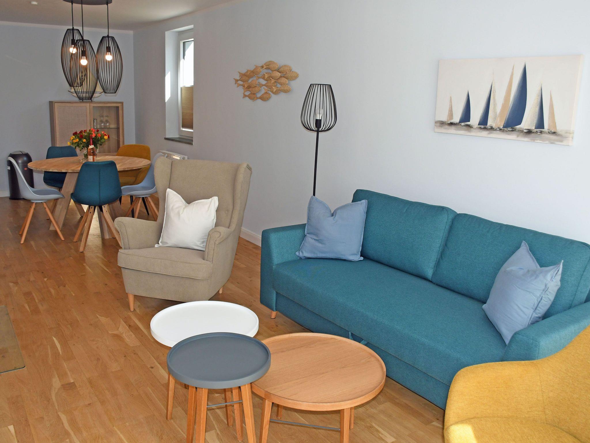 Unsere Maisonett-Ferienwohnungen 64 bietet Platz für 6 Gäste und ein Kind bis 3 Jahre im Kinderreisebett, sie wurden 2022 komplett renoviert und neu im modernen nördlich maritimen Stil eingerichtet.