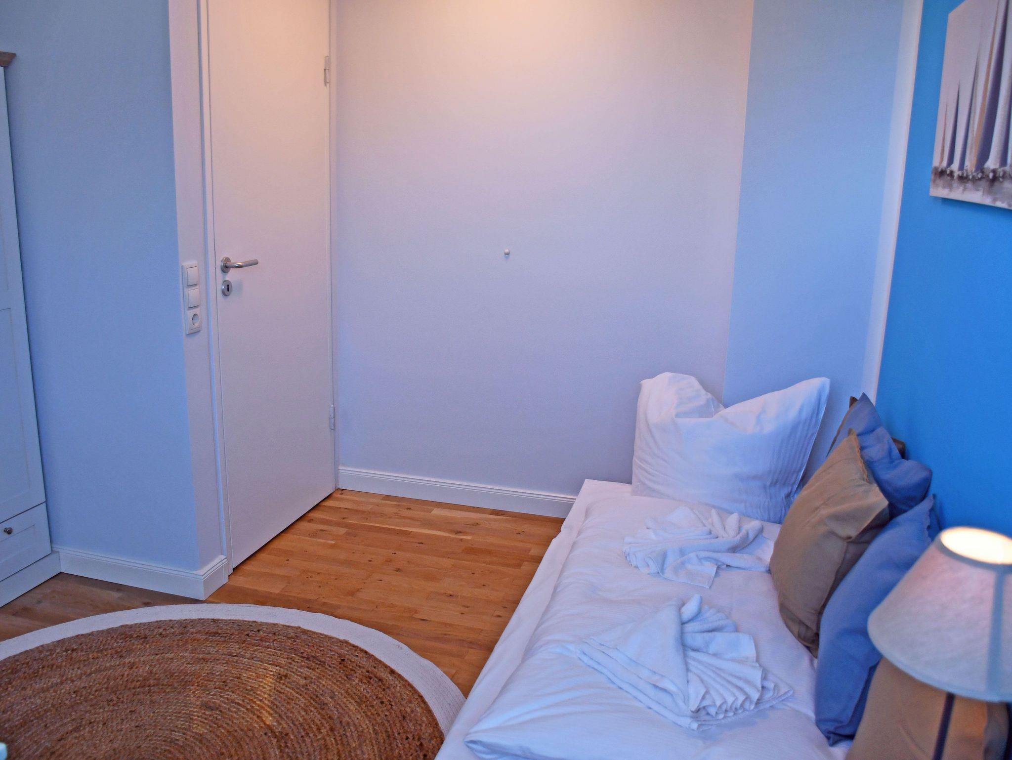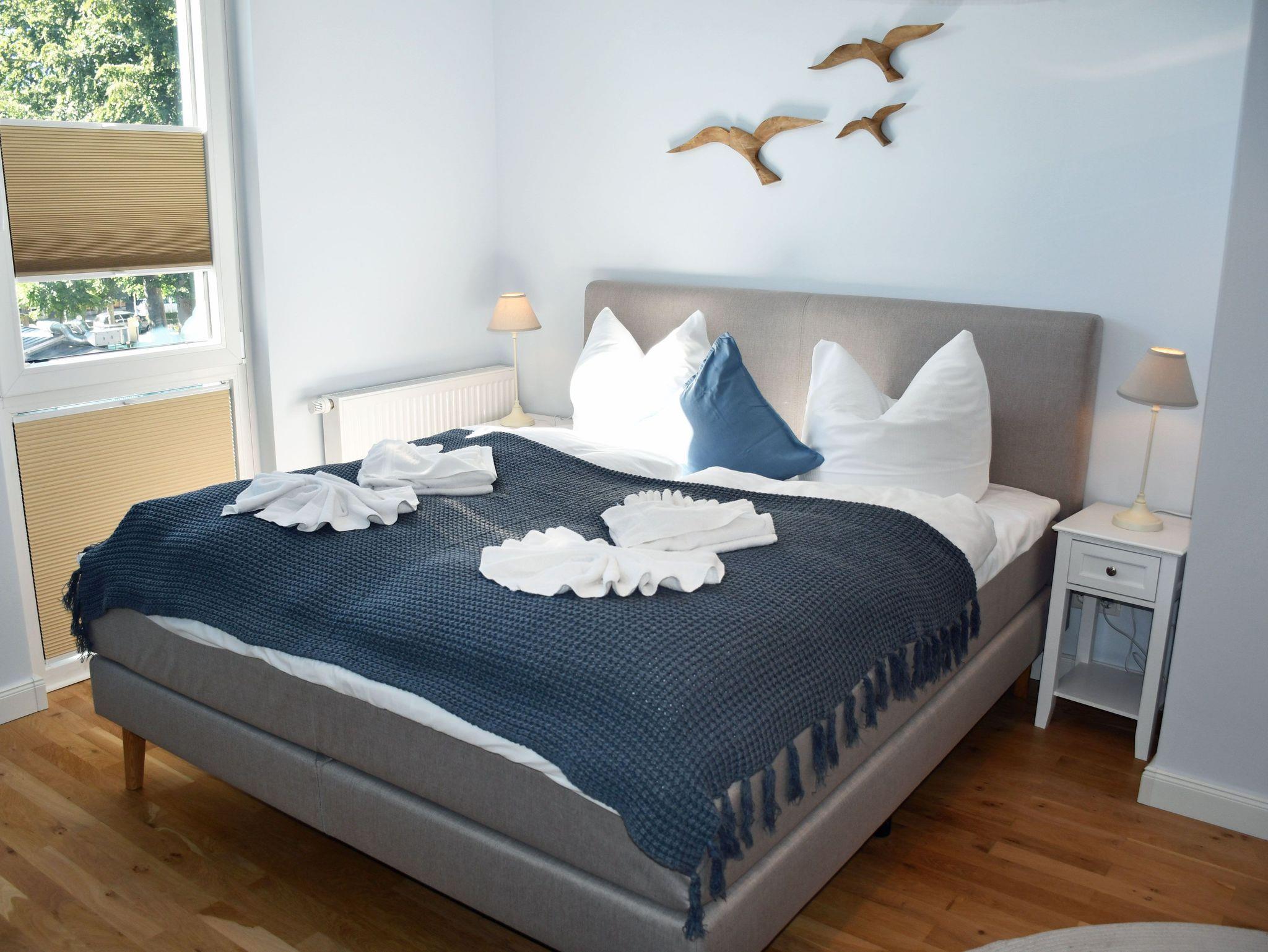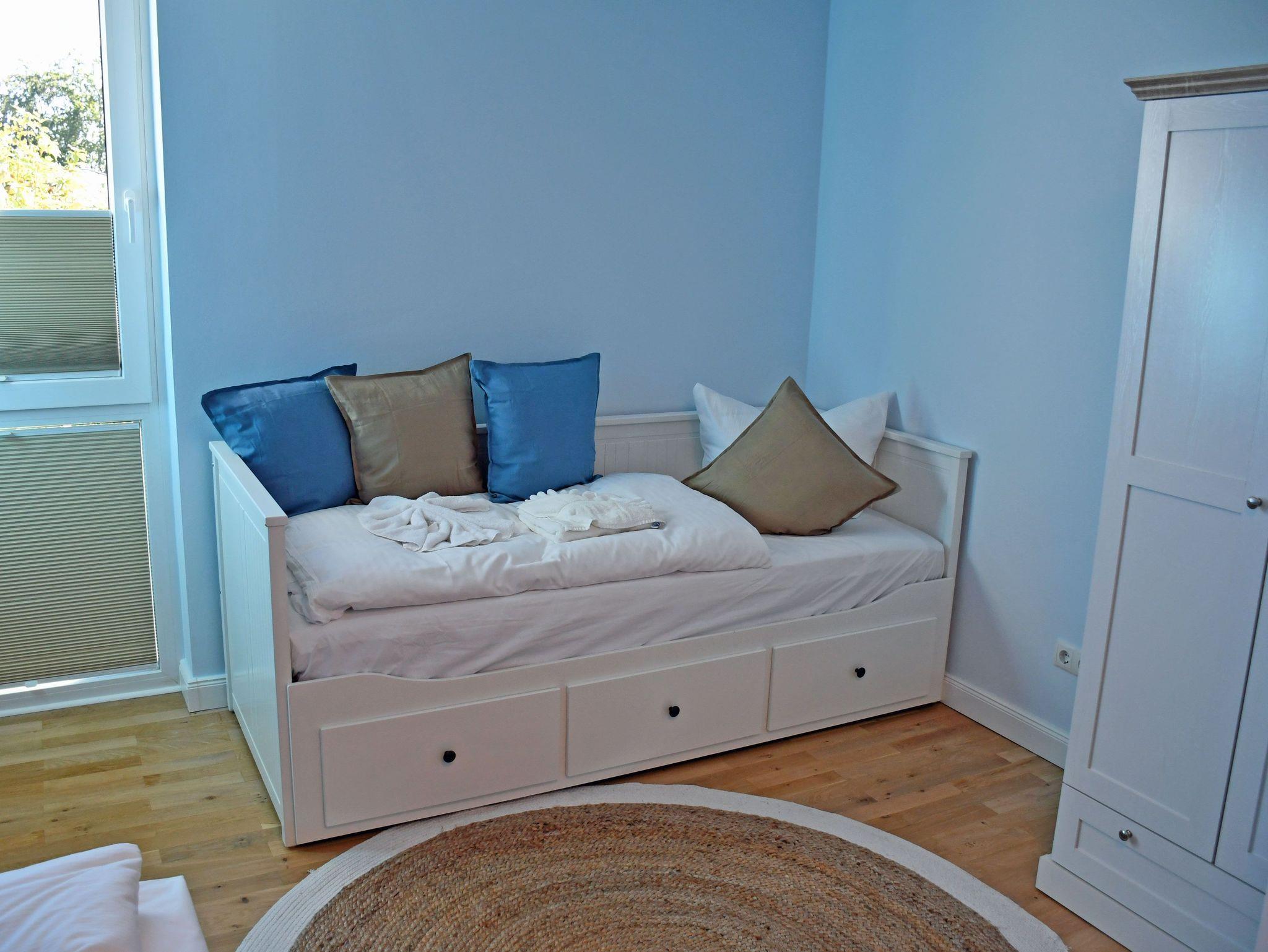 Jede der Wohnung wird ebenerdig über die Eingangstür betreten. Hier erstreckt sich gleich rechtsseitig ein kleines Duschbad, sowie dem Flur folgend ein großzügiger langgezogener Schlafraum. Ein bequemes Boxspringbett (1,80 m) mit Nachttischen und Leselampen sorgt hier für hohen Komfort und erholsamen Schlaf der Gäste und bildet den zentralen Punkt des Raumes. Ein 3- türiger Kleiderschrank und eine Kommode bieten ausreichend Stauraum für Kleider. Der große Bettkasten bietet Stauraum für die zur Aufbettung zusätzlich benötigten Bettdecken. Die Fenster können bei Bedarf zum Schlafen verdunkelt werden.