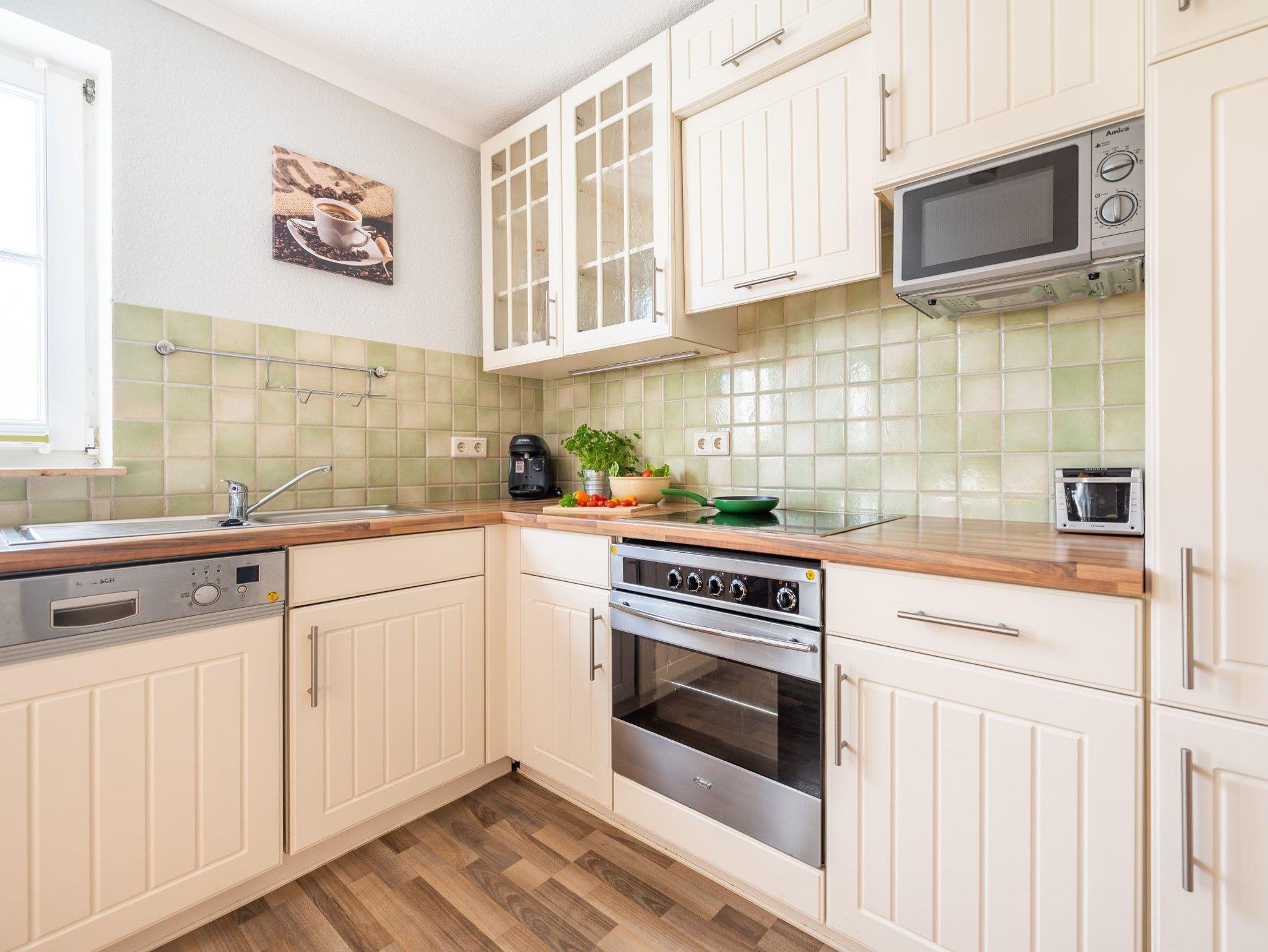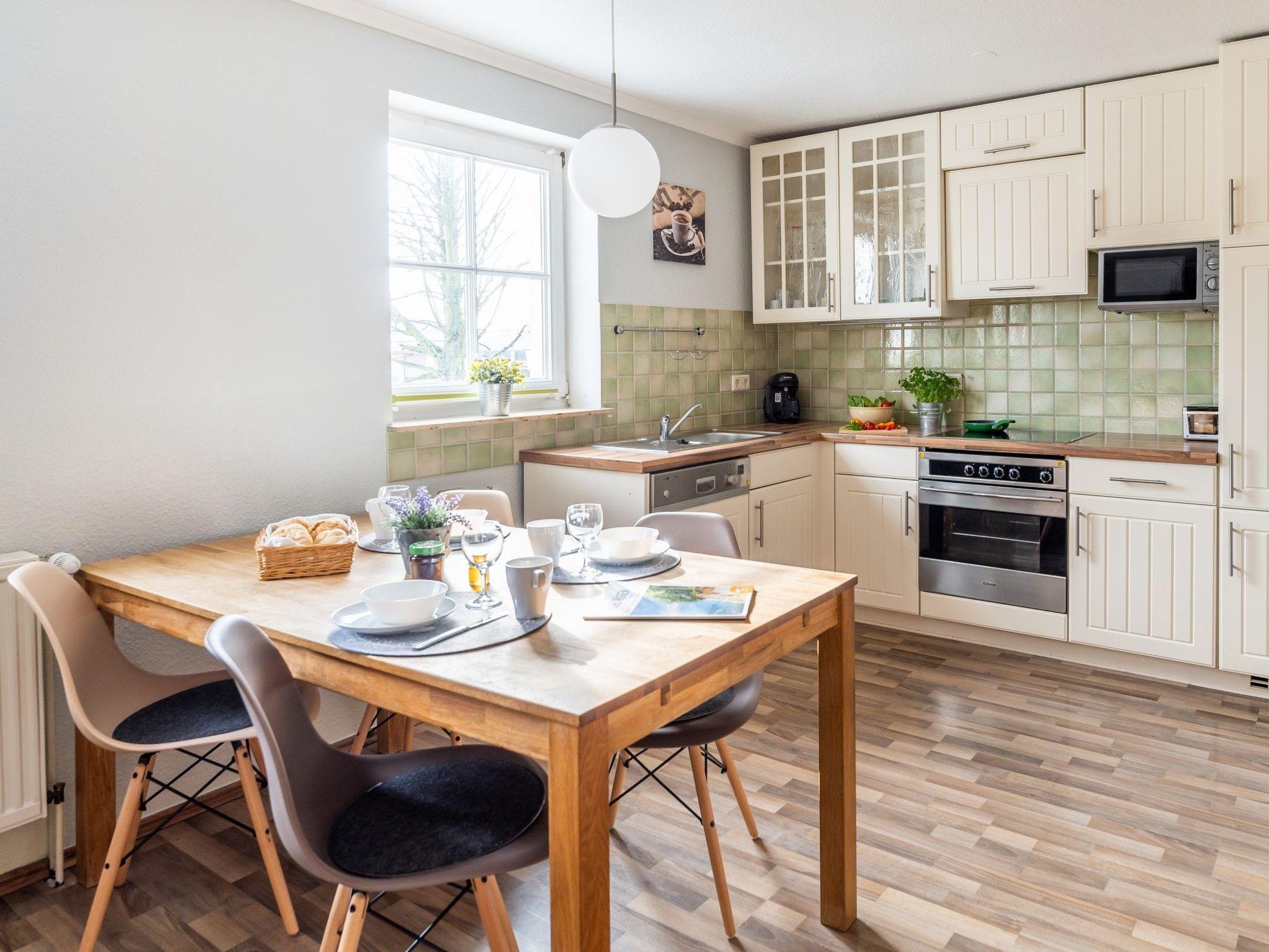 • komplett eingerichtete Wohnküche mit Essplatz, Backofen, Mikrowelle, Geschirrspüler