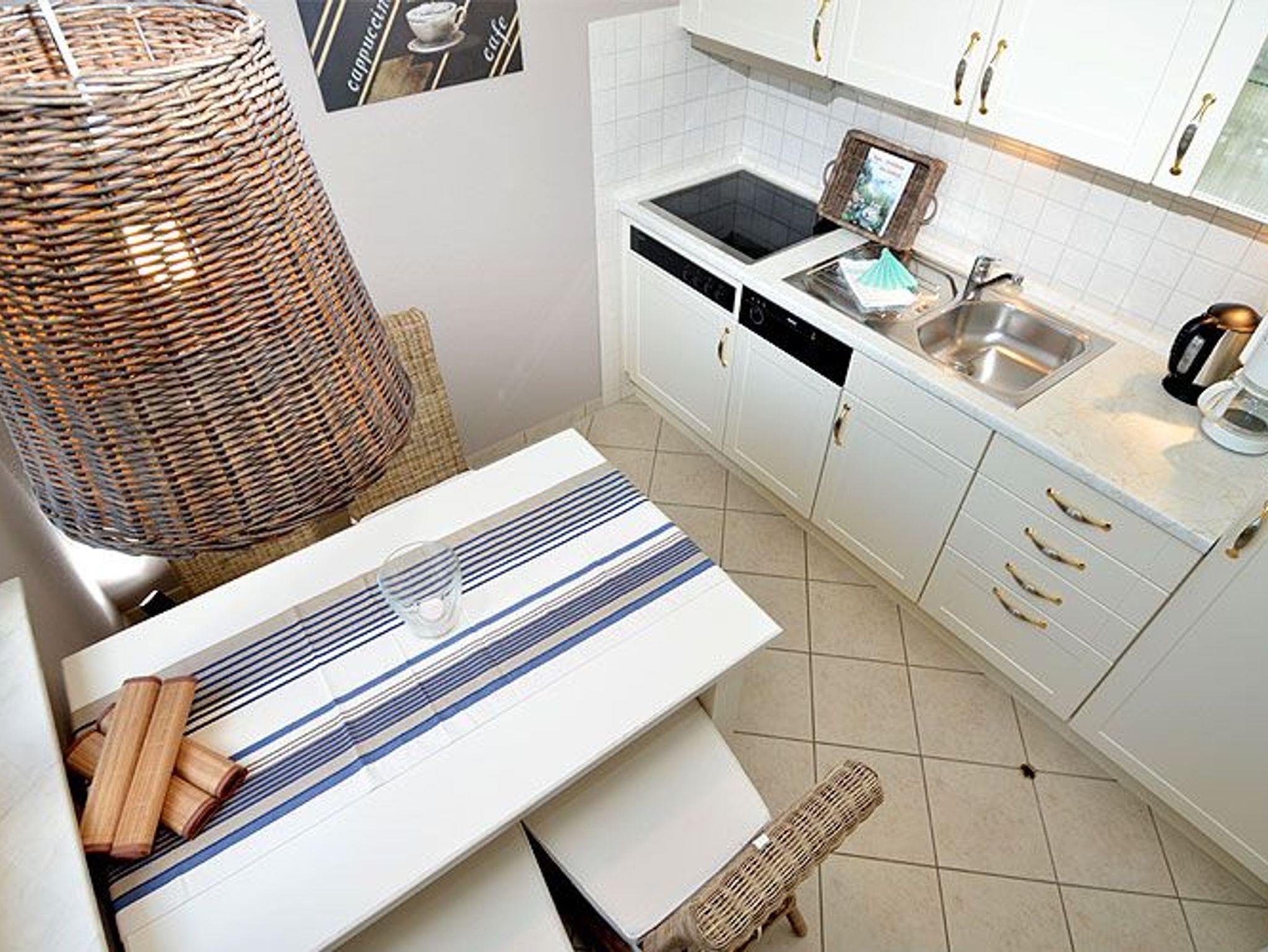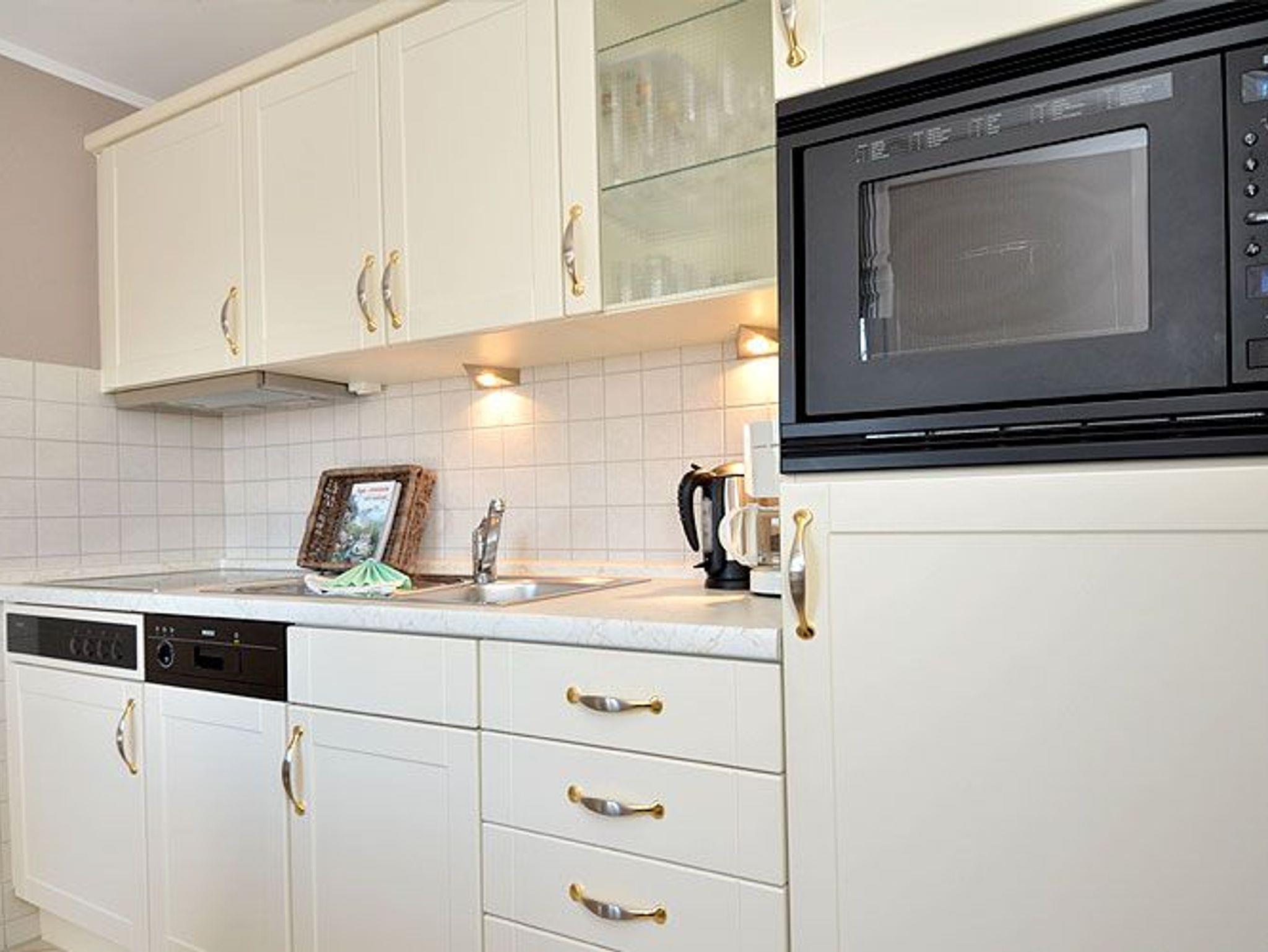 Die separate Küche mit einem Esstisch für 4 Personen lässt keine Wünsche offen. In dieser finden Sie einen Kühlschrank mit Gefrierfach, ein 4-Platten-Ceranfeld, eine Spülmaschine, eine Mikrowelle mit Grillfunktion und diverses Kleininventar, das die Küchenausstattung komplettiert.