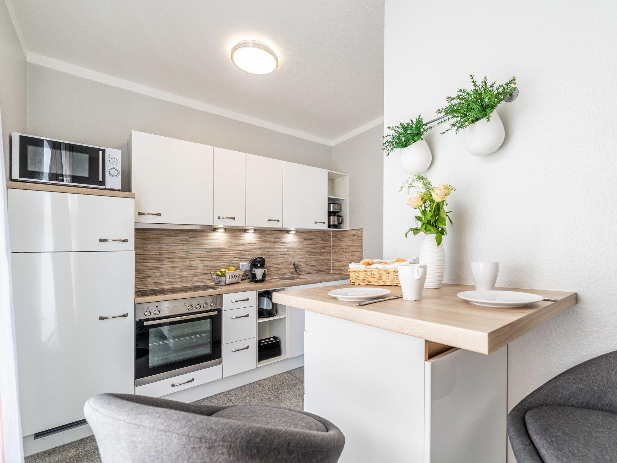 • komplett eingerichtete Küche mit Geschirrspüler, Mikrowelle, Backofen, Essplatz, Wäscheständer