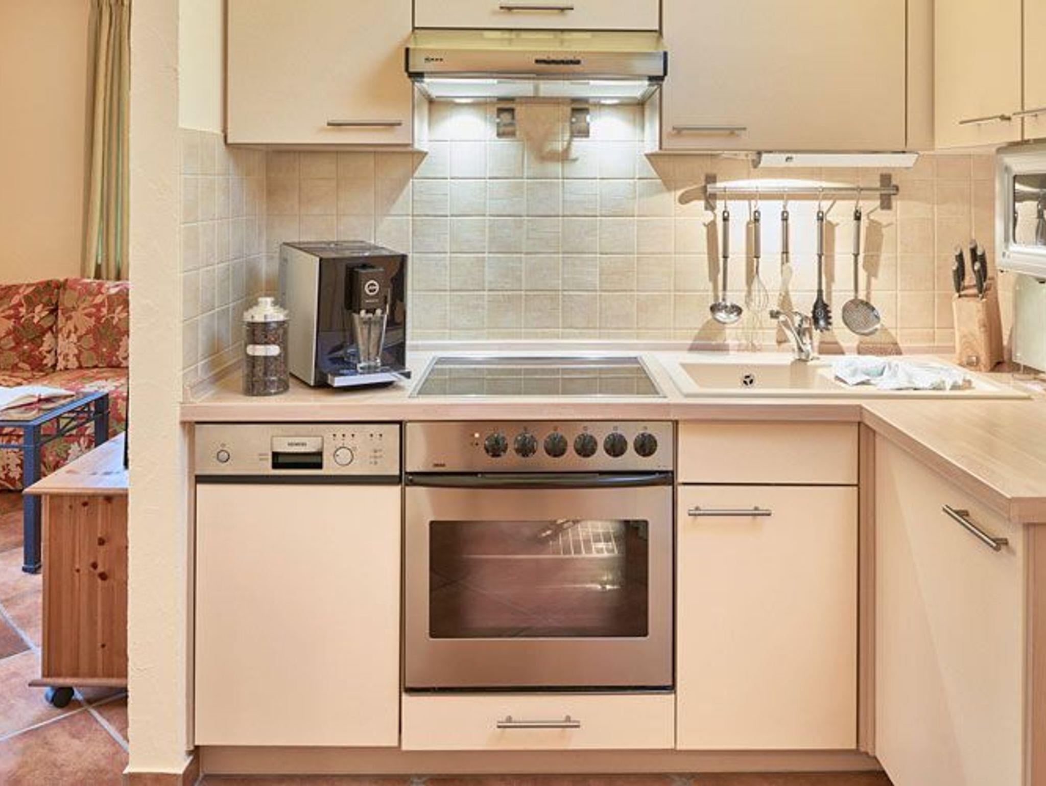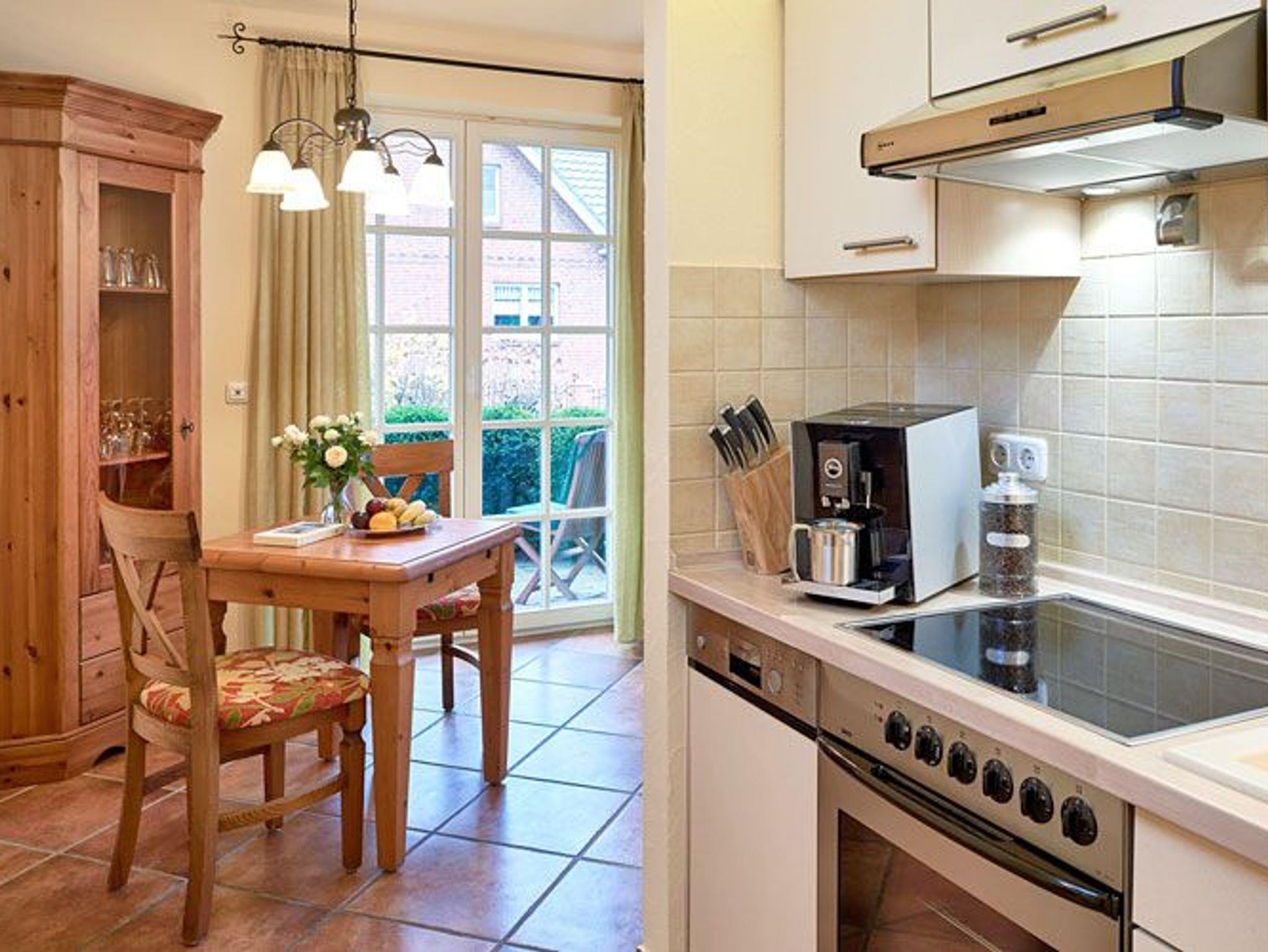 Ebenfalls ist ein Esstisch für zwei Personen vorhanden und die im Wohnraum integrierte und sehr gut ausgestattete Küchenzeile verfügt über einen Backofen, ein 4-Platten-Ceranfeld, eine Mikrowelle, eine Spülmaschine sowie einen Jura-Kaffeeautomaten (inkl. Kaffee satt).