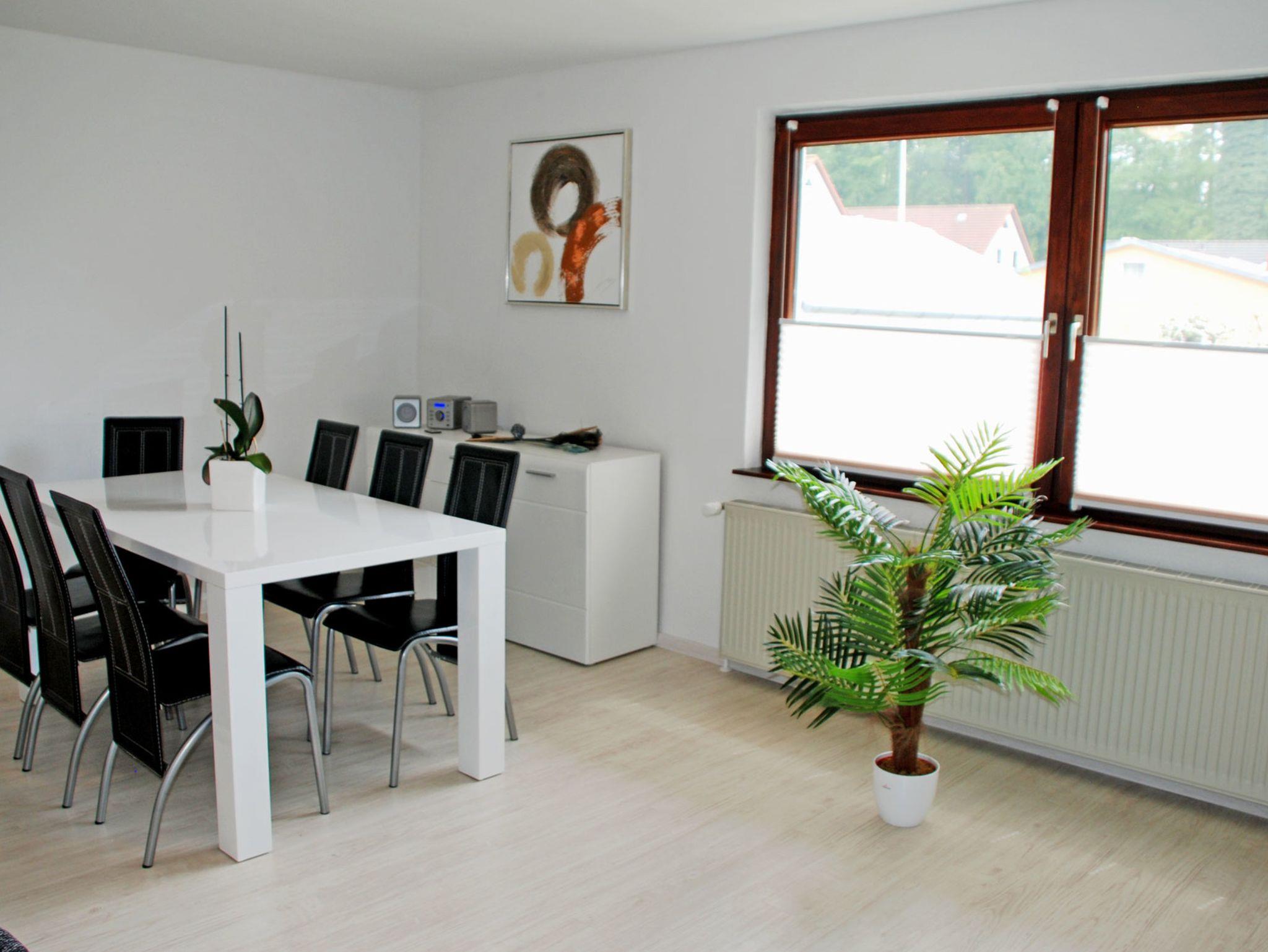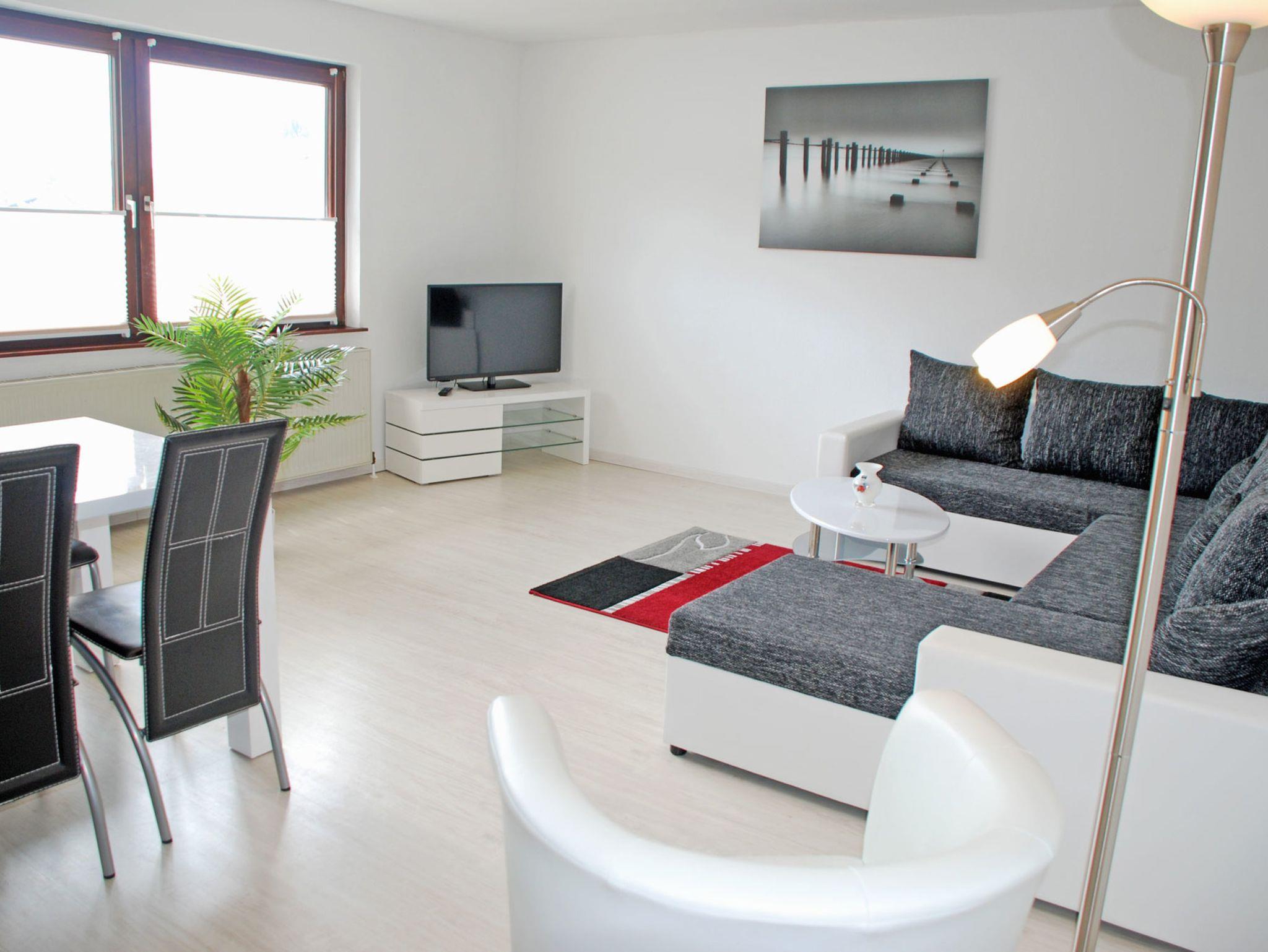 Dieses modern eingerichtete Ferienhaus befindet sich auf einem Gartengrundstück und bietet auf 113 qm großzügig Platz für max. 8 Erwachsene und hat Internet - WLAN. Über eine Treppe und die Terrasse gelangen Sie in den Flur. Im großen, hellen Wohnzimmer stehen eine bequeme Polstersitzgruppe mit Tisch und Sesseln und ein Schrank mit Flachbild - TV - Gerät. Hier steht auch ein Esstisch mit Stühlen.