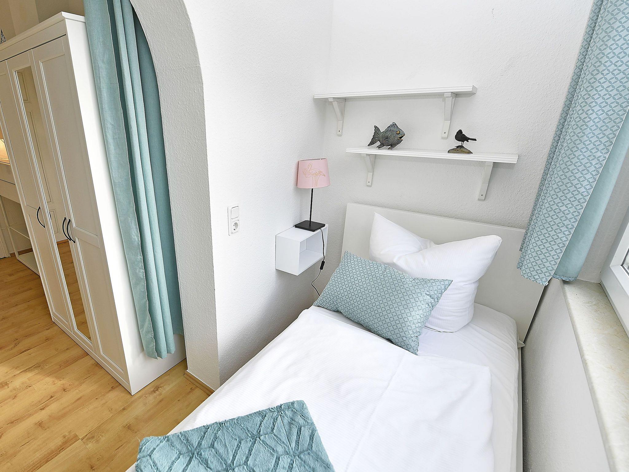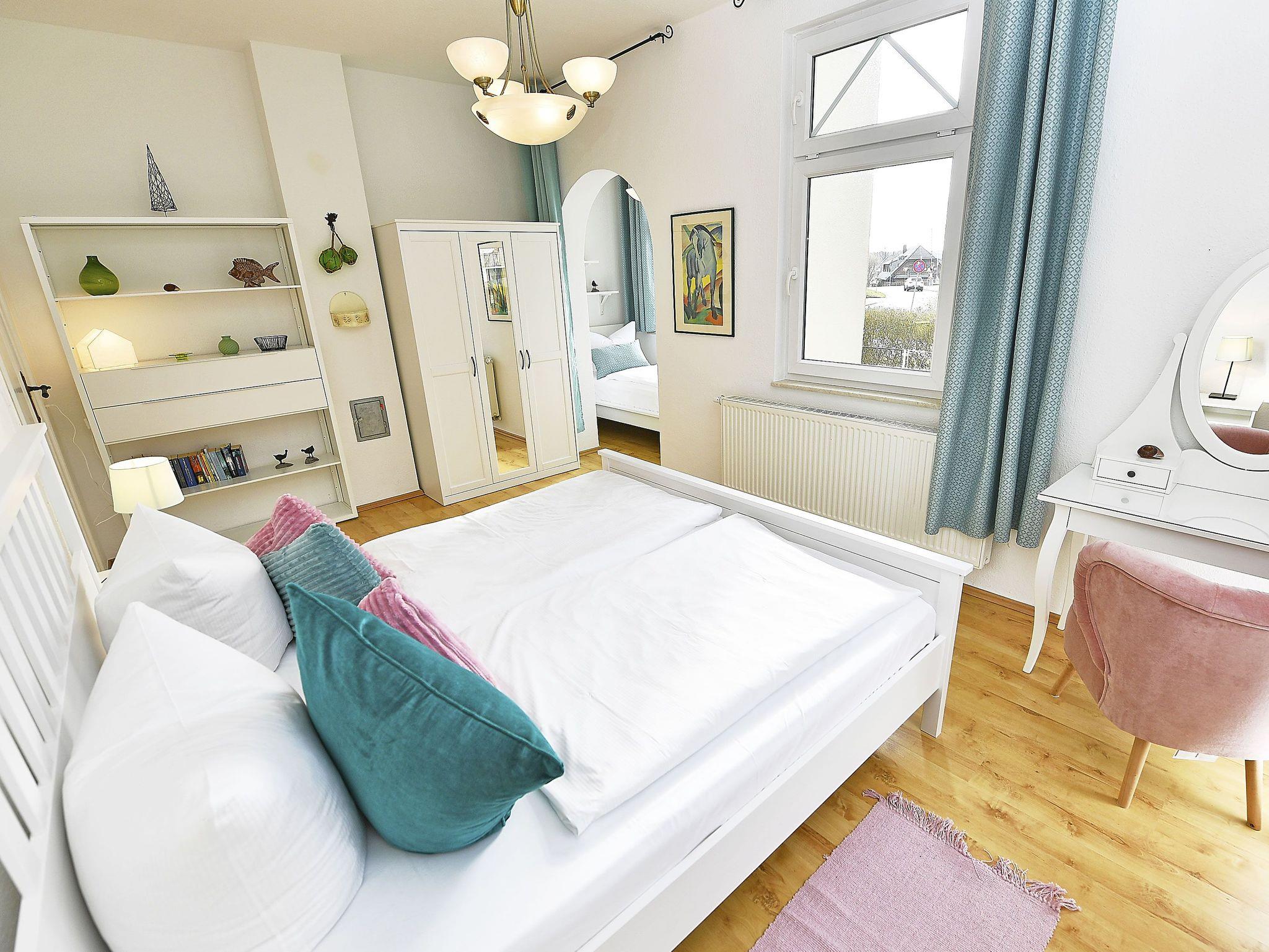 Eines der Schlafzimmer verfügt über ein Doppelbett, ausreichend Platz für Ihre Urlaubsgarderobe und ebenfalls einen Durchgang zur verglasten Loggia. Das zweite Schlafzimmer verfügt über ein Doppelbett und ist verbunden mit dem Turm des Hauses, in dem ein Einzelbett steht.