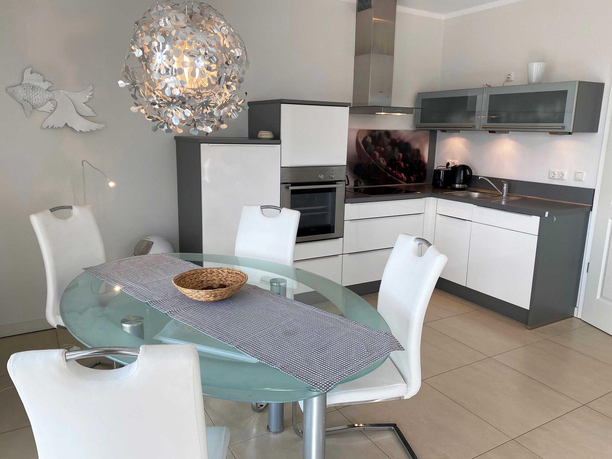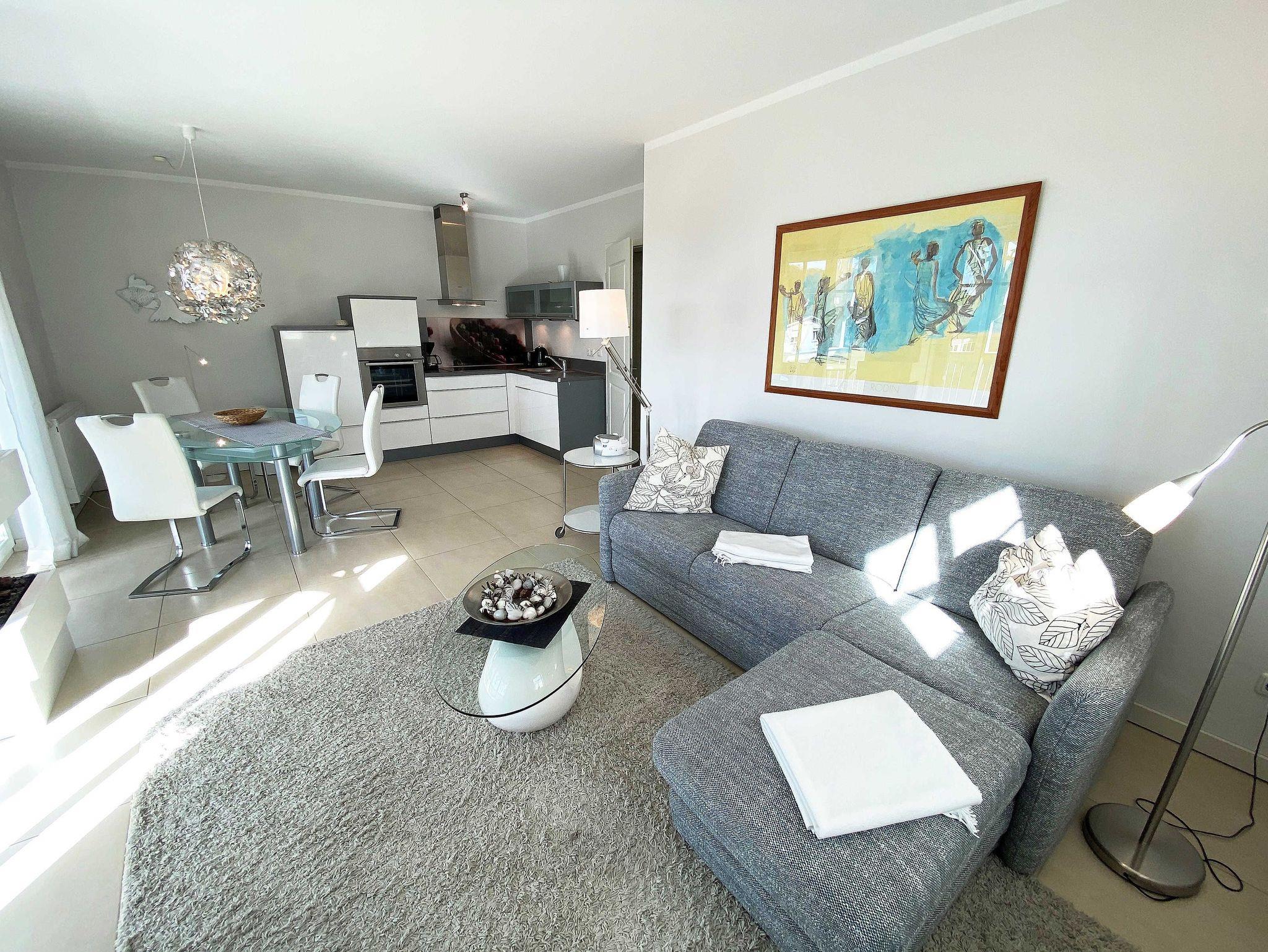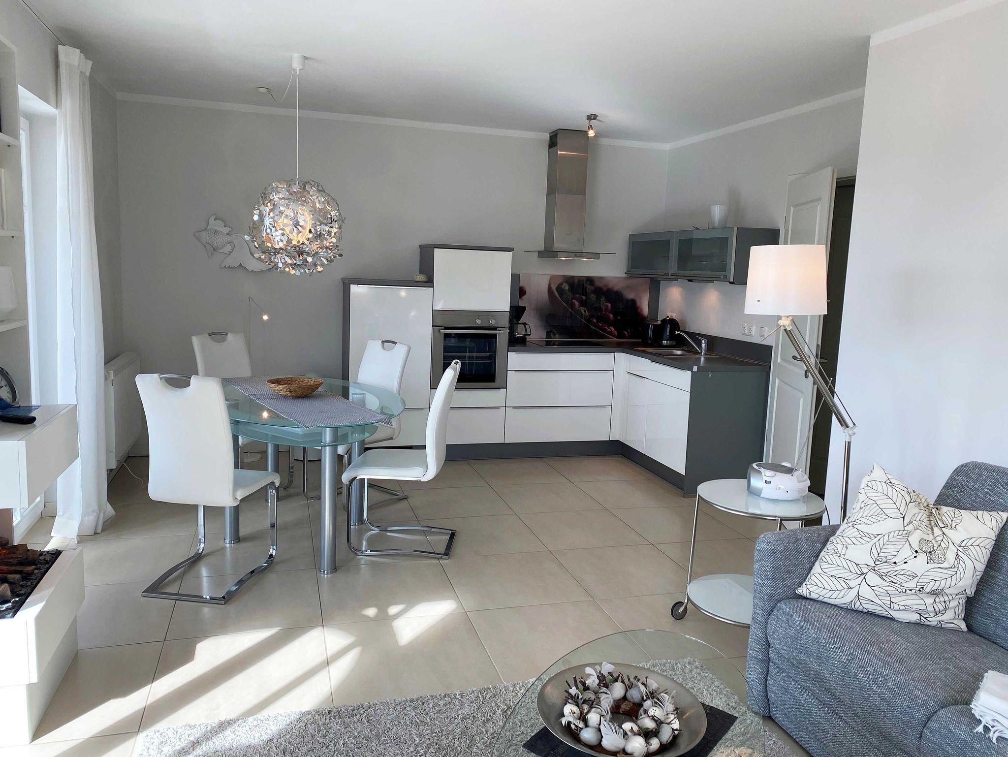 Die helle Nichtraucherwohnung mit Fliesenboden und Teppich in den Schlafzimmern ist geschmackvoll eingerichtet. Mit Ihren ca. 66qm bietet Sie ausreichend Platz für max. 2 bis 4 Personen. Die harmonisch integrierte Küchenzeile erlaubt mit einer Heißluft-Mikrowelle und Grill in Kombination, Ceran-Kochfeld, Backofen, Spülmaschine, Kühlschrank mit Gefrierfach, Wasserkocher, Toaster, Kaffeemaschine, Senseo Pad-Maschine, Kaffeeautomat und anderen praktischen Helfern die weitreichende Umsetzung Ihrer kulinarischen Wünsche. Angrenzend befindet sich ein bequemer Esstisch. Die beiden Schlafzimmer sind mit bequemen Betten (je 1,80 m x 2,00 m), verstellbare Lattenroste und reichlich Schrankfläche ausgestattet. Der Wohnbereich wird mit einer Couch, ein Sessel, ein Couchtisch, Leselampe sowie einem Regal und TV-Board abgerundet. Ein Smart-TV im Wohnzimmer und in einem der Schlafzimmer sowie DVD-Player, Musikanlage mit DAB-Radio, Gesellschaftsspiele und eine kleine Bücherauswahl sorgen neben einem kostenlosen WLAN-Anschluss für Ihre Unterhaltung. Ein Elektrokamin im Wohnbereich lädt bei etwas schlechterem Wetter zum Verweilen ein und sorgt für die perfekte Illusion eines realen Feuers. Das großzügige Bad mit Fußbodenheizung, WC, Fön, Kosmetikspiegel, Badhocker, Waschplatz und ebenerdiger Regendusche verspricht den erholsamen Wellness-Effekt. In dem vorhandenen Abstellraum befindet sich eine Waschmaschine zur freien Nutzung. Zusätzlich befinden sich hier Reinigungsutensilien, ein Bügelbrett sowie ein Bügeleisen. Für unsere kleinen Gäste steht ein Hochstuhl inklusive zur Verfügung. Ihre Fahrräder und Strandutensilien lassen sich in einem abschließbaren Schuppen neben Ihrem PKW-Stellplatz (Nr.03) unterbringen. Haustiere sind nicht erlaubt. Die Erstausstattung eines Wäschepaketes (komplette Bettwäsche, 1 Duschhandtuch, 1 kleines Handtuch) können Sie bis 14 Tage vor Anreise gegen einen Aufpreis dazu buchen oder durch eigene ergänzen. Ab 2 gebuchten Paketen erhalten Sie einmalig 1 Geschirrhandtuch und 1 Duschvorleger dazu.