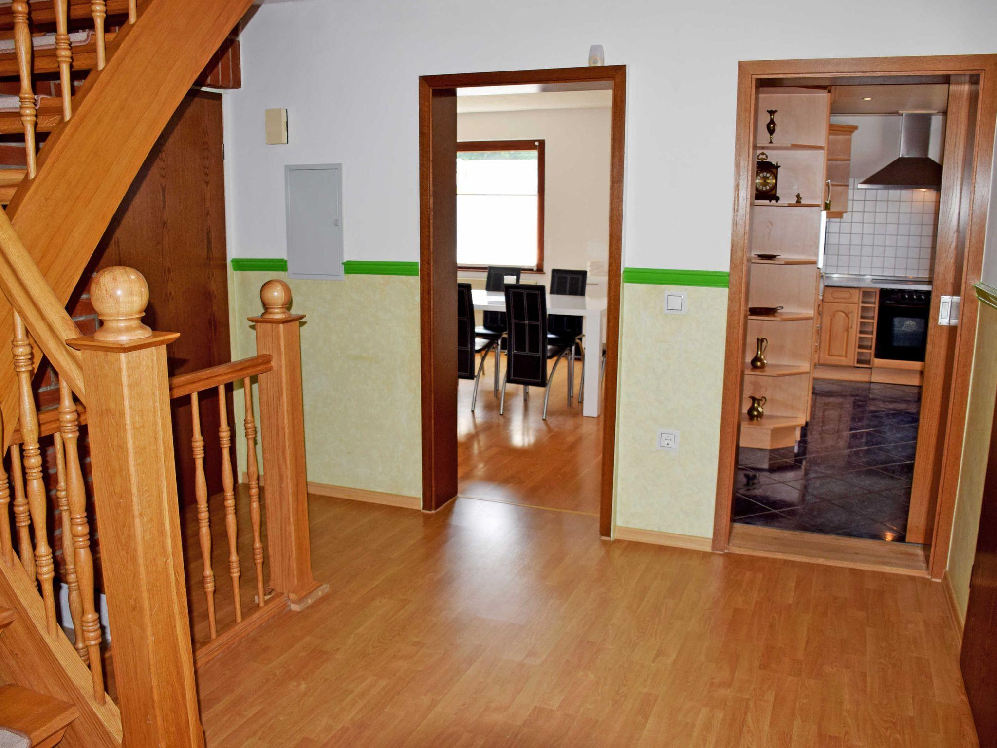 Dieses modern eingerichtete Ferienhaus befindet sich auf einem Gartengrundstück und bietet auf 113 qm großzügig Platz für max. 8 Erwachsene und hat Internet - WLAN. Über eine Treppe und die Terrasse gelangen Sie in den Flur. Im großen, hellen Wohnzimmer stehen eine bequeme Polstersitzgruppe mit Tisch und Sesseln und ein Schrank mit Flachbild - TV - Gerät. Hier steht auch ein Esstisch mit Stühlen.