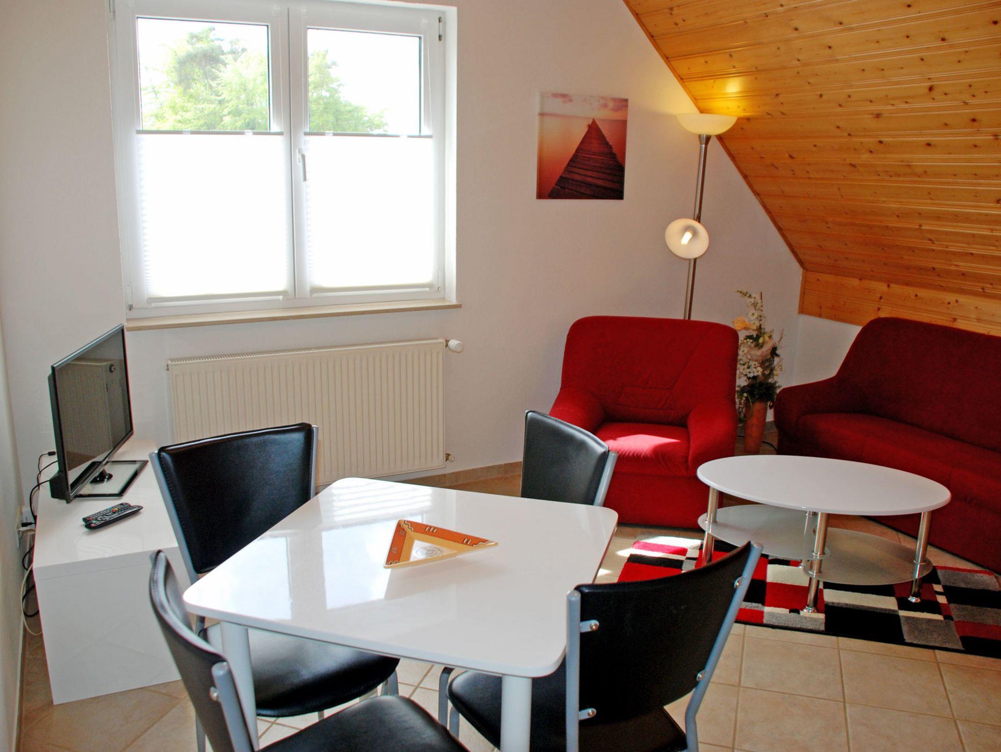 Diese modern eingerichtete Ferienwohnung liegt im Obergeschoss und bietet auf 42 qm Platz für max. 4 Gäste und hat Internet WLAN. Über den separaten Eingang in Hausflur gelangen Sie in den Flur mit Garderobe und Kleiderschrank. Im gemütlichen Wohnzimmer stehen eine Polstersitzgruppe mit Tisch und Sesseln und ein Schrank mit TV - Gerät. Hier steht auch ein Esstisch mit Stühlen. Im ersten Schlafzimmer stehen ein bequemes Doppelbett (durchgehende Matratze) mit Nachttischen und Leselampen sowie ein Kleiderschrank. Über eine Holztreppe im Wohnbereich gelangt man in den ausgebauten Dachboden, hier stehen zwei Einzelbetten mit Leselampen und zwei kleine Schränke.