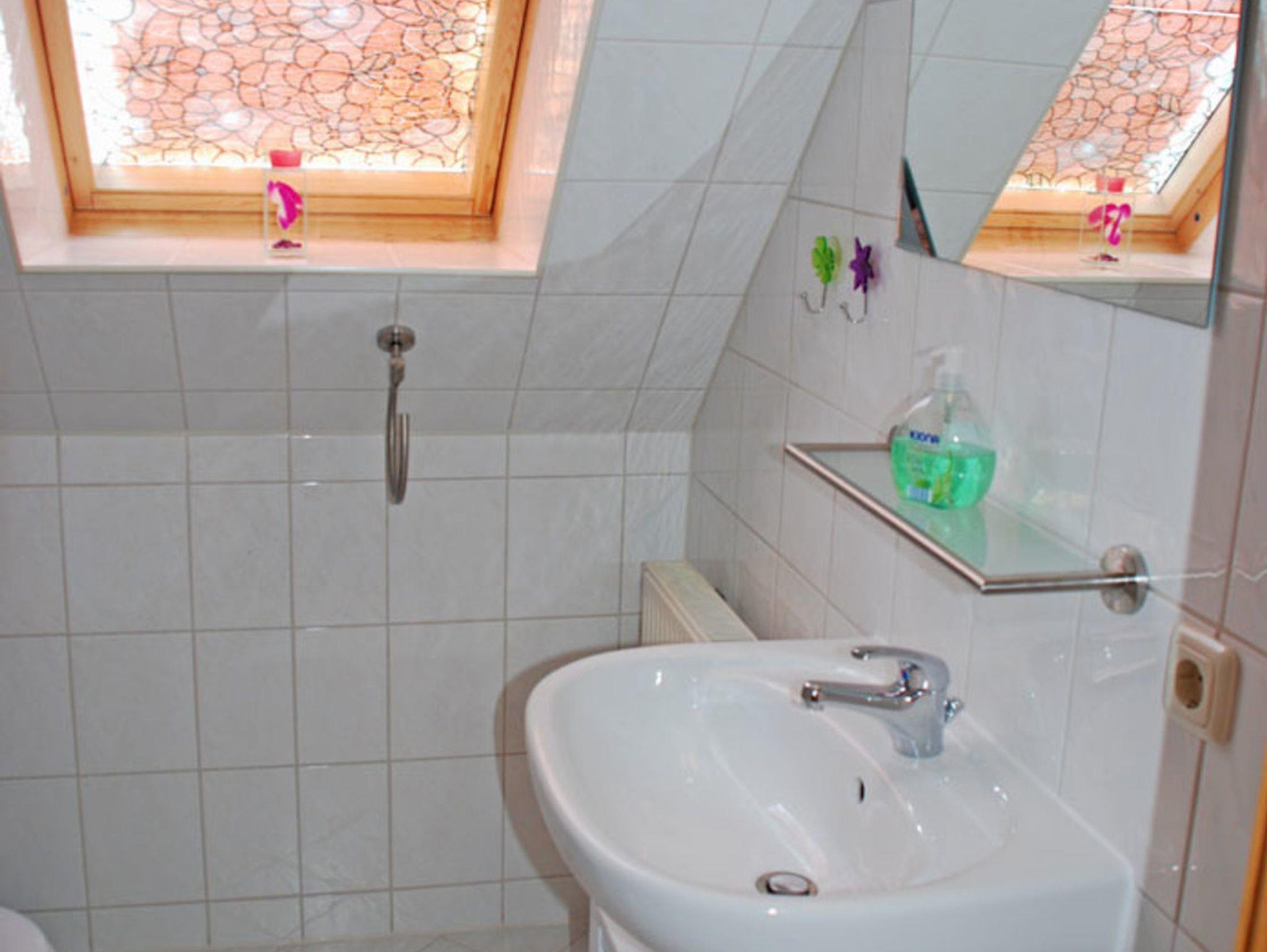 Das Bad mit Fenster ist mit Dusche, WC und Waschtisch ausgestattet. Neben dem Haus können in einem großen Garten ein Pavillon mit Gartenmöbeln und ein Grill mitgenutzt werden.