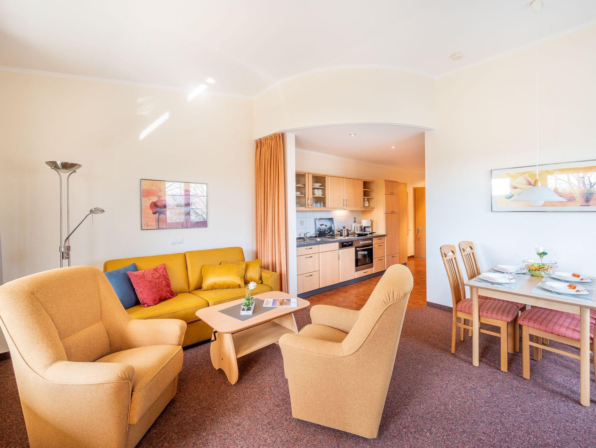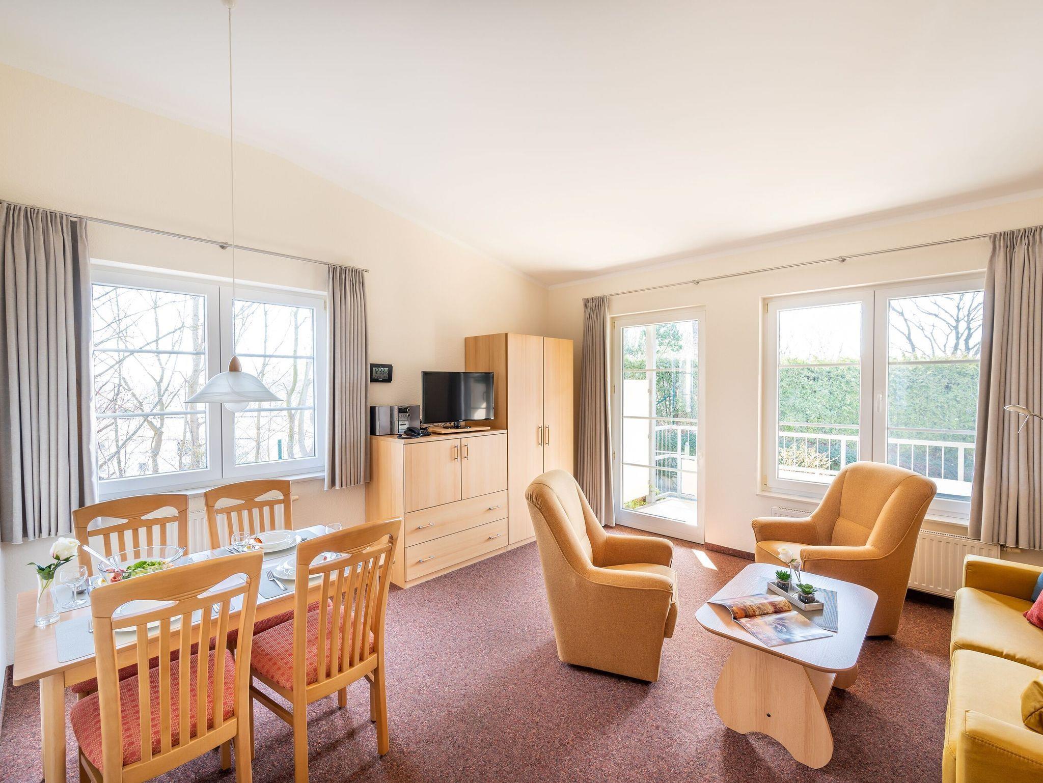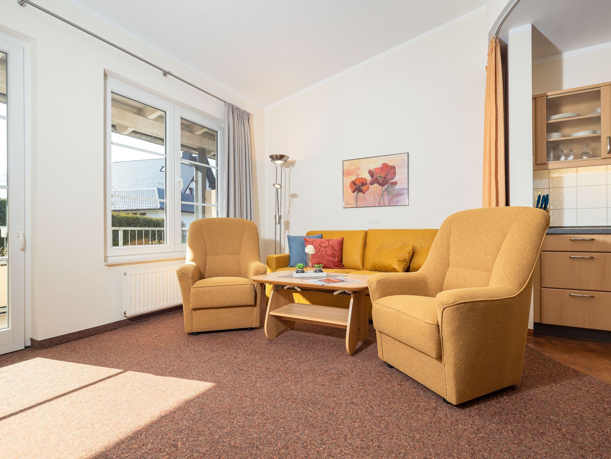 Das helle Wohnzimmer verfügt über eine Couchgarnitur, welche ebenso eine Aufbettung für 2 weitere Personen darstellt. Neben einem TV und einem kostenfreien WLAN-Zugang erreichen Sie von hier aus den sonnigen Balkon inkl. Balkonmöbel.