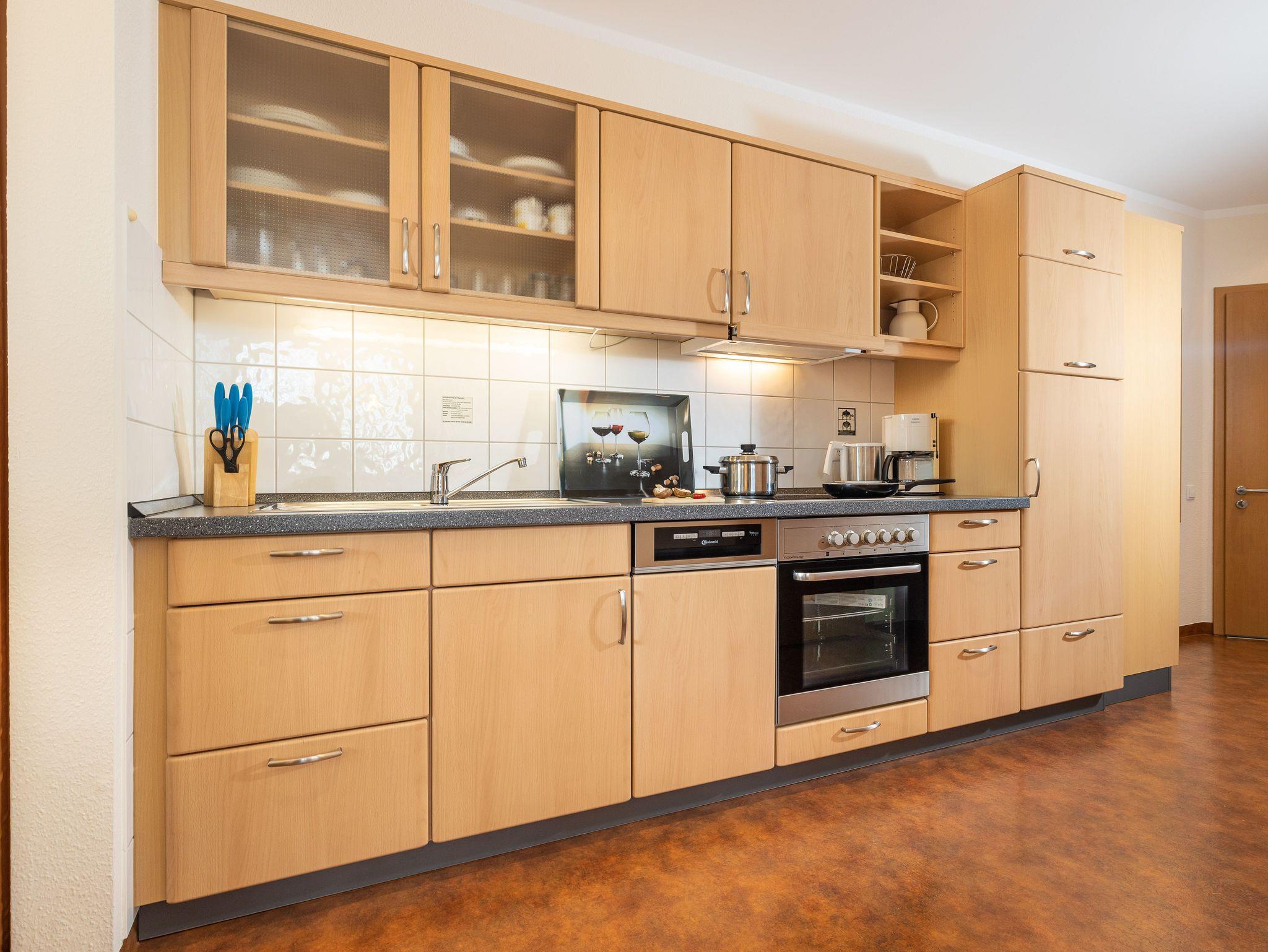 Die Küchenzeile ist mit einem Kühlschrank, einem Ceranfeld mit Backofen, einer Spülmaschine und einer Mikrowelle ausgestattet. Ebenso finden sich hier alle nötigen Küchen-Kleingeräte (Wasserkocher, Kaffeemaschine, Toaster..).