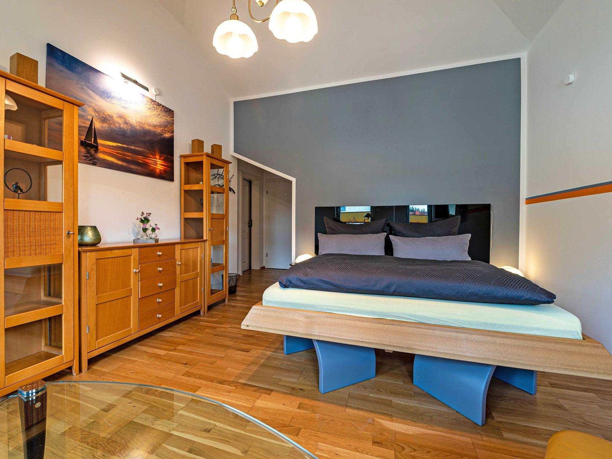Vom Schlafzimmer aus gelangt man über ein Ankleidezimmer ins Badezimmer. Zwei weitere Schlafräume ergänzen das Übernachtungsangebot. Im Turm-Schlafzimmer gibt es ein Doppelbett mit durchgehender Matratze (1,80m x 2,00m), das zweite Schlafzimmer hat ein Doppelbett mit einzelnen Matratzen (0,90m x 2,00m) und im Gästezimmer gibt es ein Bett in der Größe 1,40m x 2,00m.
