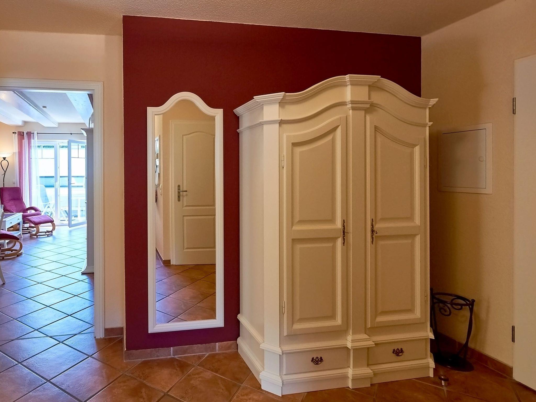 Dieses gut 65 qm große 2-Raum-Appartement begrüßt Sie im Dachgeschoss des Hauses und ist geschmackvoll [&] romantisch mit weißen Landhausmöbeln eingerichtet.