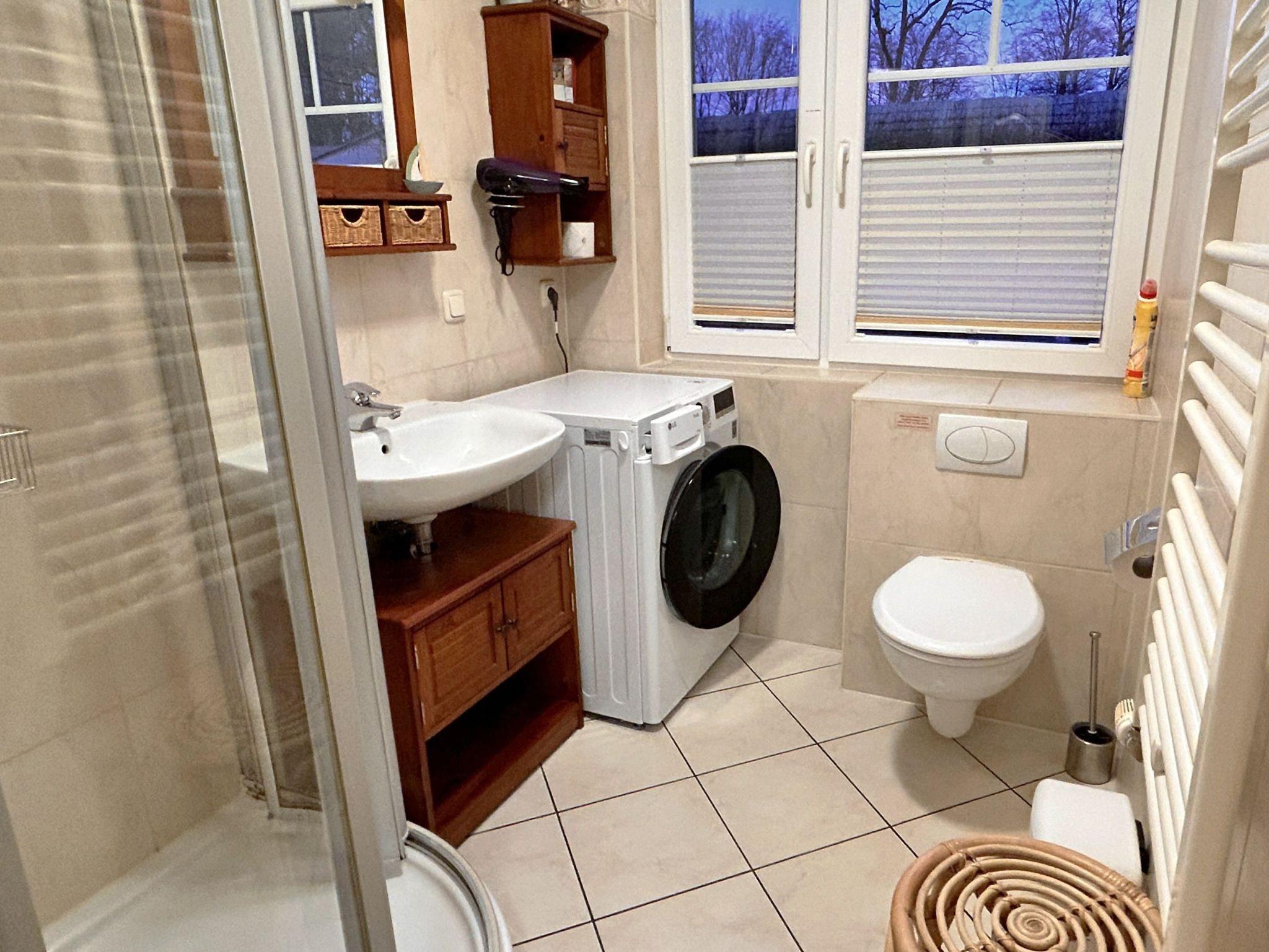 Das elegant geflieste Tageslichtbad überzeugt mit Dusche/WC, Waschtisch, beheizbarem Handtuchtrockner und Fön. Sogar ein Waschtrockner zur kostenfreien Nutzung steht hier zur Verfügung.